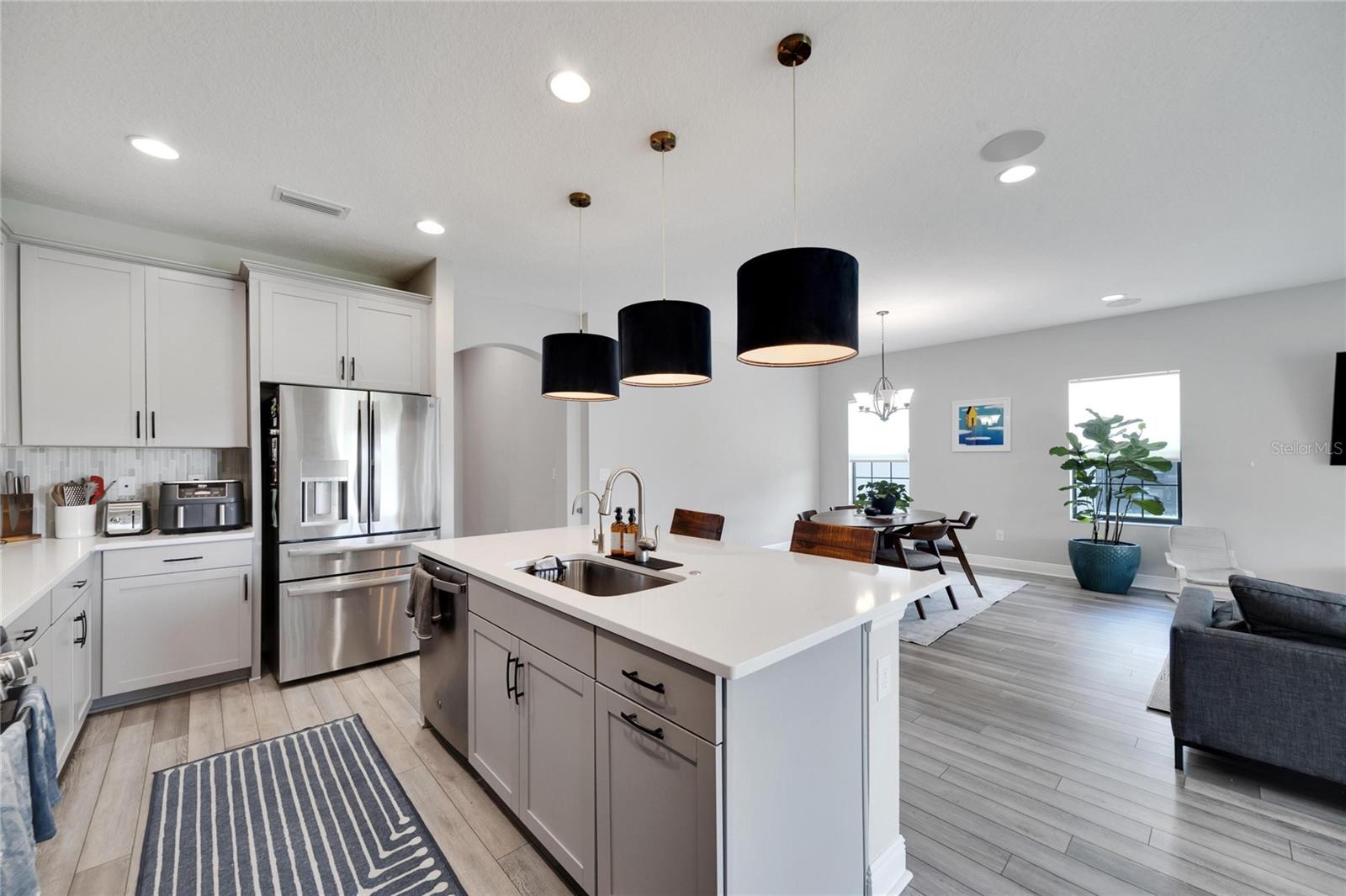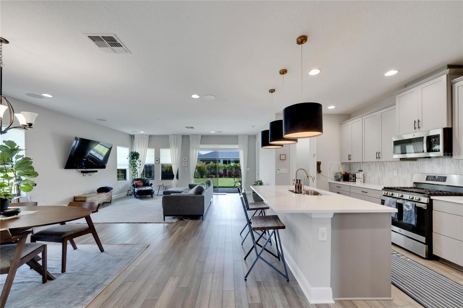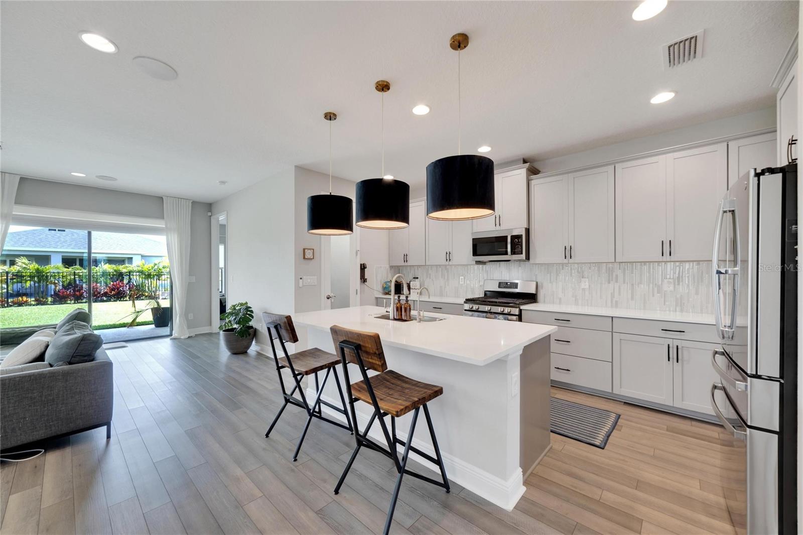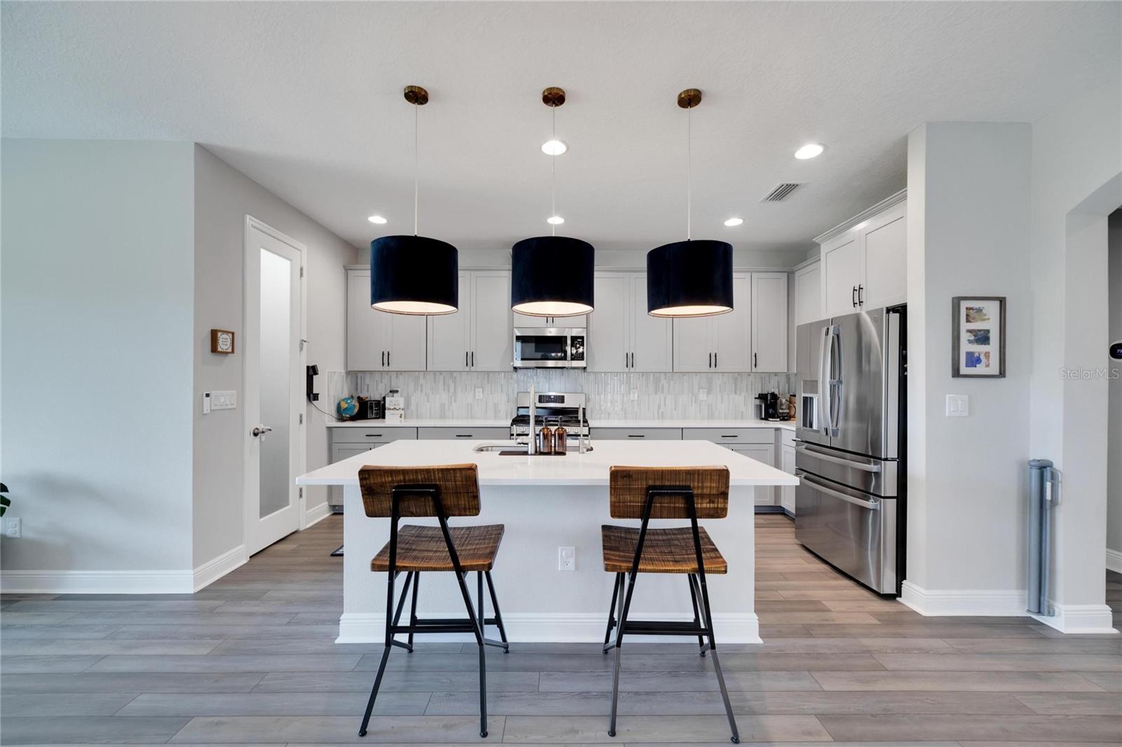 Se você está procurando uma impressionante casa térrea de 4 quartos, quase nova, em Waterset, você encontrou! Ao entrar, você vai adorar imediatamente os tetos altos e o lindo piso de pranchas de vinil cinza, aumentando a sensação de luz e arejamento em toda a área de estar. Esta casa construída em 2021 apresenta uma planta dividida para maior privacidade com 2 quartos de hóspedes e o 2º banheiro completo na frente da casa. À medida que você continua pelo hall de entrada, você encontra um corredor para o terceiro quarto de hóspedes e lavanderia à direita antes de entrar na grande sala de conceito aberto com uma linda cozinha, ampla sala de jantar e sala de estar com porta de correr de acesso à parte traseira coberta. varanda e quintal. Esta cozinha é exatamente onde você deseja cozinhar e se divertir com um lindo backsplash de azulejos, bancadas de quartzo e um fogão a gás. Fora da sala você encontra a suíte principal com um quarto enorme, 2 closets e um fabuloso banheiro privativo com pia dividida e grande chuveiro de azulejos. Você não apenas obtém o benefício de esta casa ter apenas alguns anos de idade, mas também pode desfrutar de todos os extras que o vendedor adicionou, incluindo uma persiana romana motorizada sobre a porta traseira deslizante, amaciante de água para toda a casa e sistema de osmose reversa para a pia da cozinha e geladeira, calhas externas, sistema de segurança Ring e luminárias pendentes sobre a ilha da cozinha. Esta é realmente uma casa para a qual você se muda e imediatamente se sente em casa. Esta linda casa e varanda nos fundos não são apenas incríveis para aproveitar o clima ensolarado da Flórida, mas você também tem acesso às comodidades em estilo resort que solidificam Waterset como a principal comunidade do norte de Apollo Beach. Prepare-se para aproveitar as piscinas comunitárias, a academia, as quadras de tênis, o splash pad, o parque para cães e muito mais, tornando mais fácil nem sair do bairro para se divertir. Para quem deseja visitar o centro de Tampa, as praias do Golfo ou a Disney em Orlando, você tem acesso à I-75 a partir de Big Bend para aproveitar tudo o que Tampa Bay tem a oferecer! Você não quer perder esta. Comece a fazer as malas, você encontrou sua próxima casa!
