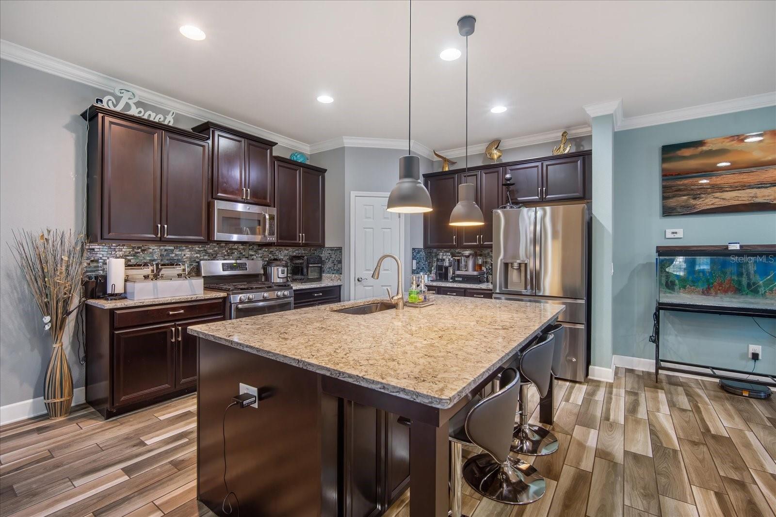 Bem-vindo à casa dos seus sonhos em um cobiçado terreno de esquina na desejável comunidade de Waterset! Esta casa lindamente atualizada de 4 quartos e 3 banheiros oferece uma combinação perfeita de estilo, conforto e funcionalidade. O primeiro andar possui um quarto conveniente e banheiro completo, ideal para hóspedes ou residências multigeracionais. O coração da casa é a grande sala iluminada e aberta, onde a vida e o entretenimento se unem sem esforço. O piso de cerâmica com aspecto de madeira acrescenta um toque de elegância e durabilidade, realçando a estética moderna da casa. A cozinha atualizada é uma delícia para o chef, ostentando impressionantes bancadas de granito, armários de 42”, uma espaçosa ilha central com assentos e um elegante backsplash de azulejos de vidro. Com fogão a gás natural e eletrodomésticos em aço inox, esta cozinha é tão funcional quanto bonita. Adjacente à cozinha, uma ampla área de jantar oferece o espaço perfeito para refeições e reuniões familiares. No andar de cima, todo o segundo andar foi recentemente remodelado com piso laminado elegante – sem carpete à vista! A ampla suíte do proprietário é um verdadeiro retiro, completa com banheiro master privativo com pias duplas, box amplo, banheira de jardim e um amplo closet. Os quartos 2 e 3 são de tamanho generoso e compartilham um banheiro jack-and-jill bem equipado com combinação de chuveiro/banheira. Para maior comodidade, a lavanderia está localizada no segundo andar. Do lado de fora, a varanda estendida oferece amplo espaço para viver ao ar livre, seja para jantar ao ar livre, relaxar ou grelhar. O quintal é amplo e verde, com muito espaço para adicionar uma piscina se desejar. Waterset em Apollo Beach oferece uma infinidade de comodidades, desde mais de 19 quilômetros de trilhas verdes e parques para cães até piscinas em estilo resort, academia, quadras e campos esportivos e eventos comunitários durante todo o ano. Com sua localização privilegiada perto de lojas, rodovias, escolas e instalações recreativas, esta casa simboliza a vida luxuosa e conveniente na Flórida. Esta casa realmente oferece o melhor da vida em Waterset, combinando atualizações luxuosas com design atencioso e amplo espaço por dentro e por fora. Não perca a oportunidade de fazer deste excepcional imóvel o seu novo lar doce lar!