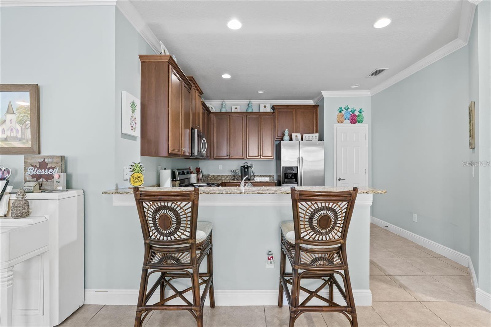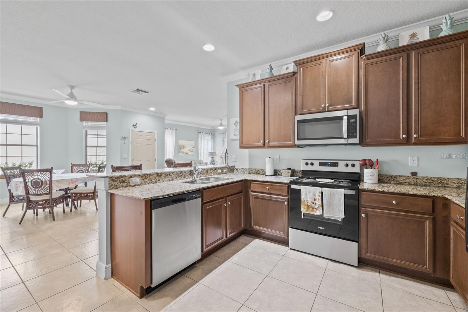 Sob ofertas de backup que aceitam contratos. Descubra esta encantadora vila de 2 quartos e 2 banheiros com uma garagem de 2 carros, localizada na pacífica comunidade fechada de Southshore Falls por Del Webb! Este modelo Everglades delicioso oferece um piso plano aberto e brilhante, com pisos de ladrilhos em toda a maior parte da casa (vinil de luxo nos quartos), proporcionando uma atmosfera leve e arejada e muita privacidade sem vizinhos traseiros. Recentemente atualizado por dentro e por fora, a casa apresenta tratamentos de janelas, persianas e molduras elegantes da coroa que complementam a grande sala, cozinha e áreas de jantar. The kitchen is a true highlight, featuring a breakfast bar, 42" wood cabinetry, stainless steel appliances, a closet pantry, and beautiful granite countertops. Ideal for entertaining, the spacious great room opens seamlessly to the screened lanai through sliding glass doors. The private primary suite includes his-and-her closets and a luxurious en-suite bath with dual sinks and a large walk-in shower. Guests will enjoy their own space with a Layout de quartos, enquanto a sala de utilitário interna com lavadora e secadora aumenta a praticidade da casa. Casa excepcional - Coloque hoje para agendar sua exibição particular!