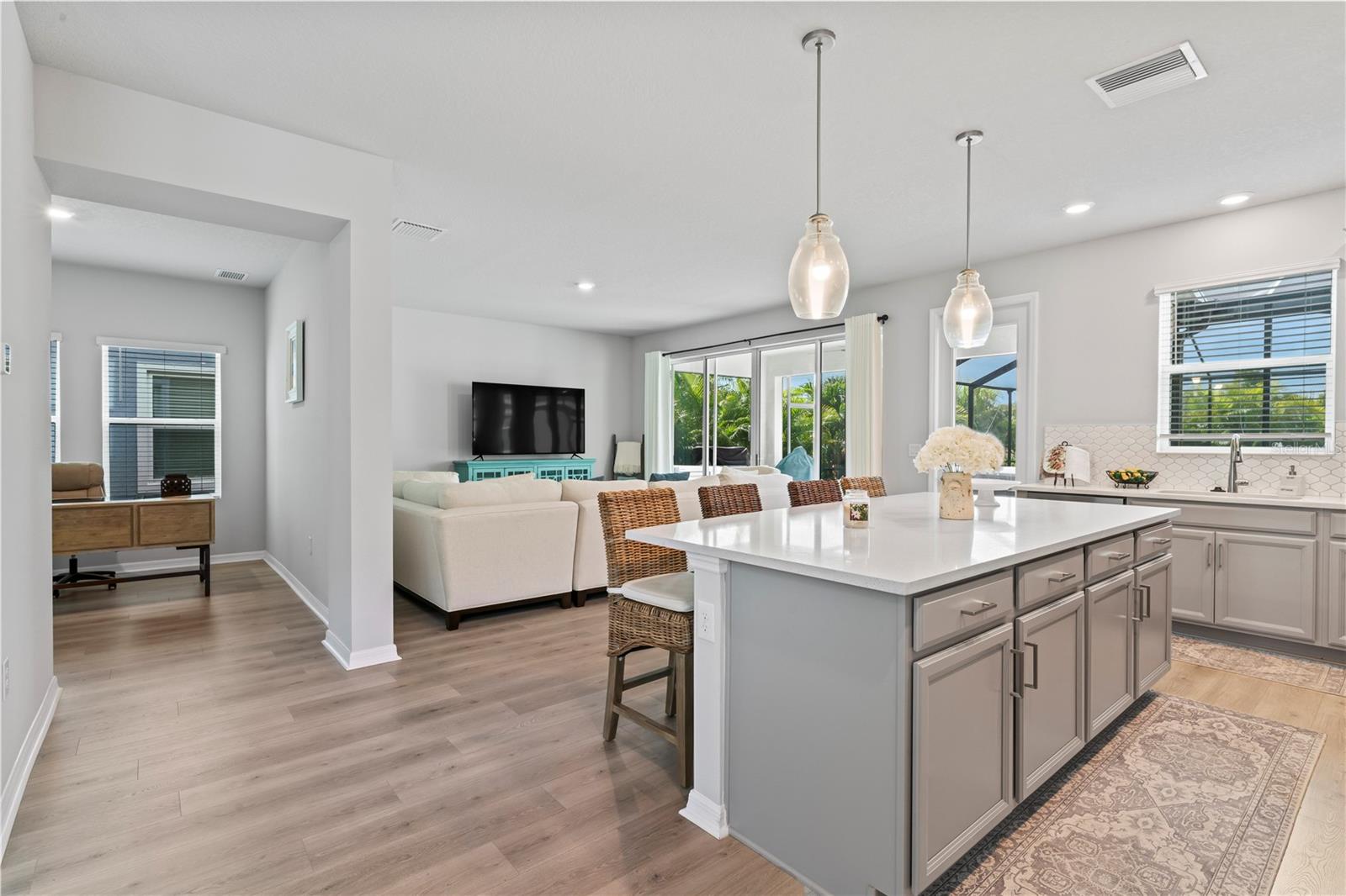 Preço reduzido para venda rápida !! Linda 4 quartos 2.5 Bath David Weekly Build Pool Home, localizado na comunidade de água de água procurada sem vizinhos de quintal. Enquanto você dirige para esta adorável casa de estilo artesão, você ficará impressionado com o incrível apelo do meio-fio da casa, com garagem pavimentada, entrada coberta e paisagismo tropical exuberante, com um gramado bem gerenciado. Entrando na casa pela porta de entrada de 8 pés com vidro decorativo, você notará imediatamente o quão meticulosamente mantinha esta casa, mostrando como uma casa modelo. O piso laminado premium que abrange as principais áreas de estar da casa complementa os acabamentos interiores de luxo ao longo desta linda casa. A cozinha gourmet possui utensílios de aço inoxidável, fogão a gás, forno embutido, backsplash decorativo com capuz de gama de grife e uma grande ilha de servir que cuida da espaçosa sala da família e área da piscina. O primeiro andar também oferece uma sala de estudo/ensino e meio banho. No andar de cima, você encontrará a generosa área de loft que contribui para uma excelente segunda área de TV ou sala de jogos. A luxuosa suíte de Mater também está localizada no segundo nível e possui um grande closet, pia de vaidade dupla com bancadas de quartzo, um espaçoso chuveiro. Como se essa propriedade não pudesse melhorar, agora seguimos para o impressionante espaço ao ar livre! Esta casa tem uma incrível área de piscina, oferecendo uma tonelada de espaço no convés da piscina, ideal para relaxar e absorver a FL quente. Sun, um grande lanai coberto para uma grande sombra e muito espaço para a grelha e o spa que também transmitirá com a casa. A comunidade Waterset oferece uma abundância de comodidades de primeira linha, como piscinas de estilo resort, cafés, clubes, instalações de exercícios, quadras esportivas e campos, parque de cães e trilhas para citar alguns! Ligue agora para agendar sua exibição particular hoje!