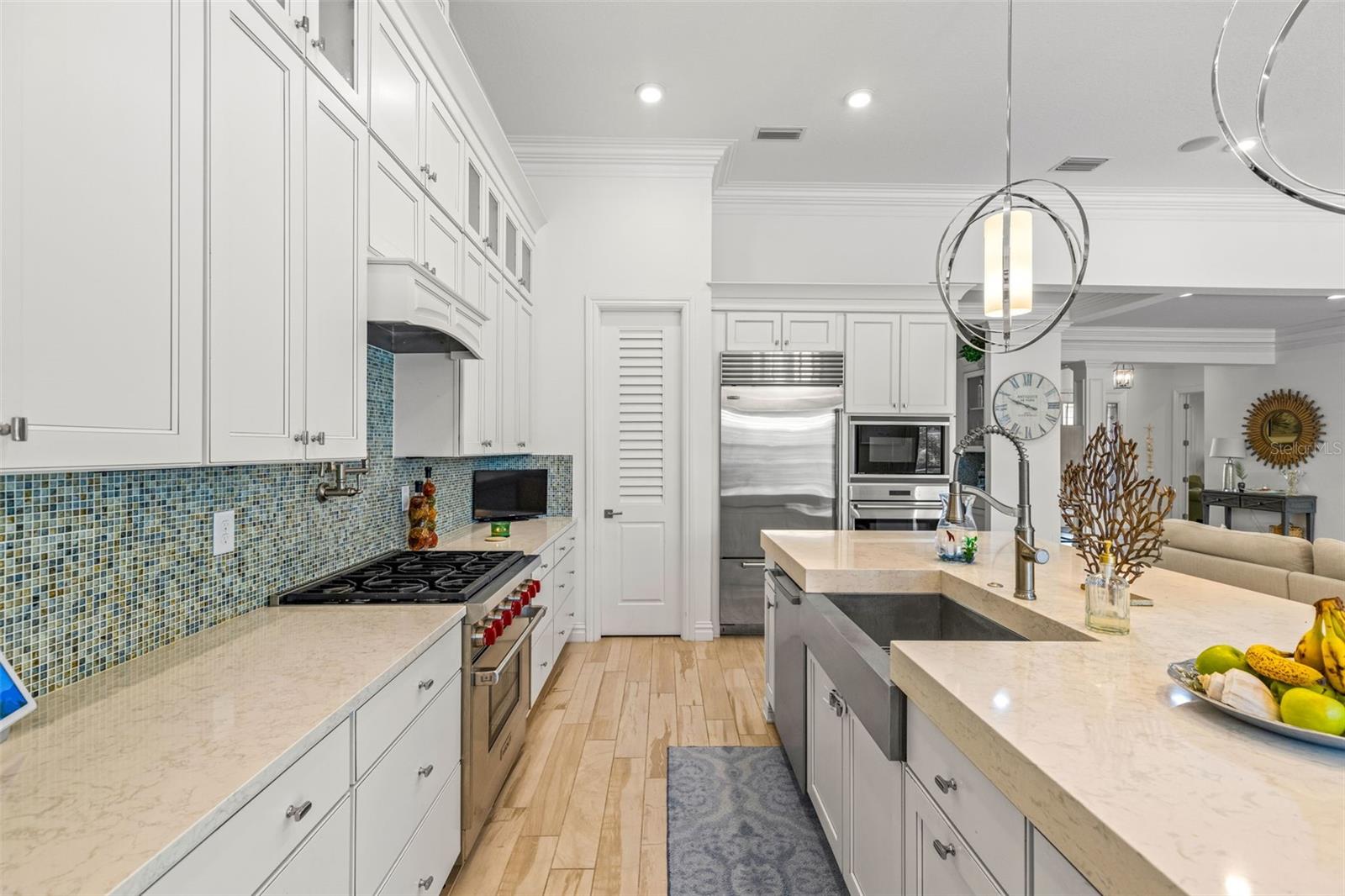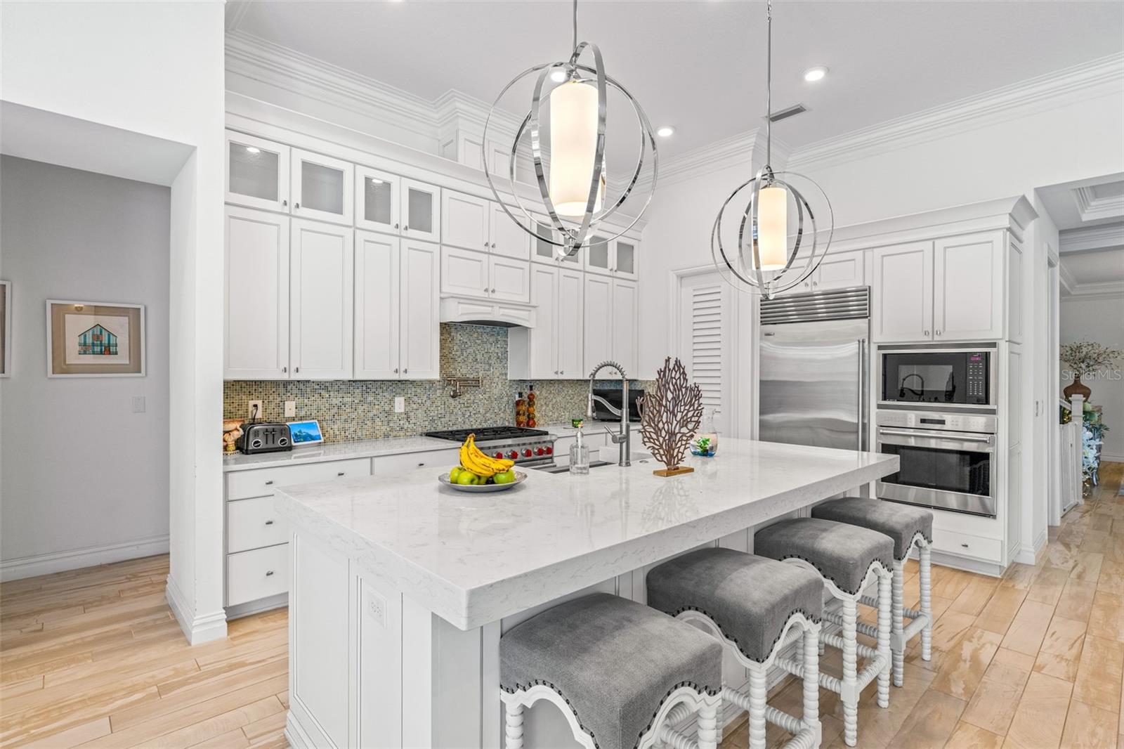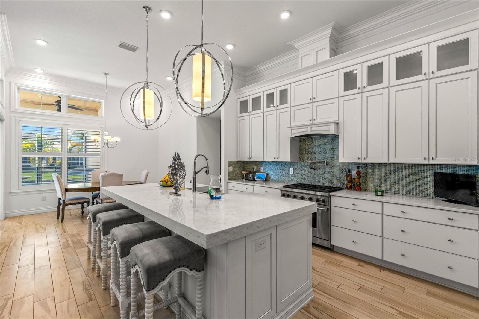 Experimente a verdadeira Florida que vive nesta casa costeira de Key West Style Waterfront, com uma vida interior requintada complementada por um oásis ao ar livre de quase 1.300 pés quadrados! A casa possui vistas de água de tirar o fôlego, com mais de 63 pés de orla, cercada por paisagismo exuberante e uma piscina de água salgada aquecida e exibida. A entrada da frente recebe você em um piso plano aberto, com grandes tetos e vistas imediatas da água. A cozinha do chef, centralizada em torno de uma ilha de quartzo de 3,5 cm, é adornada com uma pia da fazenda, preenchimento de panela embutido e eletrodomésticos de lobo de gás natural e eletrodomésticos. A sala de jantar formal é complementada por um bar molhado na cozinha. Cada centímetro da propriedade apresenta atualizações de luxo e atenção meticulosa aos detalhes, incluindo tetos de bandeja, lambris, moldagem por coroa, persianas de plantações personalizadas, som surround embutido. A suíte primária privada de primeiro nível possui uma área de estar aconchegante com vista para a água, armários duplos e um café. O privilégio possui uma banheira de imersão luxuosa, armário de água separado e um grande chuveiro equipado com um chuveiro de chuva, chuveiro de mão e 4 pulverizadores corporais. No andar de cima, você encontrará uma sala multiuso versátil para bilhar, jogos, teatro ou espaço de escritório adicional, juntamente com um quarto e banheiro completo. A expansiva cozinha de verão coberta permite diversão em todas as estações com fãs de teto, uma grelha a gás embutida, geladeira, pia e balcões de granito. As áreas de estar ao ar livre foram finalizadas com telhas e pavimentadoras de travertino, e os tetos, com um embutido de madeira de cipreste. A garagem anexa de três carros oferece amplo espaço para veículos e carrinhos de golfe!