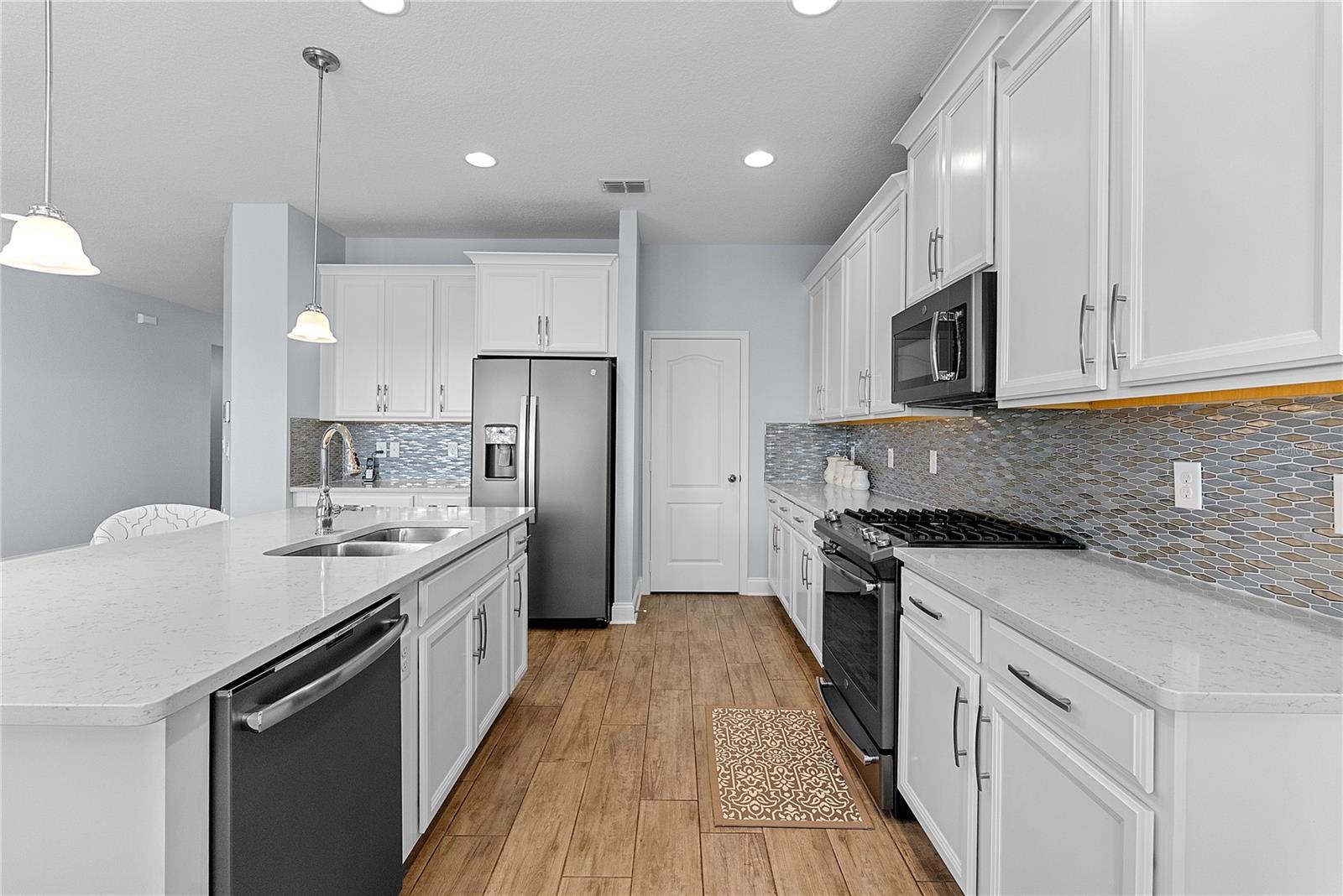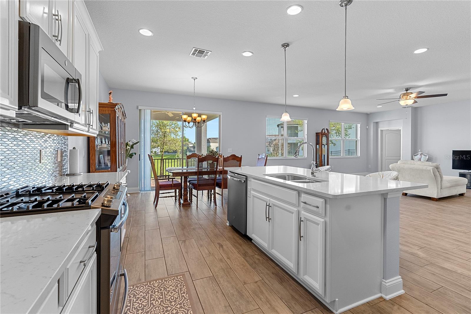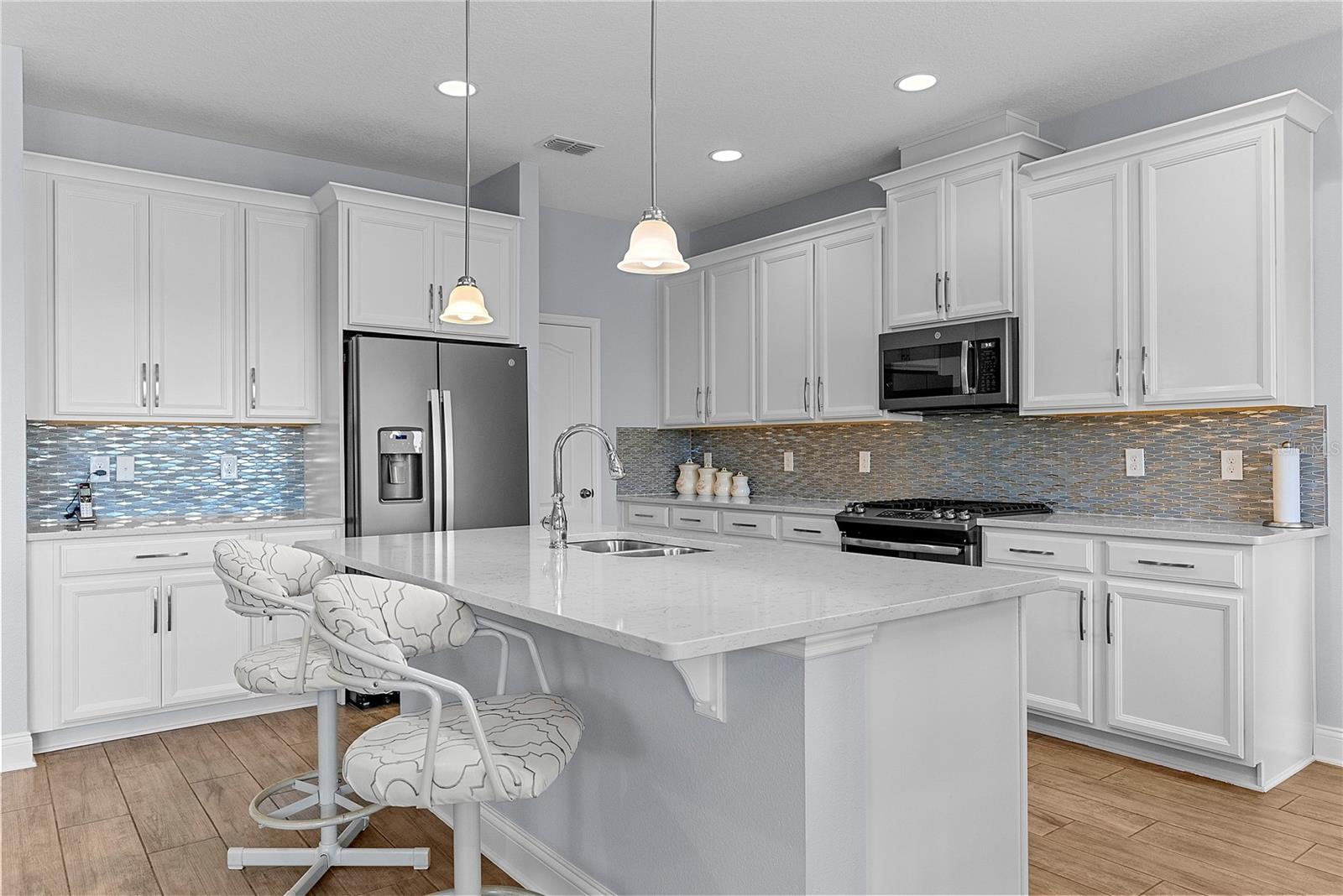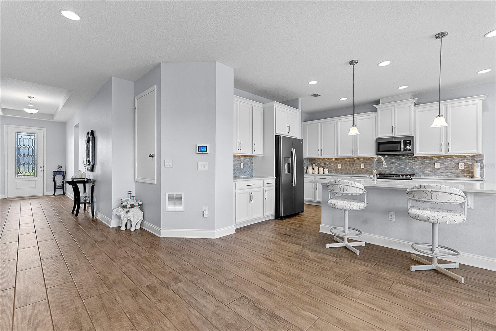 Escondida dentro de um desejável condomínio fechado, esta casa lindamente projetada de 3 quartos e 2 banheiros oferece a combinação perfeita de privacidade, espaço e conforto moderno; idealmente localizado em frente à piscina comunitária e sem vizinhos traseiros para maior tranquilidade. Com mais de 2.100 pés quadrados de área útil, a casa recebe você com um hall de entrada repleto de luz que se abre perfeitamente para uma ampla área de estar e cozinha, criando um ambiente ideal tanto para a vida cotidiana quanto para entretenimento. As principais áreas de estar apresentam elegante piso de cerâmica cinza, enquanto a cozinha do chef é cuidadosamente decorada com bancadas de quartzo, armários de 42" com iluminação LED sob o armário, uma despensa, eletrodomésticos de aço inoxidável e um fogão a gás. A área de jantar adjacente tem vista para o quintal. Situada privadamente fora da sala de estar, a suíte principal é um verdadeiro refúgio com tetos elegantes e um layout espaçoso. O banheiro privativo oferece uma experiência de spa com um chuveiro duplo com box amplo. vidro sem moldura, pias duplas com bancadas de quartzo e um closet grande projetado para acomodar até o guarda-roupa mais extenso. Na frente da casa, você encontrará dois quartos adicionais e um banheiro completo com pias duplas e acabamentos de quartzo, além de um lavabo conveniente perfeitamente posicionado para os hóspedes.