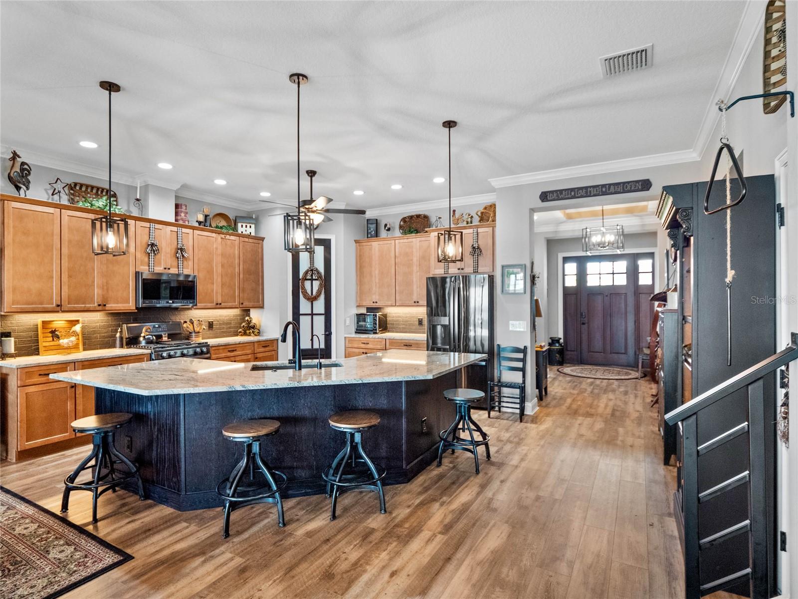 Impressionante casa à beira do lago localizada no condomínio fechado e isolado de Water Ridge, onde os residentes desfrutam de comodidades em estilo resort, ambientes bem cuidados e uma localização idealmente posicionada no coração da Flórida Central. Bem-vindo ao 200 Valencia Ridge, uma casa nova à beira do lago, construída sob medida, com 4 quartos, um escritório/escritório dedicado, 2,5 banheiros e áreas de estar ao ar livre com vistas incomparáveis. O paisagismo exuberante e a paisagem pavimentada com tijolos levam a um interior espaçoso e fluido, com acabamentos de qualidade e elementos arquitetônicos que aproveitam ao máximo esse cenário à beira-mar. O primeiro nível inclui uma grande sala, escritório/arrumos, cozinha lindamente decorada, suíte principal no térreo, lavanderia interna e muito mais. Uma grande sala de grandes dimensões serve como o centro perfeito para entretenimento e relaxamento diário, com uma parede de painel duplo e controles deslizantes de vidro de baixa emissividade que enquadram perfeitamente as vistas do suave nascer do sol matinal e do espetacular pôr do sol noturno. A cozinha bem equipada irá agradar a quem gosta de cozinhar, oferecendo uma abundância de bancadas de pedra, armários e espaço de preparação, além de uma grande ilha, balcão de café da manhã, armários personalizados, eletrodomésticos de inox preto, fogão a gás e um ambiente organizado. despensa. Uma desejável suíte principal no primeiro andar oferece um refúgio relaxante com janelas salientes com vista para o lago, bem como um enorme closet e um luxuoso banheiro completo com balcões de granito, pias duplas e um box amplo de azulejos. Suba a escada decorada com um elegante corrimão de metal para descobrir o nível superior, com uma pitoresca área de estar/leitura no patamar e três quartos de hóspedes de tamanho generoso, cada um oferecendo amplo espaço no armário e vistas elevadas da paisagem circundante. O banheiro completo tem balcões de granito, pia dupla e banheira de azulejos com chuveiro. Embora o interior desta casa seja impressionante, a sua vida ao ar livre é o que verdadeiramente cativa todos os que entram. Equipada com teto macho e fêmea, iluminação de candelabro e tela panorâmica, a varanda dos fundos é o santuário perfeito para desfrutar das vistas tranquilas do lago e do pôr do sol noturno que pintam o céu deste relaxante paraíso da Flórida. O Lago Medora é um dos lagos mais tranquilos da comunidade que limita o tráfego a embarcações que não sejam movidas a gás, para que você possa praticar caiaque e paddleboard em total paz. O lago permite ainda a construção de um cais para maior aproveitamento e diversão. Outras características desta casa incluem um quintal cercado, uma garagem grande para dois carros, uma grande lavanderia, muito espaço de armazenamento, janelas com vidros duplos, pavimentação de tijolos, detalhes em pedra, etc. comodidades impressionantes, incluindo um clube em estilo de plantação, academia, sauna, cozinha, bar ao ar livre, três piscinas, quadras de tênis e pickleball, rampa para barcos, armazenamento para barcos e muito mais. Localizado a menos de 1 hora da Disney World, 1 hora e meia do Aeroporto Internacional de Orlando (MCO) e Tampa International (TPA) - perto de lojas, restaurantes e muito mais. Viver em Water Ridge oferece aos residentes uma qualidade de vida fantástica e uma mistura perfeita de aventura sem fim, vida à beira-mar e relaxamento ao ar livre. Venha descobrir esta maravilhosa propriedade à beira do lago! (VEJA O VÍDEO)