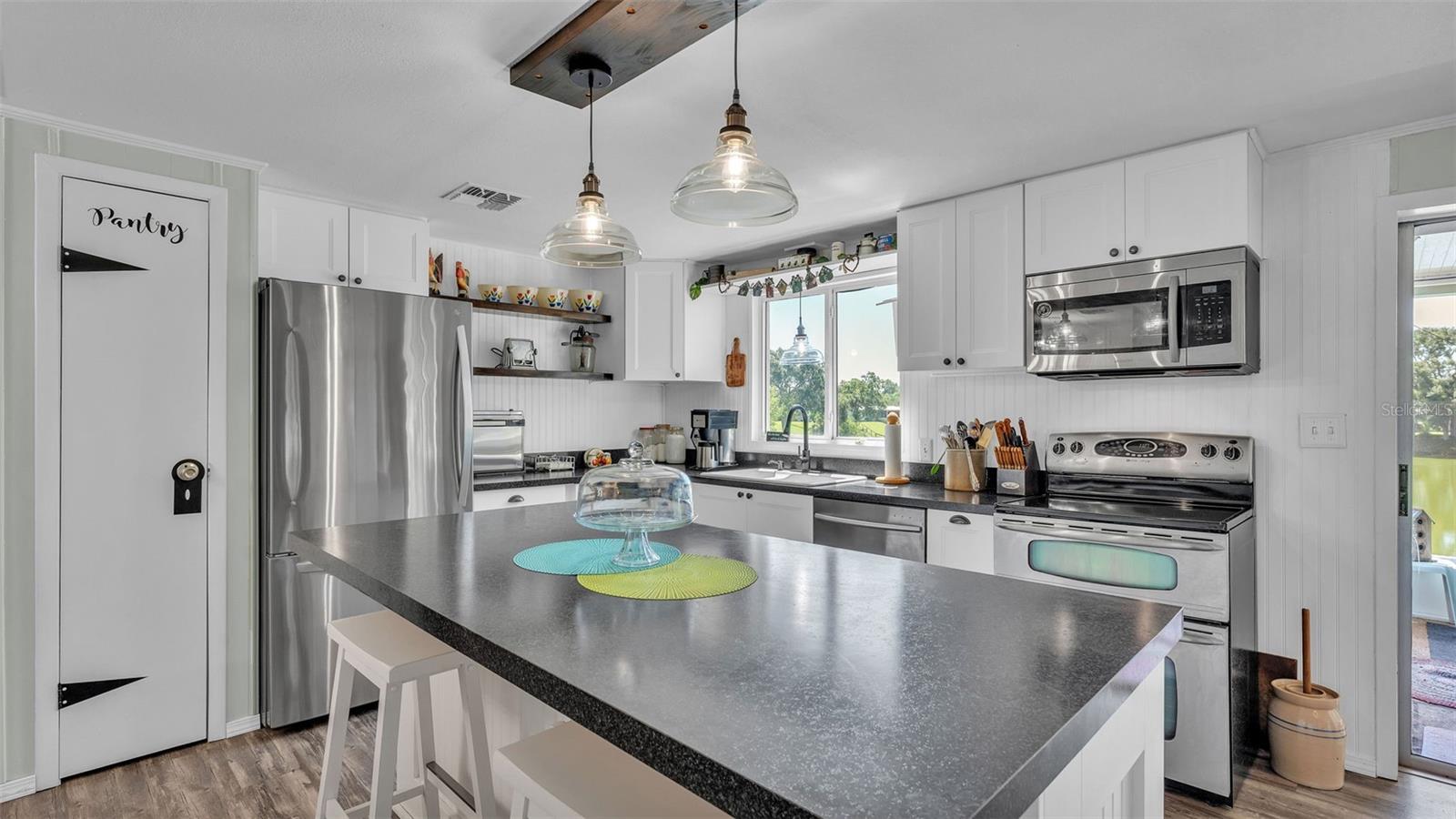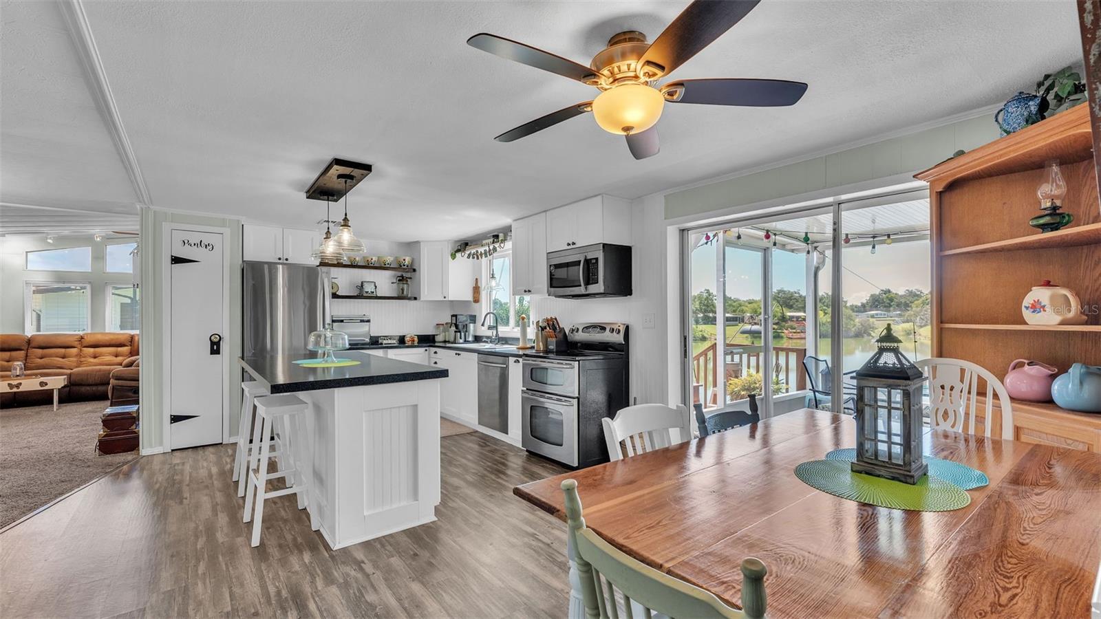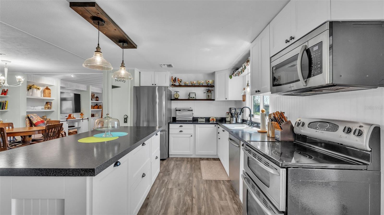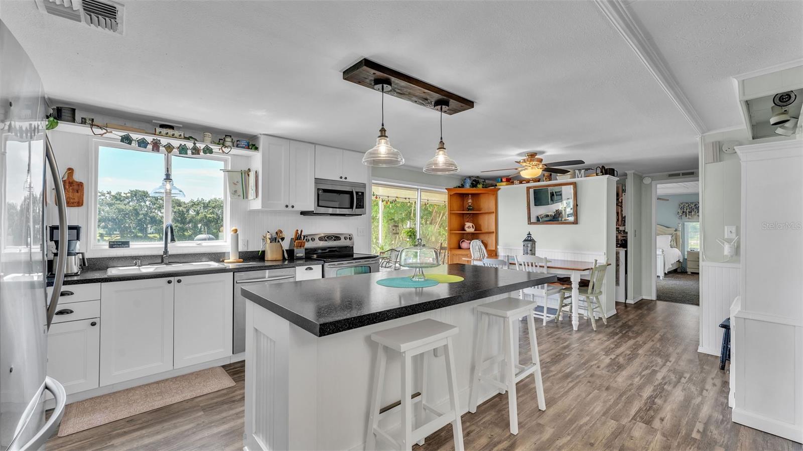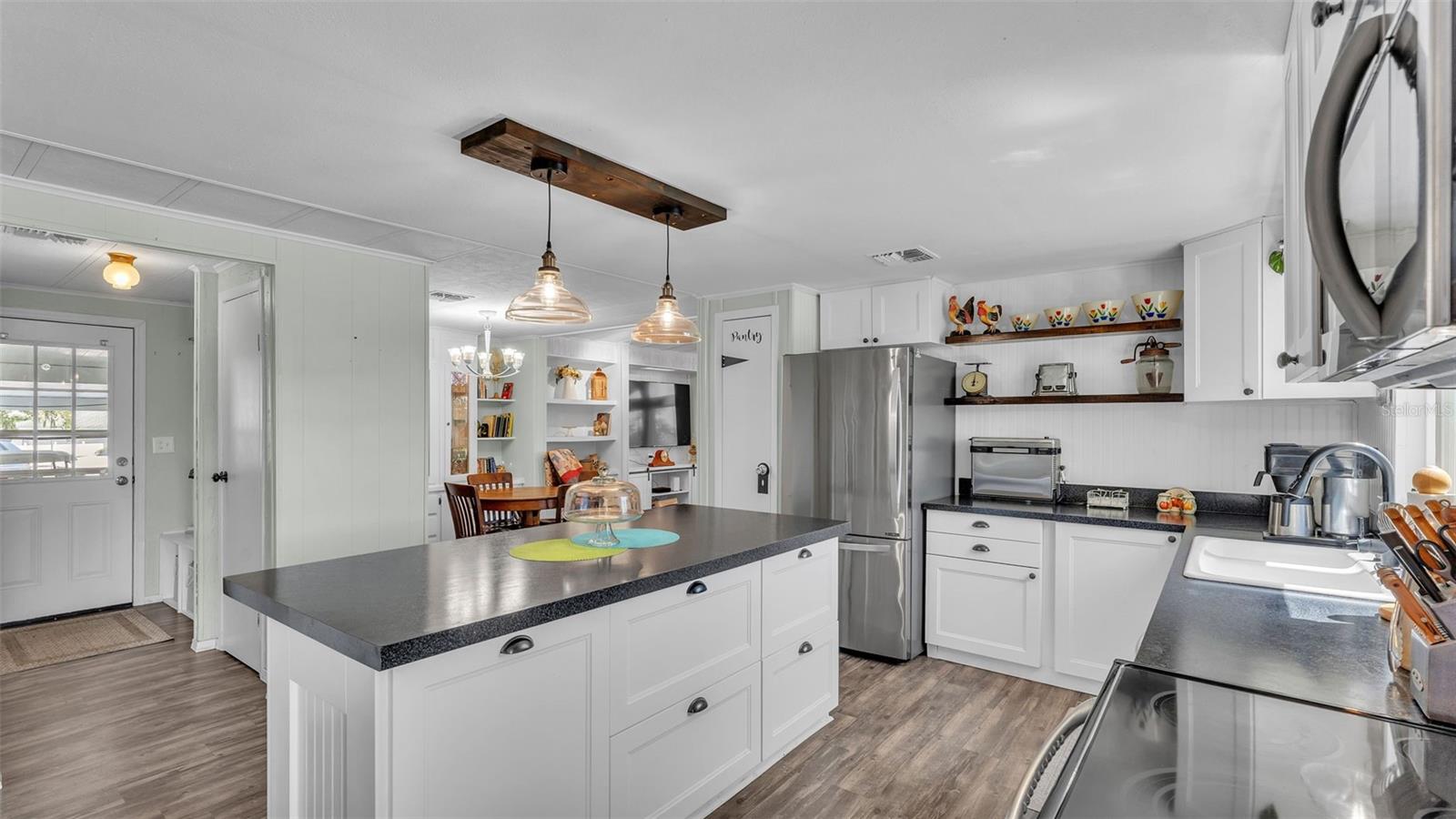 IMACULATE Waterfront Home em lagos florais - faça cada momento contar e aproveitar o estilo de vida da Flórida no seu melhor nesta bela casa de 2 quartos e 2 banheiros. O design contemporâneo e o orgulho da propriedade o impressionarão, enquanto você entra nesta adorável casa atualizada. Um banco de parede personalizado bem trabalhado recebe você através da entrada da cozinha bem equipada e graciosamente atualizada, oferecendo uma ampla ilha central com armários de painéis elevados com gavetas refúgios e muitos recursos de armazenamento. Aparelhos inoxidáveis, backsplash do quadro de contas e iluminação atualizada completam esse estilo moderno com vistas calmantes do lago na janela de vigia e o canto do café da manhã ... um espaço ideal para entretenimento. Os fabulosos armários embutidos de parede a parede oferecem recursos personalizados funcionais e um ótimo ponto focal para o espaço da sala de estar e de jantar, com grandes janelas para trazer muita luz natural ao coração desta casa. O quarto primário privado é espaçoso e oferece sotaque em madeira no teto, portas deslizantes para o lanai exibido com vista para o lago e um banho de suíte atualizado com armários de painel elevado com pias duplas, chuveiro grande e closet de azulejos. O quarto de hóspedes inclui um desktop embutido e está próximo do banho de hóspedes atualizado, proporcionando conforto e conveniência para todos. Esta casa oferece grande versatilidade com um escritório com vista para o lago e um espaço flexível para artesanato ou espaço de armazenamento interior extra. Special highlights for this home include, spacious 1,464 sqft of living area, updated luxury vinyl plank and laminate flooring, new air conditioner in 2024, double pane windows, vaulted ceilings, ceiling fans, low maintenance vinyl siding on exterior, durable wood-alternative composite front stairs and deck, two car carport and golf cart garage with automatic door, featuring a workshop and laundry. Esta é uma comunidade amigável de carrinho de golfe e, como bônus, o carrinho de golfe está incluído! O Entertain Diverting é uma brisa na espaçosa lanai, ou desce o deck de madeira até o pátio aberto, enquanto desfruta de vistas serenas de Big Bass Bay e cercado por cores vibrantes e paisagismo. O Floral Lakes é uma comunidade ativa de mais de 55 anos e fornece muitas comodidades, incluindo um belo clube, piscina aquecida, Billards, shuffle table, um putting verde e áreas de jardim para todos os residentes desfrutarem. As taxas da comunidade incluem todas as comodidades, atividades sociais, aulas de exercícios, jogos e muito mais, além de armazenamento opcional de campista/motor para taxas adicionais. Convenientemente localizado perto de compras, restaurantes, restaurantes locais e central para Tampa e Orlando para um rápido trajeto para atrações e praias da Flórida!