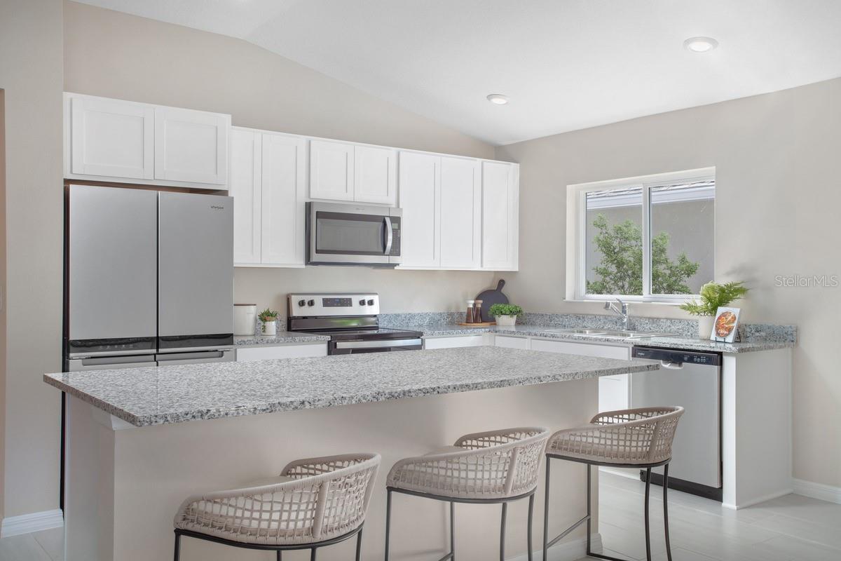 Esta casa de modelo de um andar lindamente criada em Hancock Crossings oferece uma planta baixa com tetos de volume, piso de azulejos por toda parte e uma grande sala grande, perfeita para entretenimento ou relaxamento. A cozinha moderna impressiona com bancadas em granito, uma grande ilha, uma torneira de cromo Moen®, uma pia Kohler®, utensílios de aço inoxidável Whirlpool® e armários superiores de 36 polegadas para amplo armazenamento. Uma lavanderia dedicada fornece conveniência diária, enquanto a suíte principal apresenta um generoso closet e um banho privativo com uma vaidade de pia dupla.