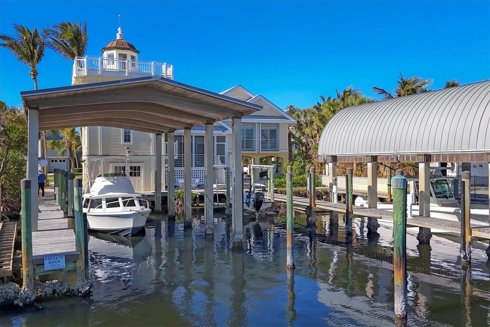 RARA OPORTUNIDADE DE COMPRAR UMA CASA PERSONALIZADA À BEIRA-MAR COM “MARINA” PRIVADA QUE INCLUI 3 DESLIZAMENTOS DE ÁGUAS PROFUNDAS, 2 DOS QUAIS TEM ATÉ 100 PÉS DE COMPRIMENTO, NO CORAÇÃO DE BOCA GRANDE! Localizada com fácil acesso ao ICW a partir do Canal Millers Marina, esta é uma propriedade única. Oferecendo águas profundas, longos comprimentos de deslizamento e alojamento para o proprietário e/ou a tripulação! Das duas rampas cobertas, uma tem 60 pés x 18 1/2 pés e a outra tem 100 pés x 18 1/2 pés. Ambas as coberturas do barco são uma obra de arte e projetadas com estacas de concreto de 45 pés de comprimento, telhado de metal detalhado com parte inferior de pinho amarelo e alumínio galvanizado. A rampa central tem 100 pés x 20 pés e está equipada com um elevador. Uma sala de equipamento está convenientemente localizada ao lado da doca para fácil acesso. Projetado pelo arquiteto George Palermo e construído por Pat Ball of Ball Construction originalmente em um lote de 50 pés de largura em 1994 e depois adicionado em 1999, quando um lote adjacente de 25 pés foi comprado para uma orla marítima nobre combinada de 75 pés. A casa é composta por 4 quartos, 4,5 banheiros, uma cozinha confortável e área de estar, loft, grande deck com vista para a água e docas para barcos, além de um deck na cobertura. A casa pode ser usada como casa principal ou de férias, bem como como casa de funcionários para tripulantes e membros da equipe. A casa principal tem uma cozinha e área de estar com controles deslizantes e uma varanda com vista para a água e as docas. O quarto principal tem uma cama queen-size e banheiro privativo com chuveiro. Há também um quarto de hóspedes com cama queen-size, ambos os quartos possuem controles deslizantes para apreciar a vista, com persianas elétricas contra furacões para proteção extra. Uma área de loft com vista para a área de estar e água com uma cama com gavetão, mas também é perfeita para um escritório! O acesso ao “Farol” é feito pela entrada traseira para um quarto com casa de banho privativa completa, subindo depois por uma escada até um loft com beliches embutidos e casa de banho completa. Há um deck especial na cobertura com uma luz de cobre personalizada com acesso por escadas suspensas. Ligue agora para uma exibição privada desta peça especial de Boca Grande, Flórida.