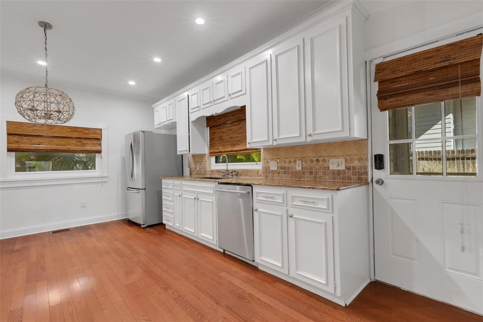 Localizada no coração do histórico Wares Creek, esta casa em estilo artesão de 1935 está localizada em um terreno de esquina cercado por árvores maduras e paisagens. A casa possui lareira a lenha, sancas, sala de jantar separada, ampla sala de estar separada, amplo hall de entrada e bela escadaria que leva ao segundo andar. A grande cozinha tem eletrodomésticos de inox, balcões de granito, pia dupla e cristaleira e despensa embutidas. Uma grande varanda ao lado da cozinha é conveniente para entretenimento e acesso ao pátio. O andar de cima tem 3 quartos, 2 banheiros e varanda. O principal tem um banheiro separado com banheira com pés e closet. Uma suíte individual para sogra com cozinha e banheiro modernos, estúdio de artista e garagem são separados da casa principal pelo pátio. Muitas possibilidades. A poucos quarteirões do centro de Bradenton e do Rio Manatee, a 15 minutos das praias do Golfo da Ilha Anna Maria, da Reserva Robinson e do Parque Memorial Nacional Desoto. Caminhe pelo centro da cidade até os mercados de agricultores, restaurantes, lojas e o River Walk Park