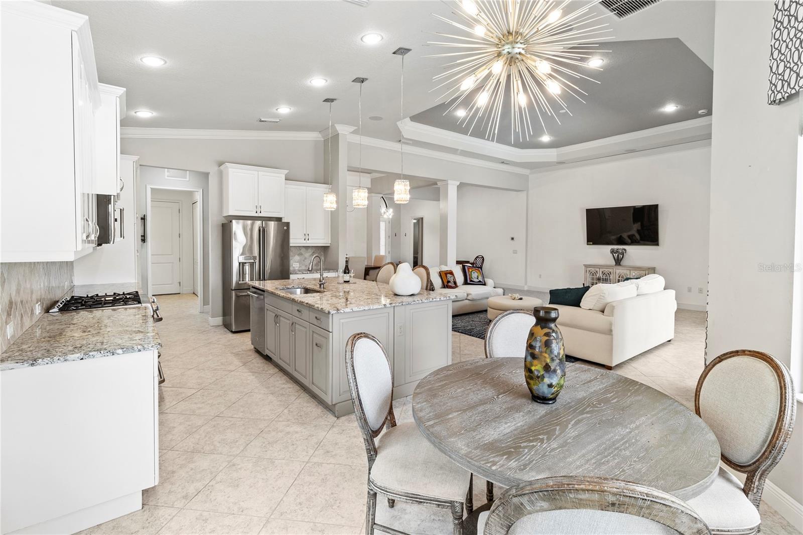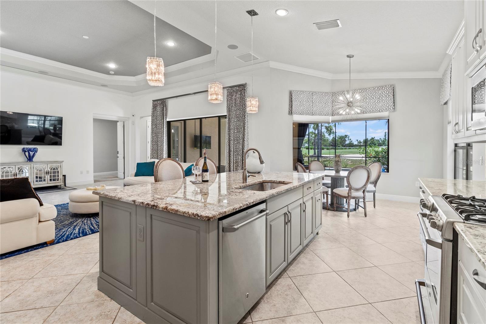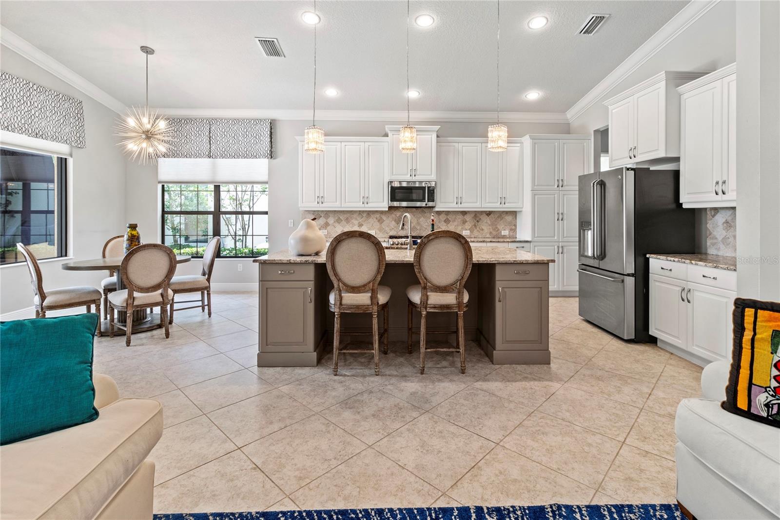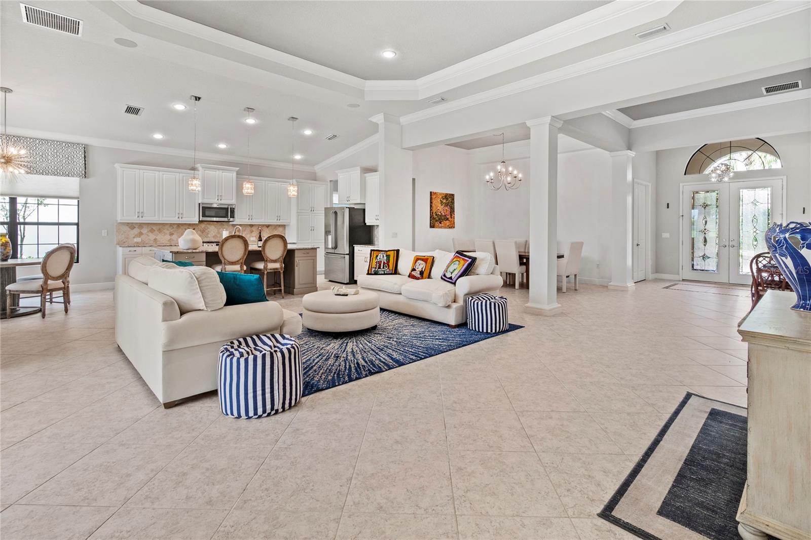 Melhor preço requintado de campo de golfe em Country Club East * A preço de US $ 50.000 abaixo do valor tributável! Esta espetacular residência personalizada e sem manutenção, o modelo "Chatsworth II", oferece quase 3.000 pés quadrados de luxuosos que vivem dentro da comunidade fechada e exclusiva do Country Club East. Idealmente posicionado em um lote premium de campo de golfe da exposição ao sul, com vista para o 10º fairway de Royal Lakes, esta casa possui três quartos e dois banheiros e meia, privacidade e vistas deslumbrantes. Os ricos detalhes arquitetônicos abundam, começando com a entrada espaçosa, com portas dianteiras de impacto duplo de vidro de mancha Therma Tru, um elegante incrustação de ladrilhos, o piso de ladrilhos de porcelana de designer colocado em uma diagonal e os tetos volumosos da bandeja com moldagem expansiva da coroa. A planta de piso imaculada e expansiva da grande sala foi projetada para entretenimento sem esforço, incluindo alto-falantes de som surround Klipsch embutidos. The generous kitchen is a chef's delight, appointed with towering 42" cabinetry (including roll-out shelves), exquisite Swarovski crystal lighting elements, warm granite countertops with a demi-bullnose edge, a marble stone backsplash, and GE Cafe Series stainless steel appliances, including a natural gas stove, oversized single stainless steel sink, and a butler's pantry with a wine refrigerator for the Constipação de vídeo. Chuveiro com chuva de chuva Moen, barra de correio, bancada de canto e nicho. e spa. Home, é equipado com aparelhos Frigidaire, uma bacia de lavagem e armários abundantes para armazenamento adicional. As associações estão disponíveis para aqueles que buscam um estilo de vida mais ativo.