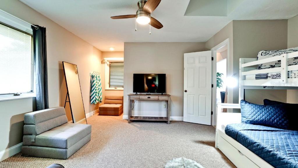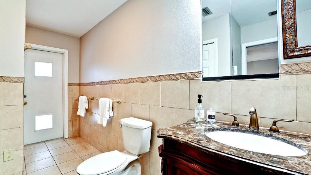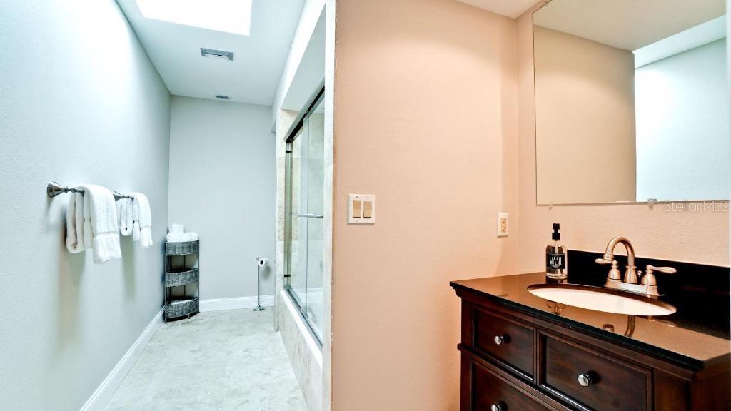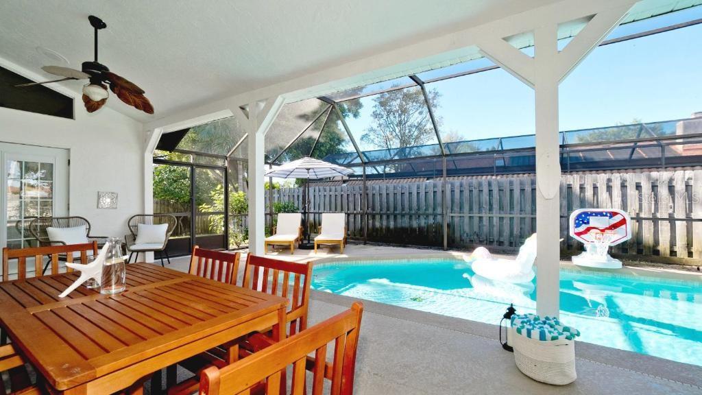 Deck, Gunite, aquecido, no solo, acesso externo ao banho, varredura da piscina, água salgada, gabinete de tela