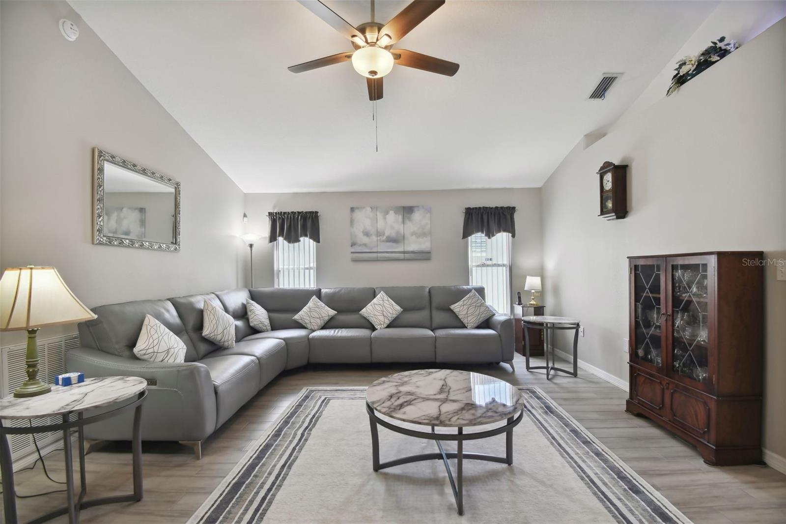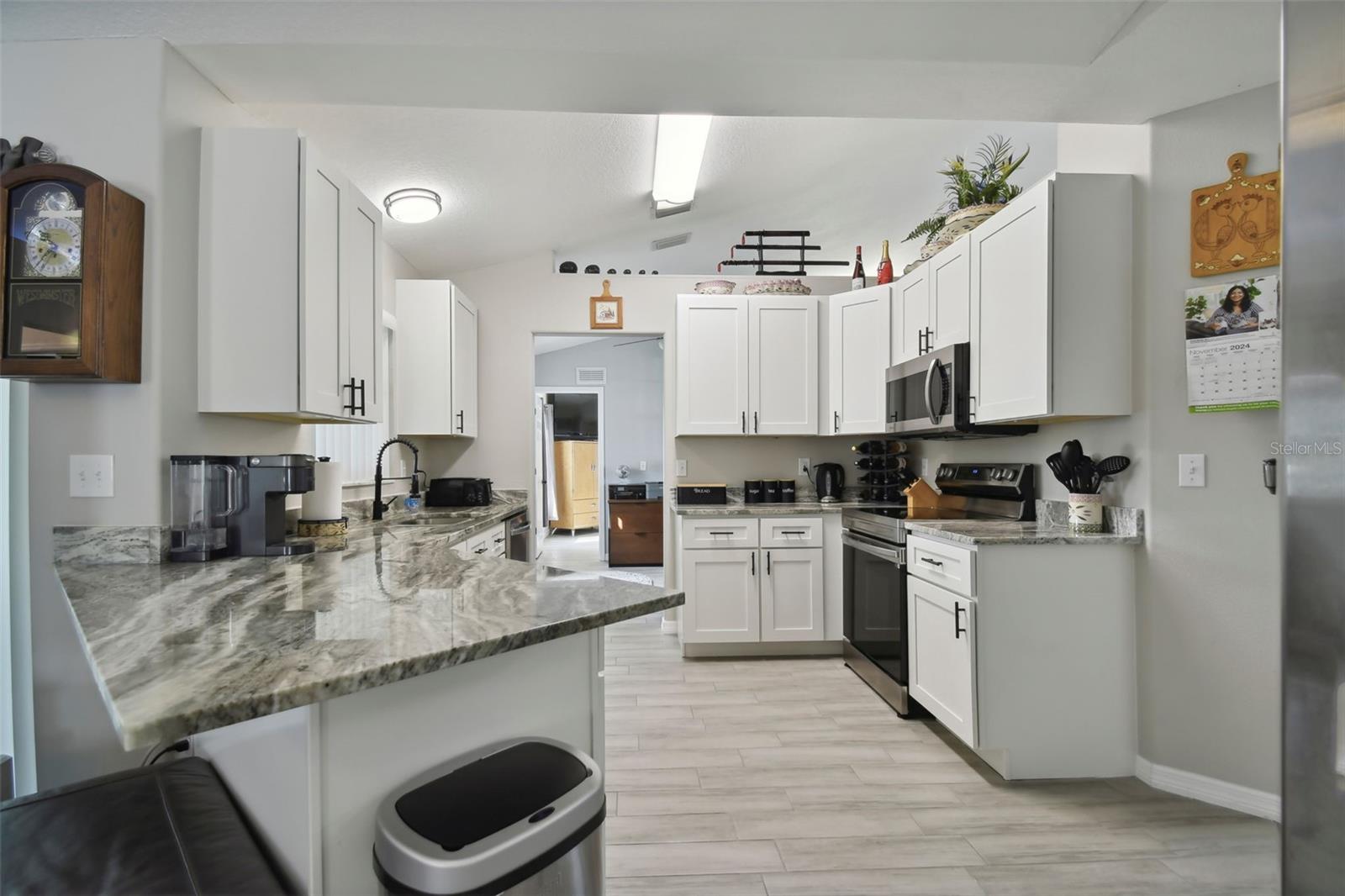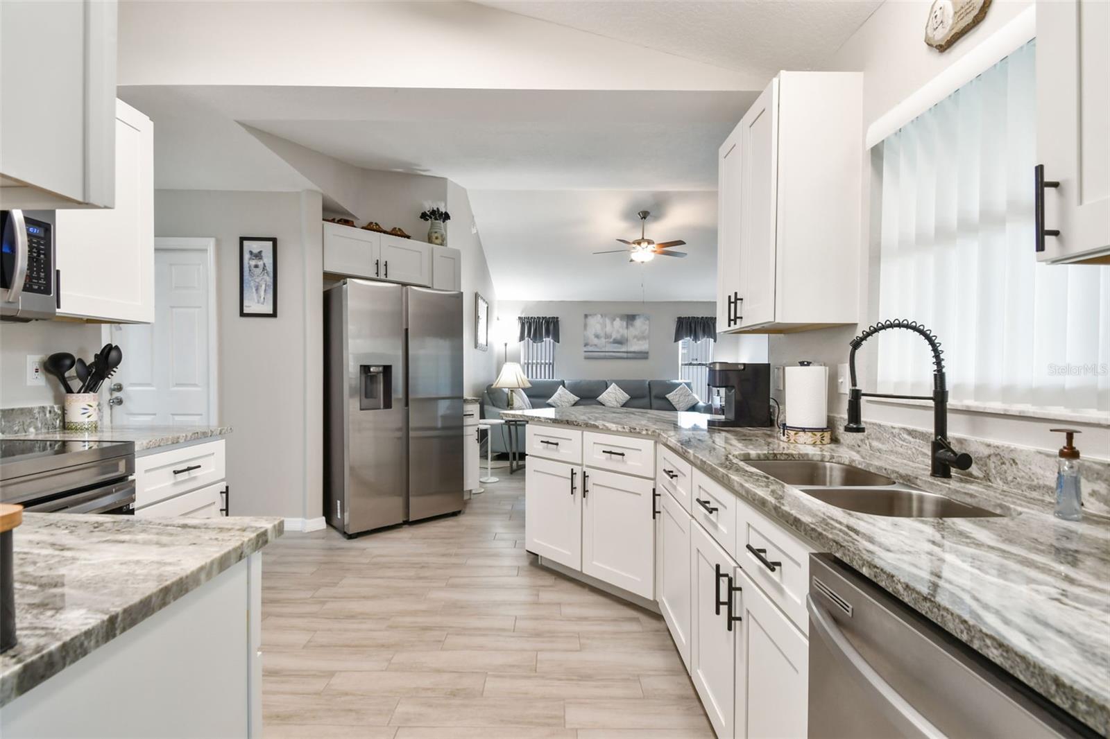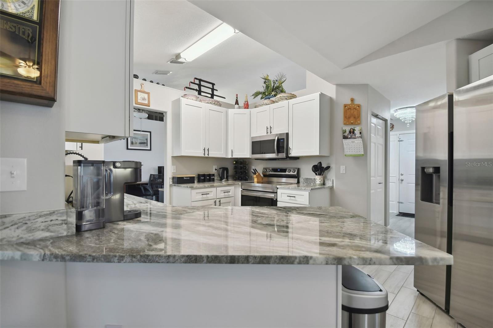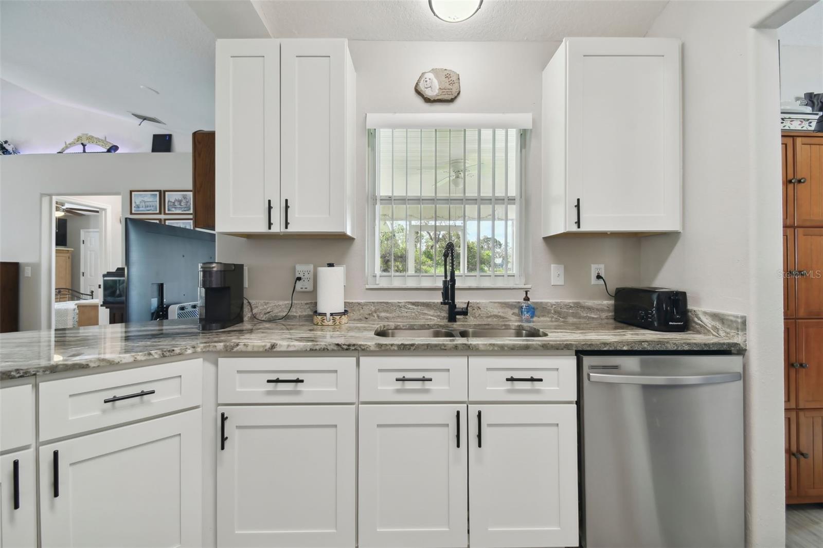 Novo preço !! Esta encantadora, renovada, 1.697 pés quadrados, 3 quartos em casa de 2 banheiros com vista para o lago fica perto do final de um beco sem saída em uma pequena e tranquila comunidade perto de grandes supermercados, bancos e restaurantes. A casa permite que você crie seu próprio layout exclusivo com uma planta aberta, qualidade e ladrilho cinza e tetos abobadados nos dois espaços de estar. Uma das áreas de estar tem portas deslizantes de vidro que levam a um lanai selecionado. A cozinha possui armários de agitadores brancos, bancadas de mármore, descarte e utensílios de aço inoxidável Samsung. A suíte master, de um lado da casa, tem um banheiro privativo com banheira de jardim, vaidade, armário de linho, chuveiro de canto grande e closet. O quarto dois tem um grande closet e fica sentado em um pequeno corredor do banheiro de hóspedes. O quarto três tem vista para o lago e um grande closet. O banheiro de hóspedes possui combinação de banheira/chuveiro, WC, vaidade, armário de linho e porta da piscina, levando ao lanai exibido. A garagem de 2 carros possui conexão de arruela/secadora, pia de utilidade, grande unidade de armazenamento aéreo e uma porta que leva ao quintal lateral. Novo AC instalado em abril de 2024