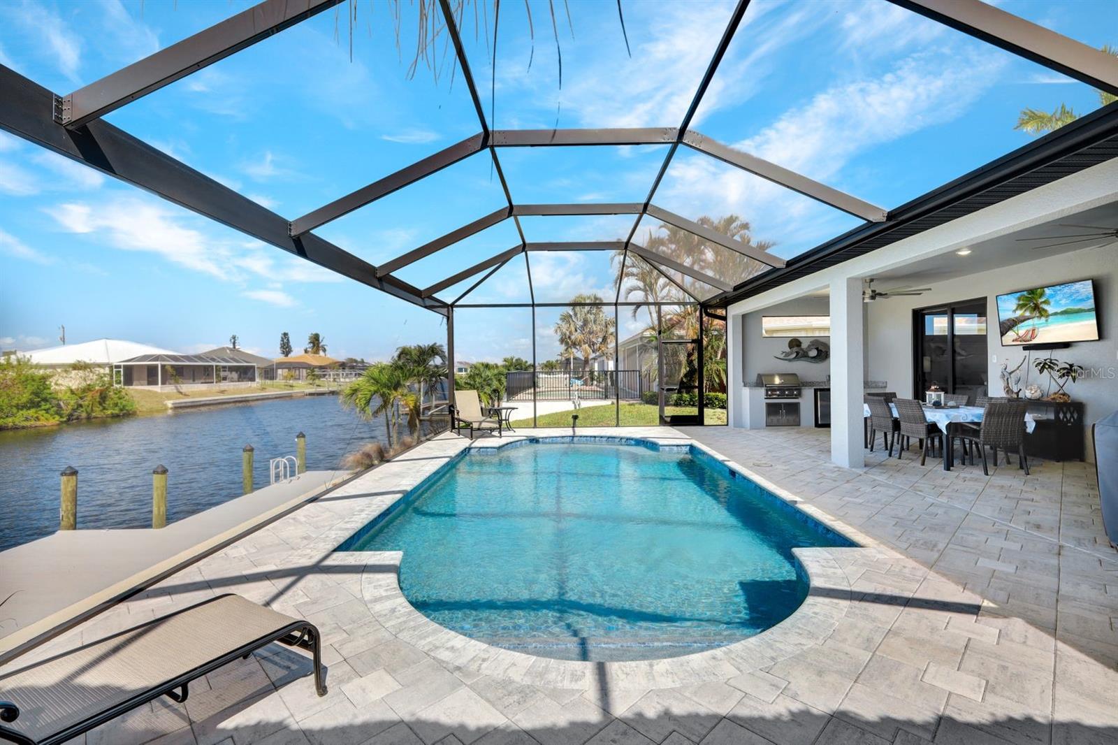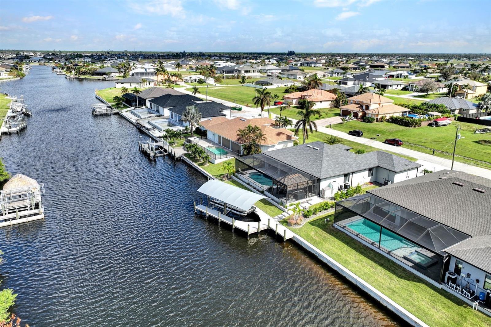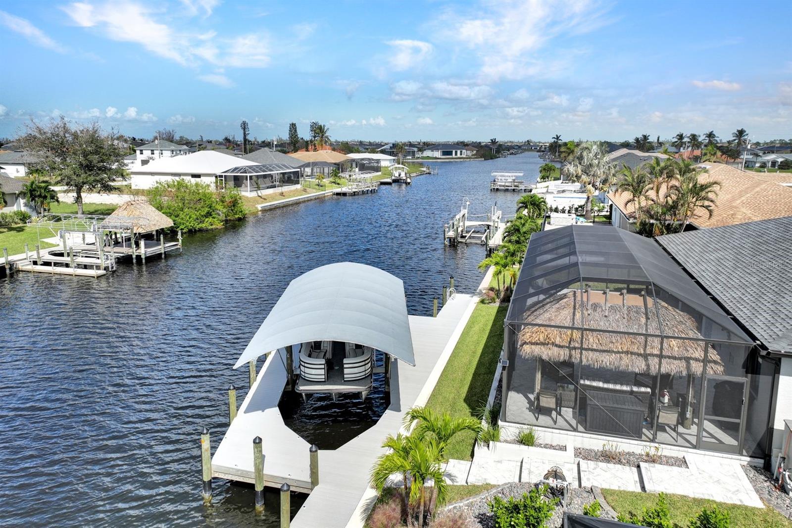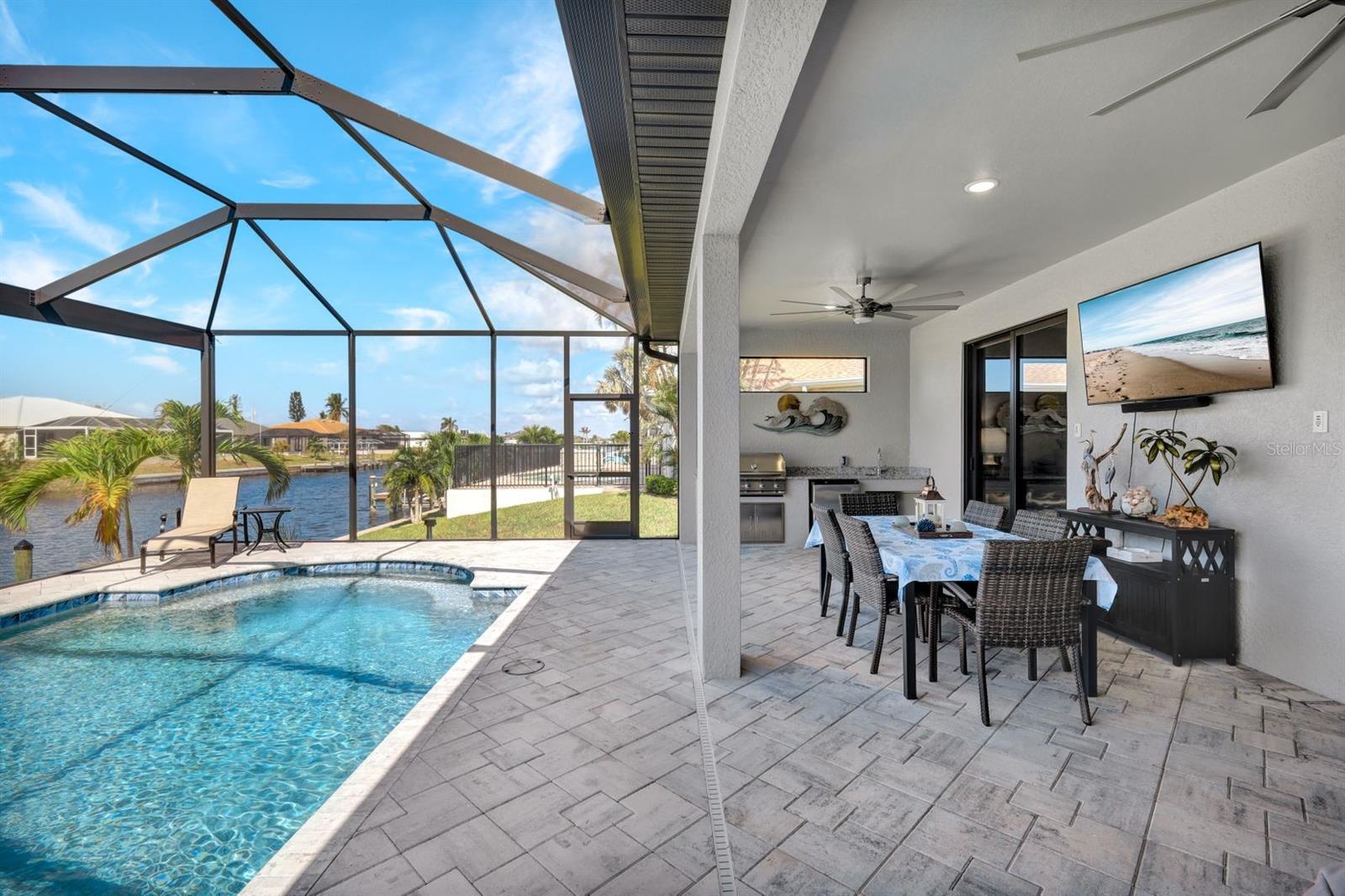 Apresentando luxo costeiro moderno em NW Cape Coral! Construída em 2023, esta joia à beira-mar está situada em um canal de acesso ao Golfo com 37 metros de largura, oferecendo acesso em menos de 30 minutos ao Passo Matlacha. Entre na grande sala, onde tetos de 3,6 metros se elevam acima de uma paleta suave e neutra de cinzas e brancos. A parede de mídia chama a atenção com um impressionante fundo de pedra com detalhes em cinza e branco. A cozinha do chef é funcional e deslumbrante, apresentando uma ilha de quartzo em cascata de 3 metros com armários estilo shaker e detalhes de pedra combinando sob a barra de café da manhã. Uma espaçosa sala de jantar, adornada com venezianas, oferece o espaço perfeito para entretenimento. Com 4 quartos e 3 banheiros completos, este layout inclui uma banheira Jack and Jill e uma banheira de piscina para maior comodidade. A ampla suíte master oferece vistas serenas do canal através de controles deslizantes com classificação de impacto, juntamente com tetos de bandeja, dois grandes armários e uma banheira tipo spa com banheira de imersão, pias duplas com balcões de quartzo e um espaçoso box amplo com branco ondulado azulejos e um toque de cachoeira cinza. Todos os quartos possuem venezianas para privacidade, complementadas por luminárias atualizadas e ventiladores de teto em toda a casa. O espaço ao ar livre foi construído para diversão e relaxamento, incluindo uma cabana tiki construída à mão dentro de uma varanda com janela panorâmica. A varanda coberta dispõe de uma cozinha de verão, enquanto a grande piscina aquecida convida à diversão durante todo o ano. Uma doca composta envolvente com um elevador de barco coberto de 15.000 libras completa esta propriedade deslumbrante, que também inclui uma garagem para 3 carros e janelas e portas resistentes a impactos para segurança durante a temporada de tempestades. Esta casa oferece uma mistura perfeita de luxo, estilo e conveniência à beira-mar.