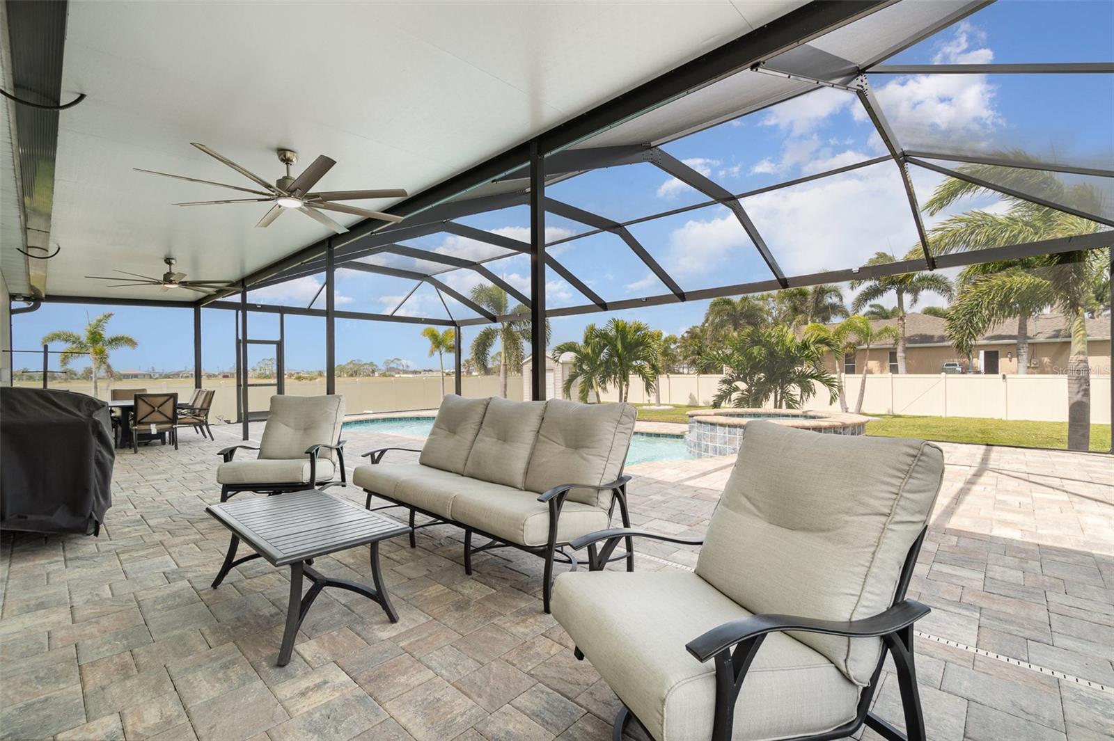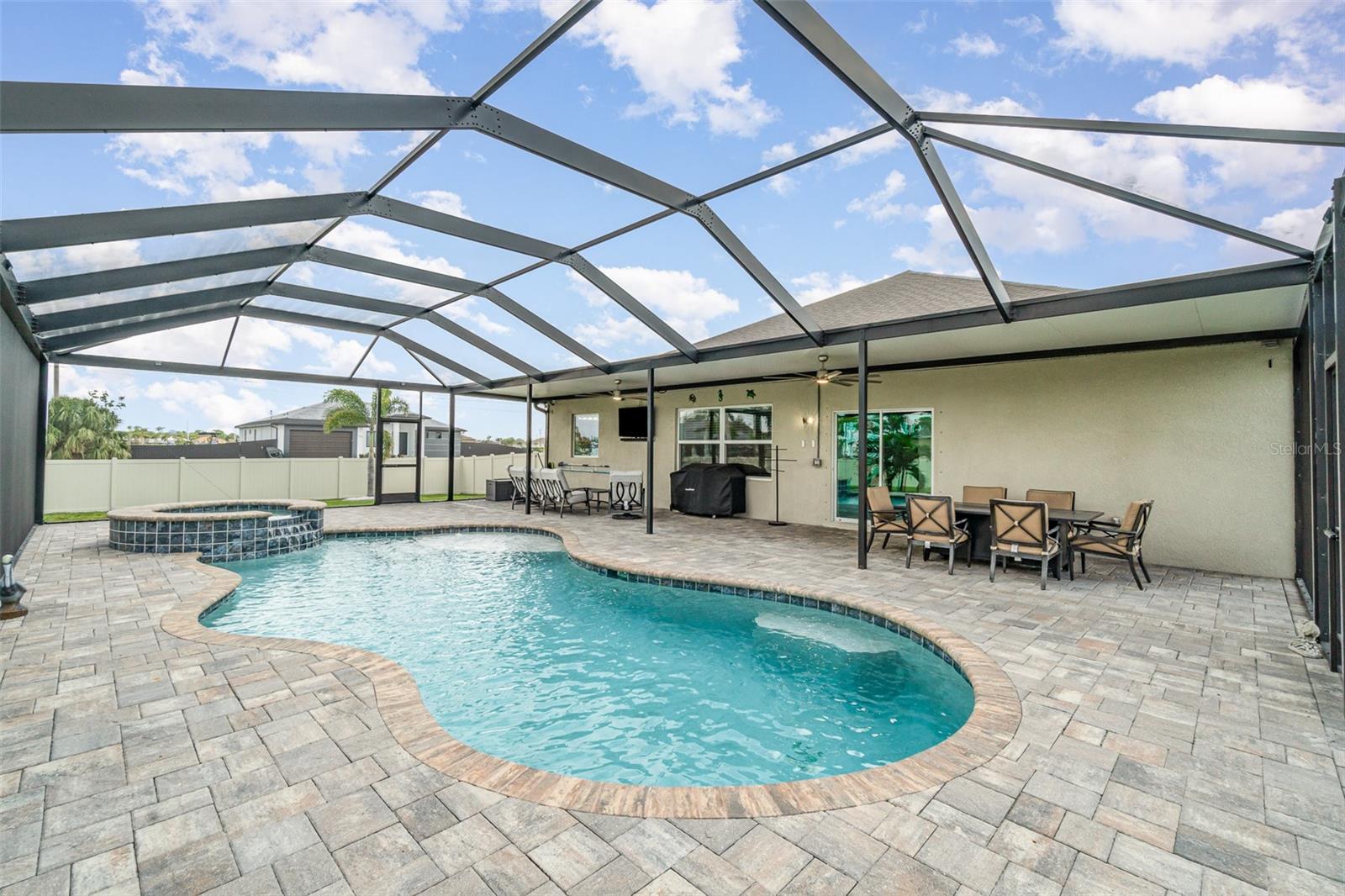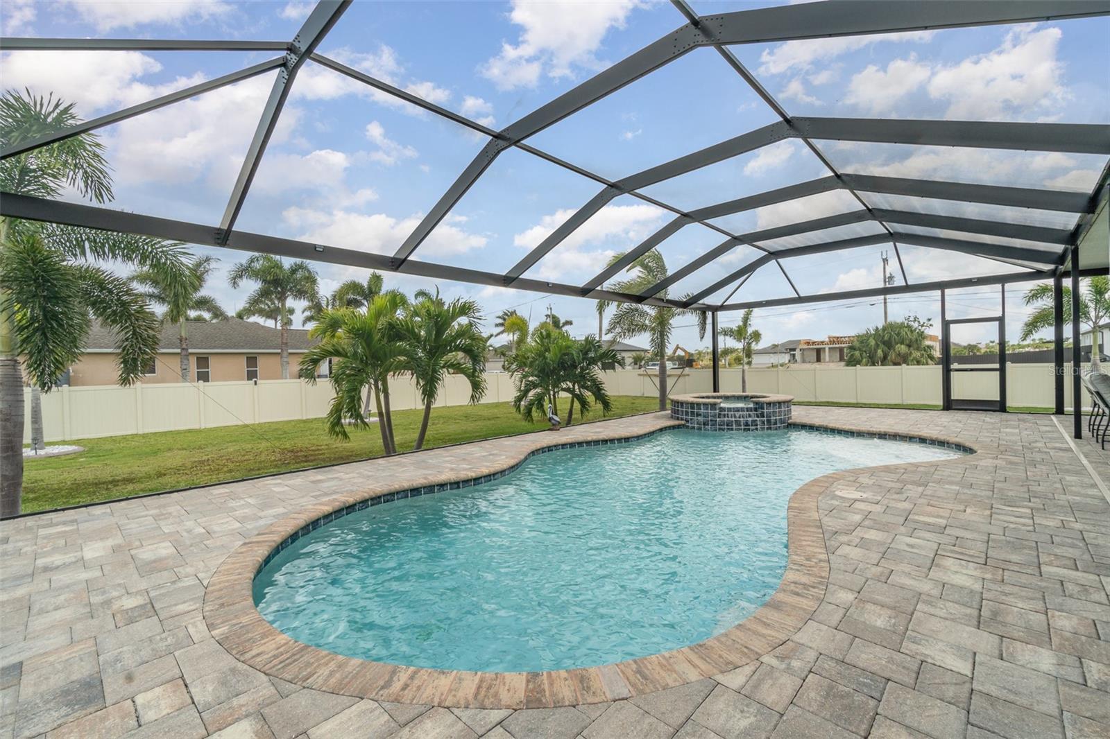 Lindo 3 quartos, 2 banheiro, garagem de 3 carros, piscina em casa com uma sala de família, situada em um lote de meio hectare em Cape Coral. Sem taxas de HOA! Clique no link 1 do Tour Virtual para o vídeo e o link virtual 2 para o tour 3D. Esta casa encantadora possui uma planta baixa e arejada, piso de ladrilhos nas principais áreas de estar, um sistema de osmose reversa de casa inteira, painéis solares e muito mais! Passe um tempo de qualidade com amigos e familiares na sala de estar, com duas grandes janelas para muita iluminação natural. A cozinha oferece todos os utensílios de aço inoxidável, incluindo um forno duplo embutido e cozinheiro, bancadas em granito, backsplash de telha, uma ilha com uma barra de café da manhã, uma despensa e muitos armários para armazenamento. Expanda seu espaço de vida e entretenimento para a família e a sala de jantar da cozinha com um controle deslizante de vidro para o Lanai. O espaçoso quarto principal tem um teto de bandeja, um closet e um banheiro privativo com uma vaidade de pia dupla, um chuveiro com bancada e várias cabeças de chuveiro e um armário de água. Os quartos de hóspedes estão em uma planta baixa, proporcionando muita privacidade com armários embutidos e um banheiro de hóspedes compartilhado por perto. Um oásis privado aguarda a grande parte de exibição, onde você pode saborear seu café da manhã ou relaxar com sua bebida de noite favorita. Recarregue e relaxe com uma piscina de água salgada aquecida e spa, perfeita para diversão durante todo o ano ou absorva o sol do deck da piscina. O quintal paisagístico é totalmente cercado com um galpão de armazenamento para todos os seus equipamentos ao ar livre. 2021 Telhado - Sistema de osmose reversa de casa inteira - painéis solares w 3 baterias de backup Tesla - Proteção do furacão - Sistema de alarme Vivint w 2 câmeras e gravador de 30 dias - armazenamento de garagem de teto - Garagem epoxy e piso de entrada frontal. Convenientemente localizado perto de compras e butiques locais, refeições finas e casuais, entretenimento ao vivo e uma curta viagem de carro para praias premiadas! Agende sua exibição hoje!