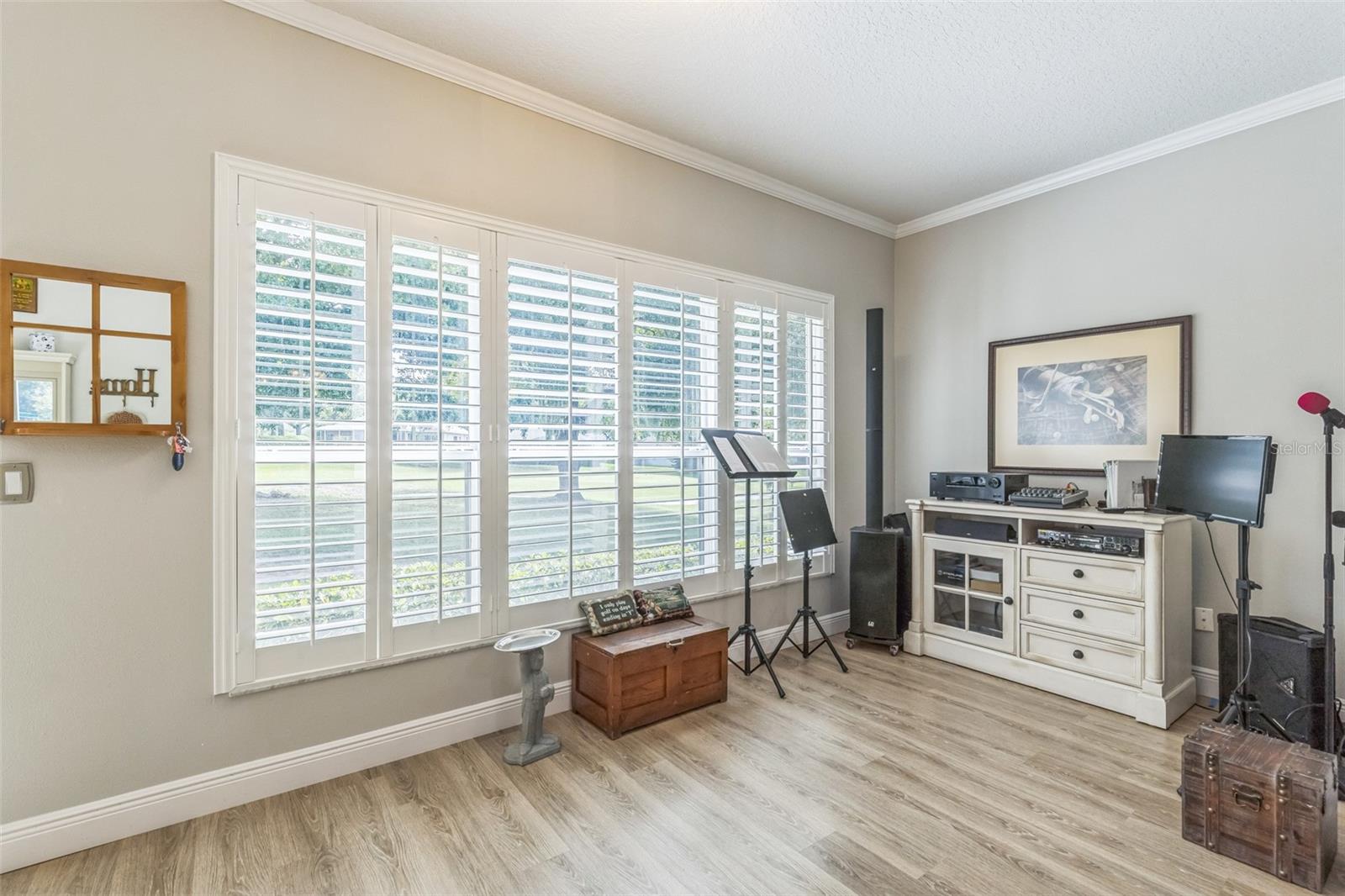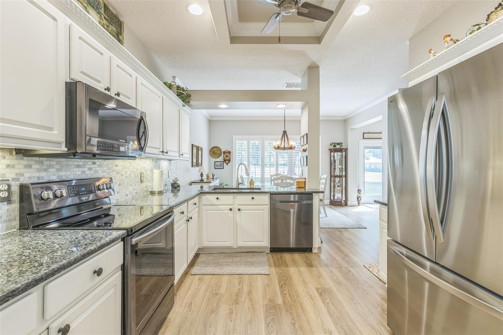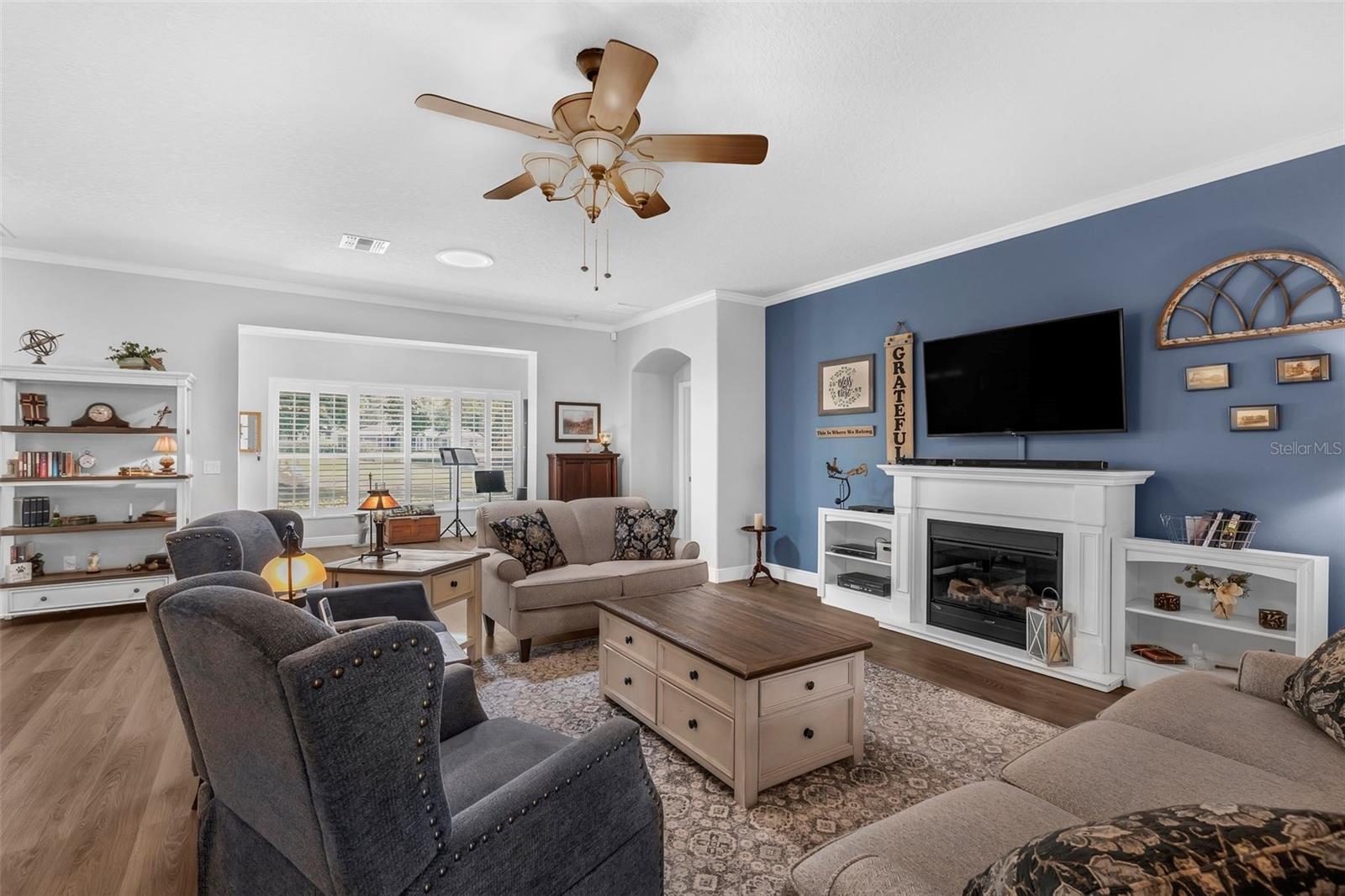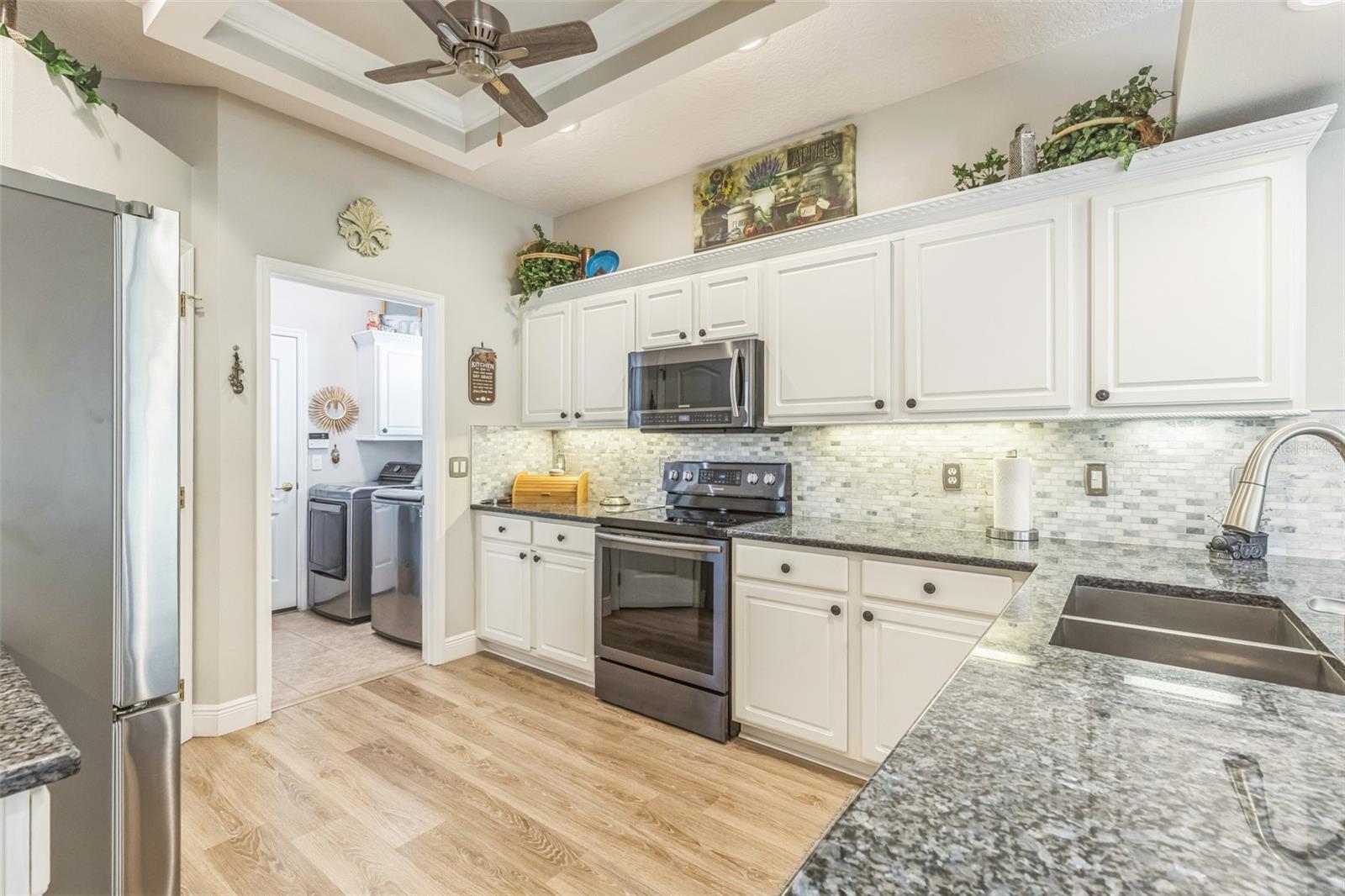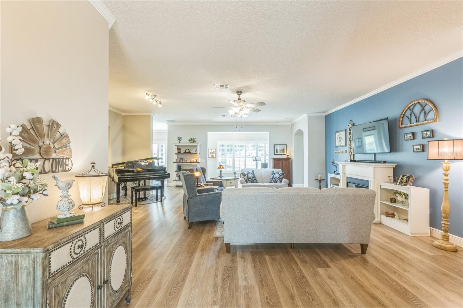 Este plano de piso de St. James, apoiando o 10º tee do Kings Golf Course, está localizado em um belo beco sem saída; Certamente, é obrigatório ver. Esta casa recebe os hóspedes quando eles entram pela atraente porta da frente de vidro chanfrado em um vestíbulo aberto. A planta aberta e dividida permite que muito espaço se reúna e entregue com persianas de plantações por toda parte. The Living room, dining, bedrooms have crown molding, 5 1/4” baseboards. The Family room has a view of the golf course. The Kitchen includes appliances, tile backsplash, granite countertops, under cabinet lighting, corner double pantry with motion detector lighting, tray ceiling and opens to a spacious dining nook. LVP flooring is throughout with tiled bathrooms and with multi shower heads, garden tub, dual Pias do quarto 2 está fora da casa com um armário espaçoso e o piso LVP. Pintura exterior a cada 6 anos, irrigação recuperada, serviço de gramado externo, cabo básico e internet, participou do portão principal, uso de todas as comodidades, como quadras de tênis, pickleball, bola de basquete, tábua de shuffle, banheira de hidromassagem, spa, piscinas, sala de dança, sala de cartão, sala de computadores, biblioteca, salas de artesanato, centers de fitness, salas de baile e muito mais.