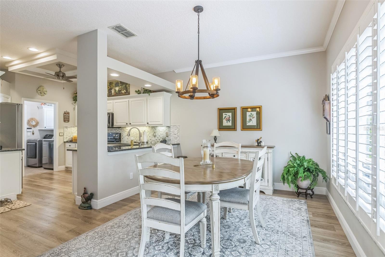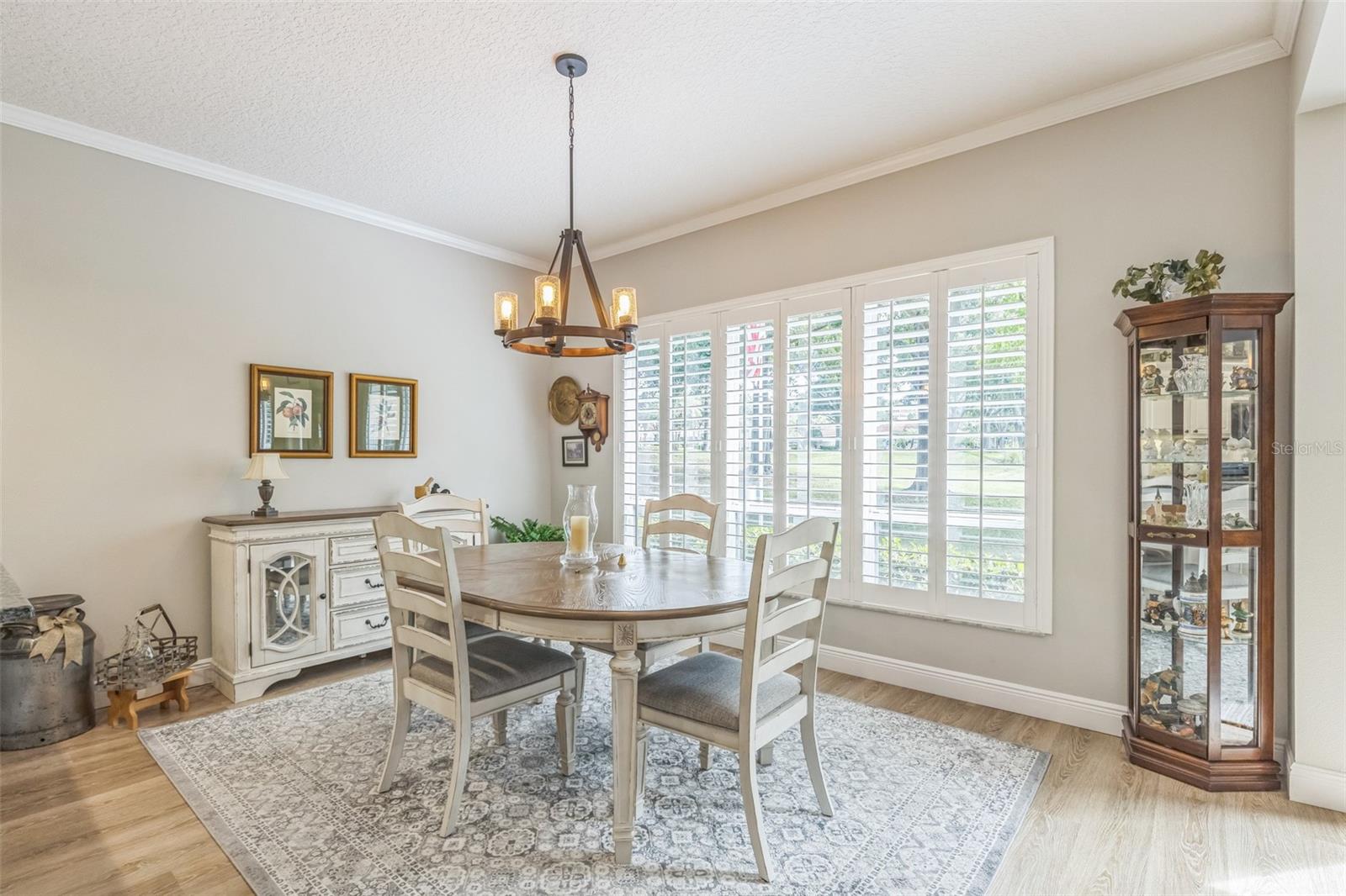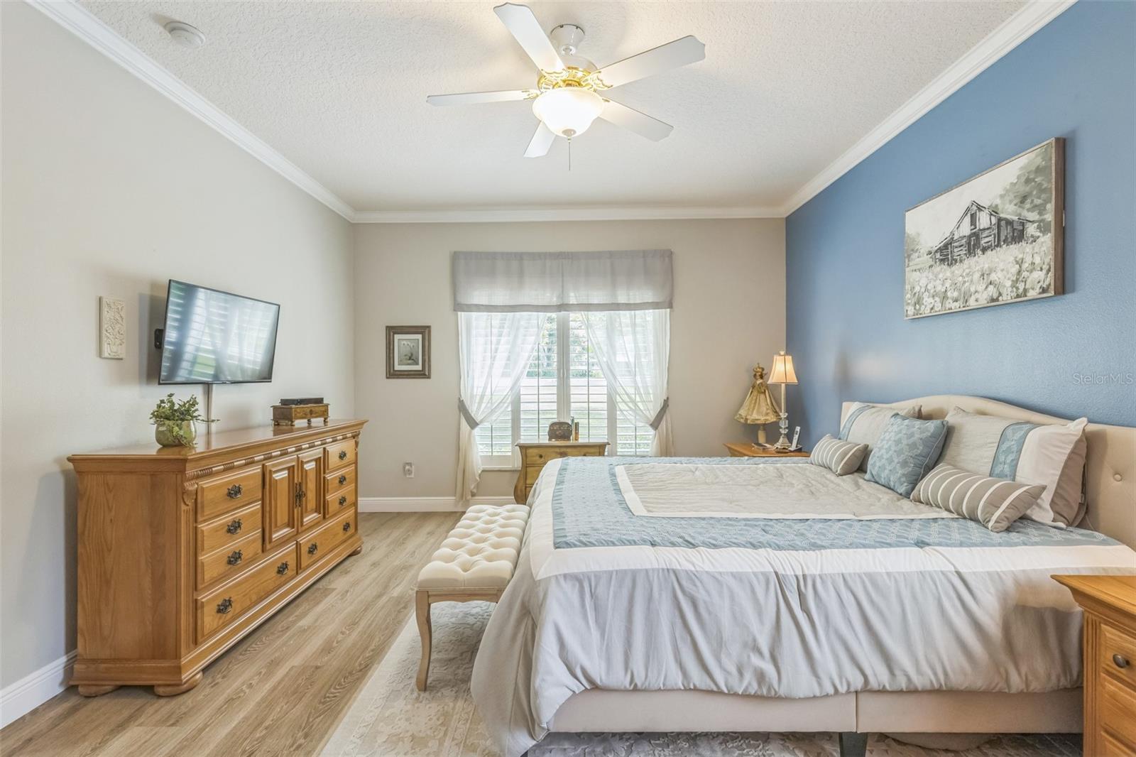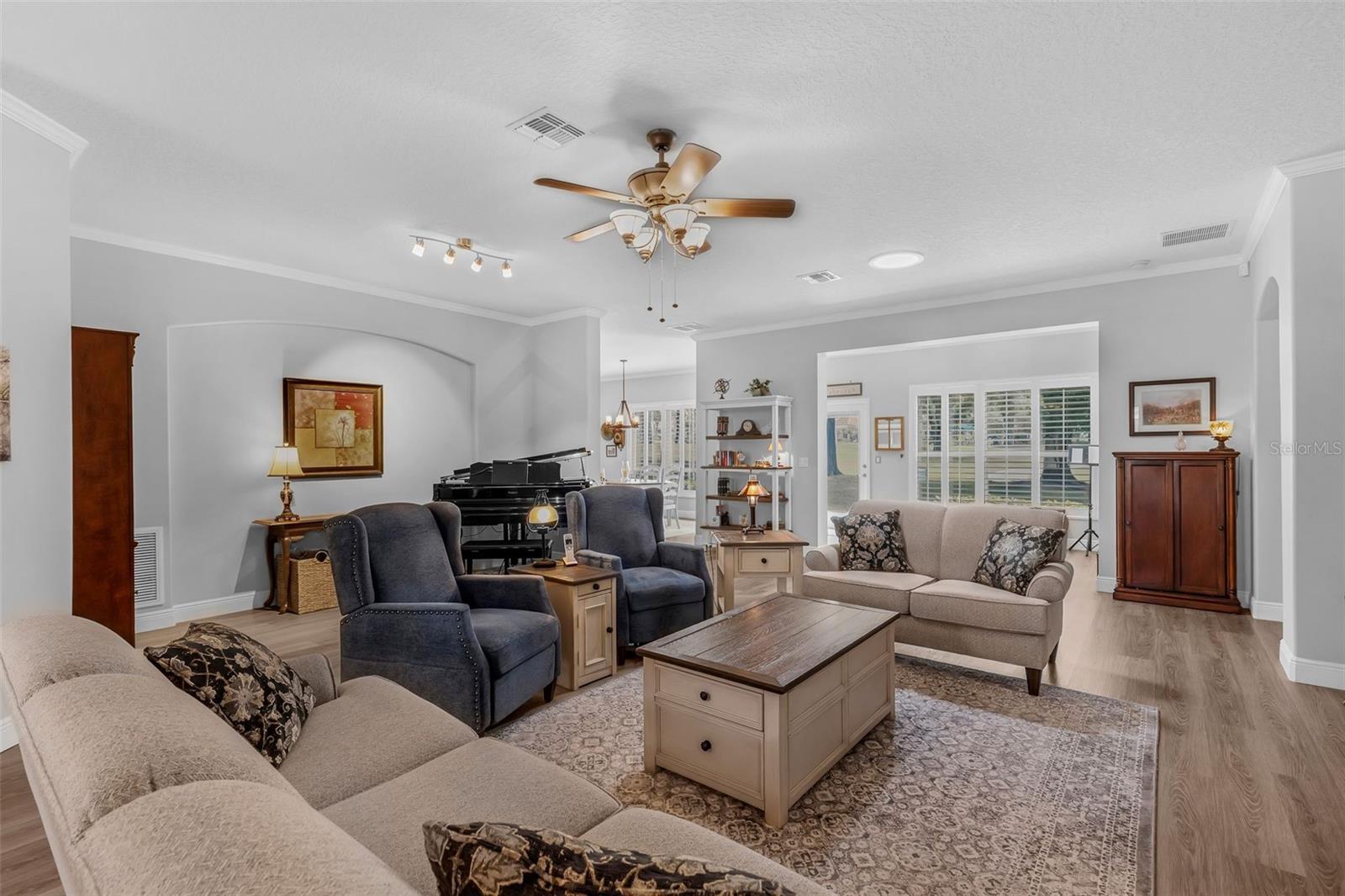 Este plano de piso de St. James, apoiando o 10º tee do Kings Golf Course, está localizado em um belo beco sem saída; Certamente, é obrigatório ver. Esta casa recebe os hóspedes quando eles entram pela atraente porta da frente de vidro chanfrado em um vestíbulo aberto. A planta aberta e dividida permite que muito espaço se reúna e entregue com persianas de plantações por toda parte. The Living room, dining, bedrooms have crown molding, 5 1/4” baseboards. The Family room has a view of the golf course. The Kitchen includes appliances, tile backsplash, granite countertops, under cabinet lighting, corner double pantry with motion detector lighting, tray ceiling and opens to a spacious dining nook. LVP flooring is throughout with tiled bathrooms and with multi shower heads, garden tub, dual Pias do quarto 2 está fora da casa com um armário espaçoso e o piso LVP. Pintura exterior a cada 6 anos, irrigação recuperada, serviço de gramado externo, cabo básico e internet, participou do portão principal, uso de todas as comodidades, como quadras de tênis, pickleball, bola de basquete, tábua de shuffle, banheira de hidromassagem, spa, piscinas, sala de dança, sala de cartão, sala de computadores, biblioteca, salas de artesanato, centers de fitness, salas de baile e muito mais.
