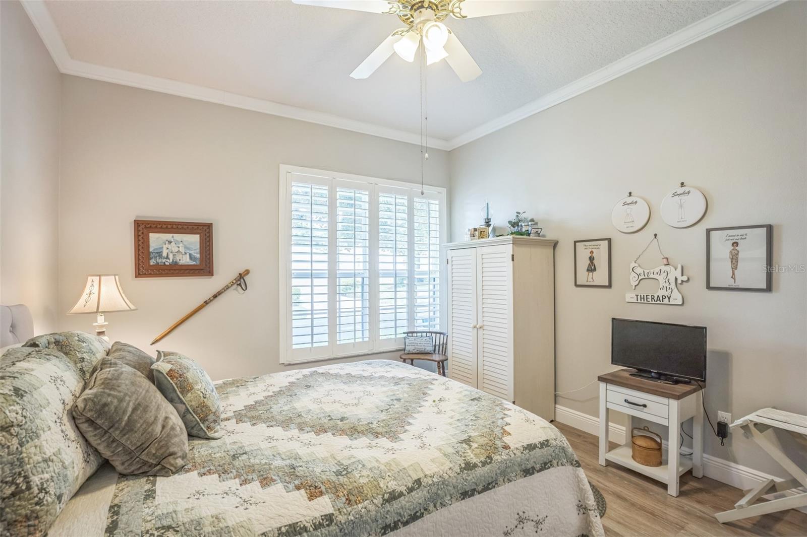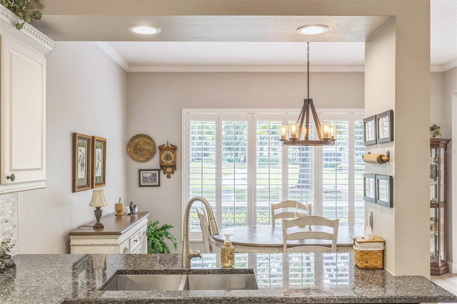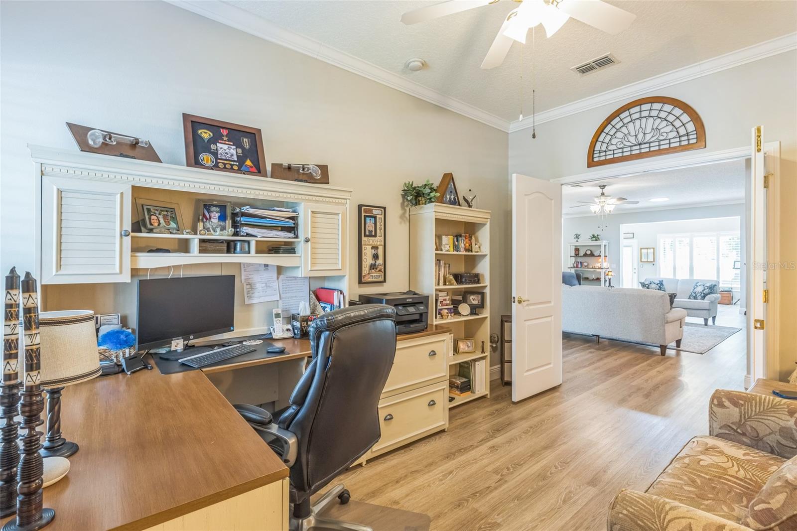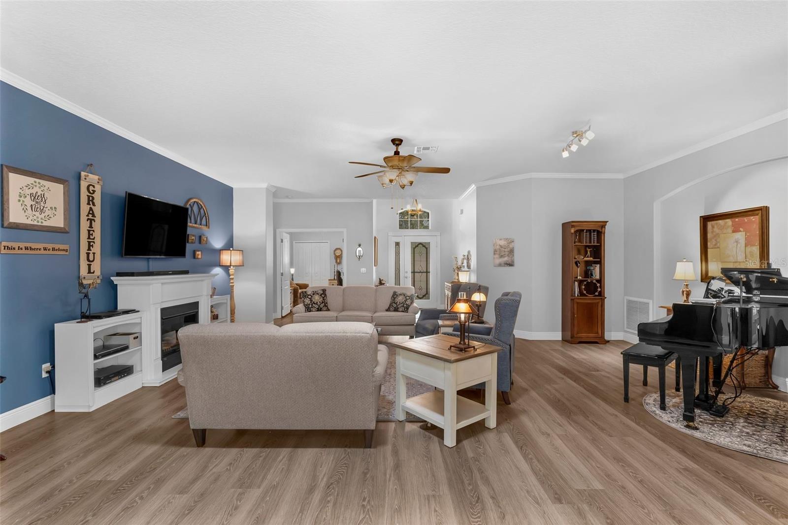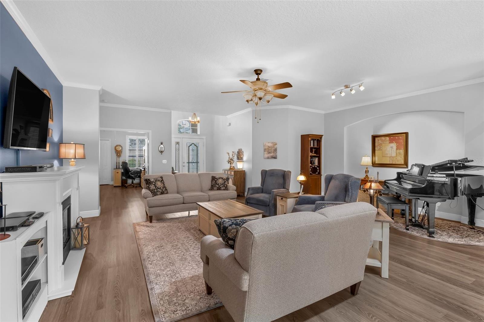 Este plano de piso de St. James, apoiando o 10º tee do Kings Golf Course, está localizado em um belo beco sem saída; Certamente, é obrigatório ver. Esta casa recebe os hóspedes quando eles entram pela atraente porta da frente de vidro chanfrado em um vestíbulo aberto. A planta aberta e dividida permite que muito espaço se reúna e entregue com persianas de plantações por toda parte. The Living room, dining, bedrooms have crown molding, 5 1/4” baseboards. The Family room has a view of the golf course. The Kitchen includes appliances, tile backsplash, granite countertops, under cabinet lighting, corner double pantry with motion detector lighting, tray ceiling and opens to a spacious dining nook. LVP flooring is throughout with tiled bathrooms and with multi shower heads, garden tub, dual Pias do quarto 2 está fora da casa com um armário espaçoso e o piso LVP. Pintura exterior a cada 6 anos, irrigação recuperada, serviço de gramado externo, cabo básico e internet, participou do portão principal, uso de todas as comodidades, como quadras de tênis, pickleball, bola de basquete, tábua de shuffle, banheira de hidromassagem, spa, piscinas, sala de dança, sala de cartão, sala de computadores, biblioteca, salas de artesanato, centers de fitness, salas de baile e muito mais.