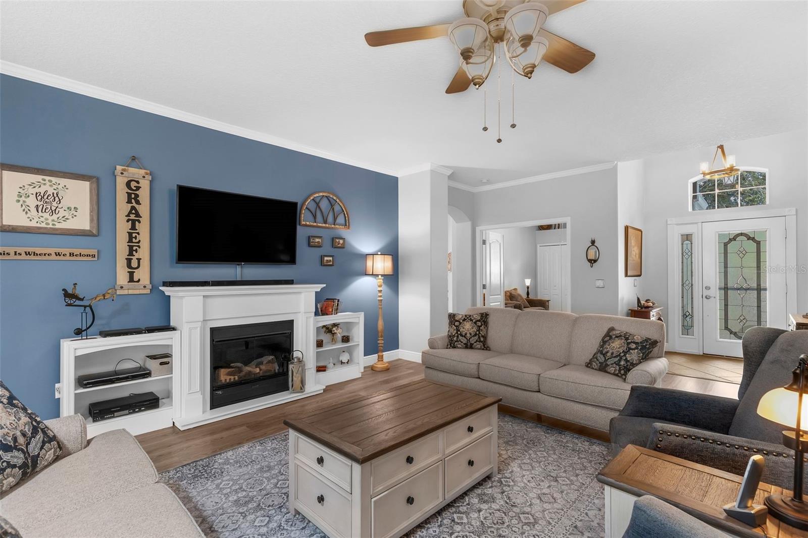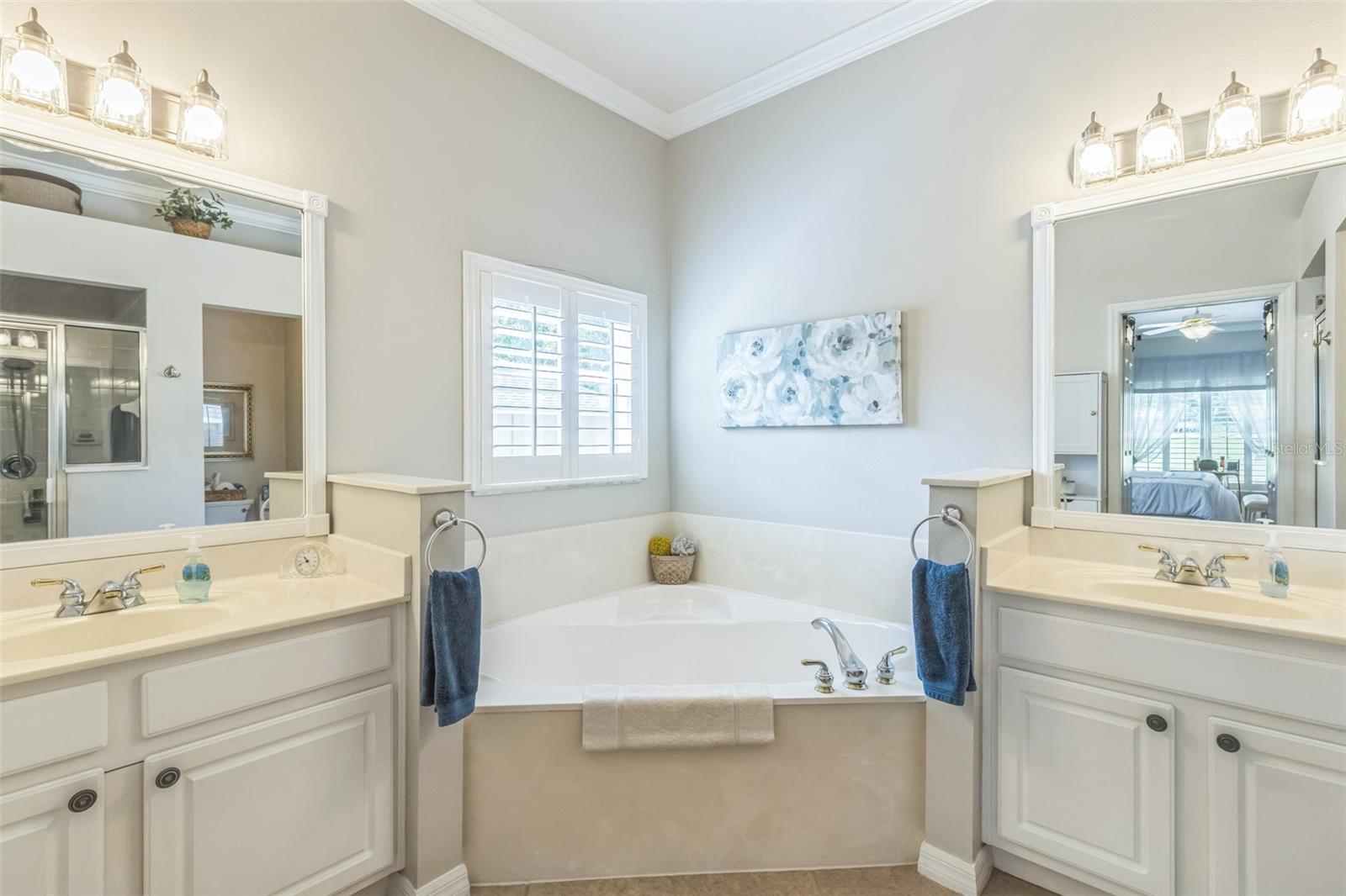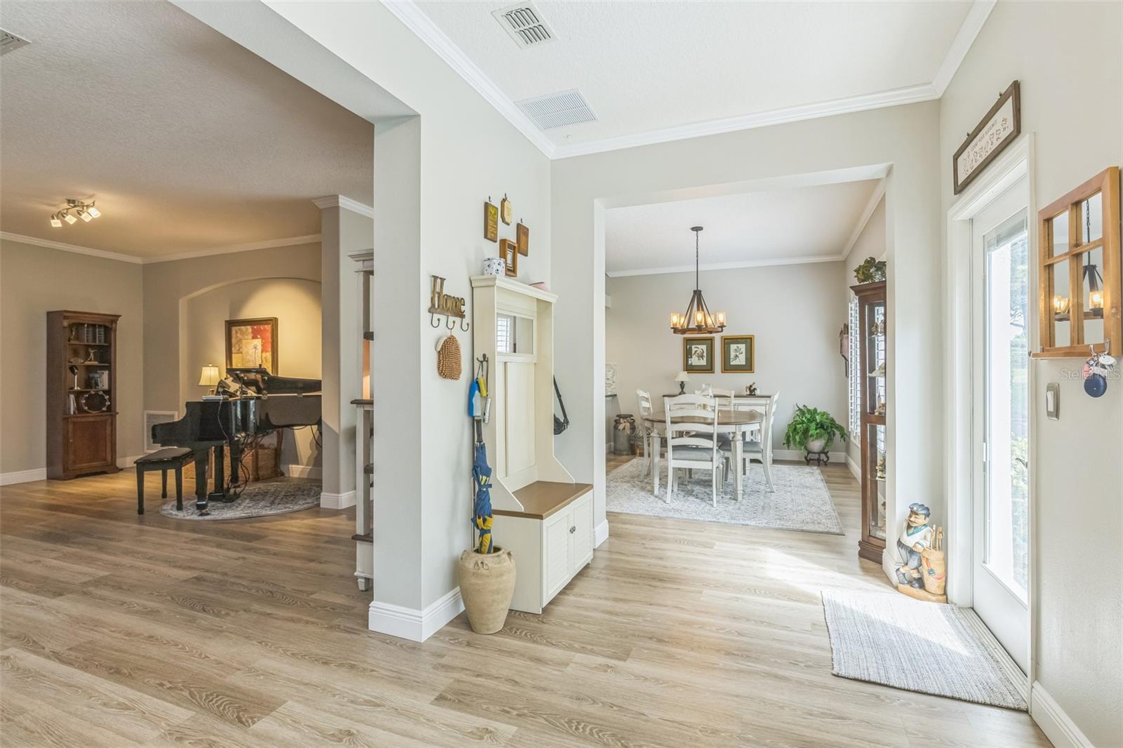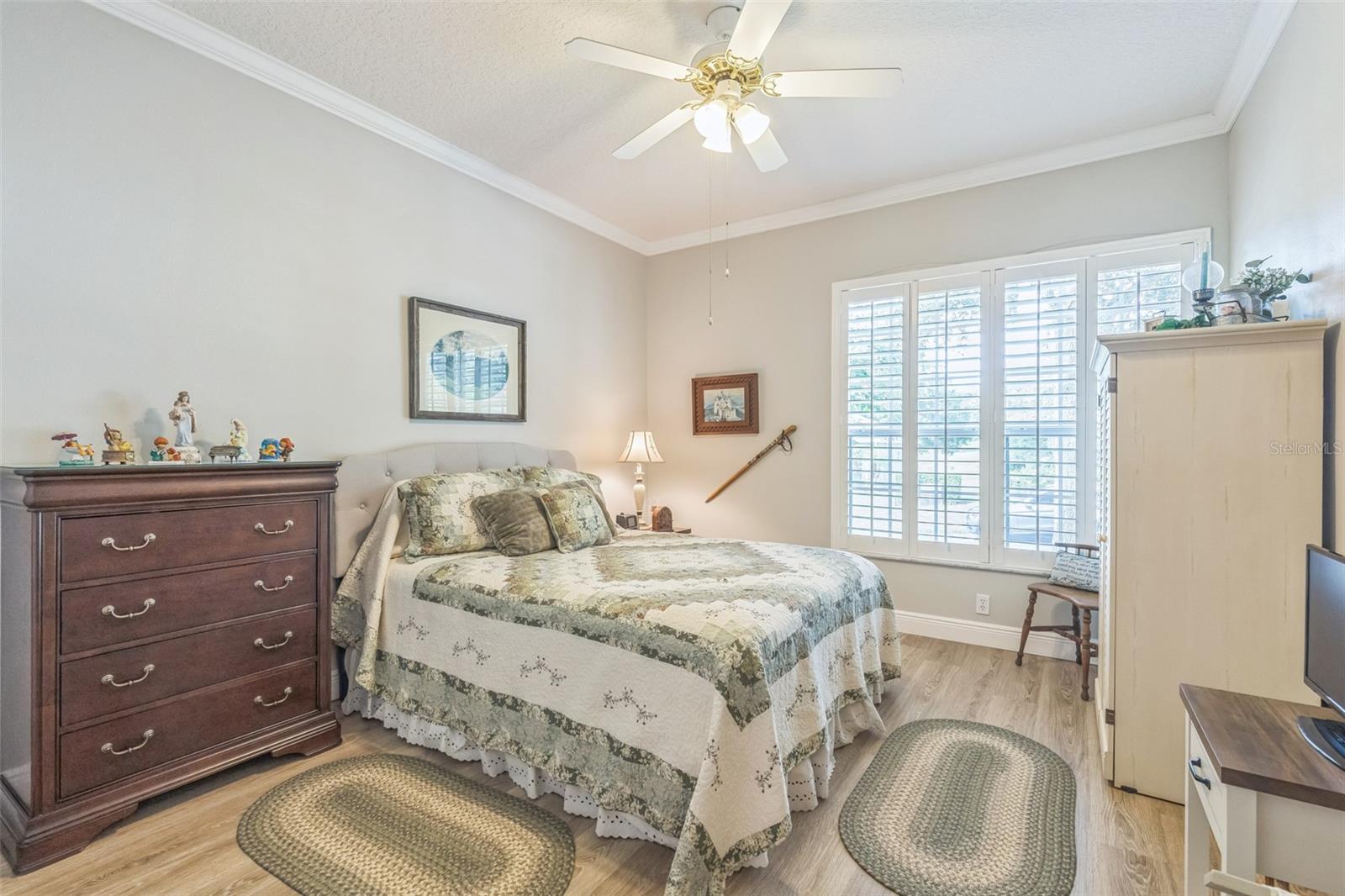 Este plano de piso de St. James, apoiando o 10º tee do Kings Golf Course, está localizado em um belo beco sem saída; Certamente, é obrigatório ver. Esta casa recebe os hóspedes quando eles entram pela atraente porta da frente de vidro chanfrado em um vestíbulo aberto. A planta aberta e dividida permite que muito espaço se reúna e entregue com persianas de plantações por toda parte. The Living room, dining, bedrooms have crown molding, 5 1/4” baseboards. The Family room has a view of the golf course. The Kitchen includes appliances, tile backsplash, granite countertops, under cabinet lighting, corner double pantry with motion detector lighting, tray ceiling and opens to a spacious dining nook. LVP flooring is throughout with tiled bathrooms and with multi shower heads, garden tub, dual Pias do quarto 2 está fora da casa com um armário espaçoso e o piso LVP. Pintura exterior a cada 6 anos, irrigação recuperada, serviço de gramado externo, cabo básico e internet, participou do portão principal, uso de todas as comodidades, como quadras de tênis, pickleball, bola de basquete, tábua de shuffle, banheira de hidromassagem, spa, piscinas, sala de dança, sala de cartão, sala de computadores, biblioteca, salas de artesanato, centers de fitness, salas de baile e muito mais.
