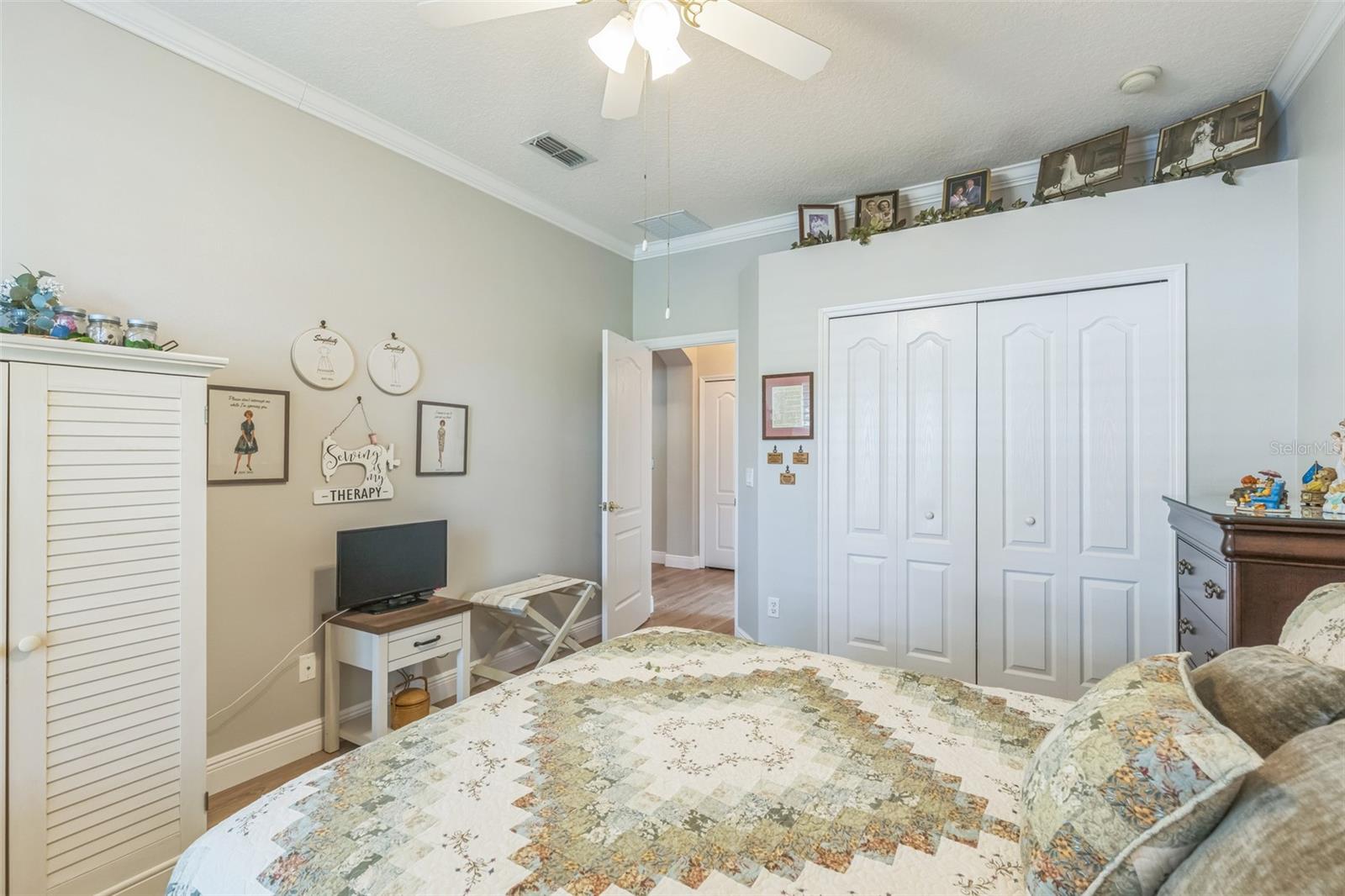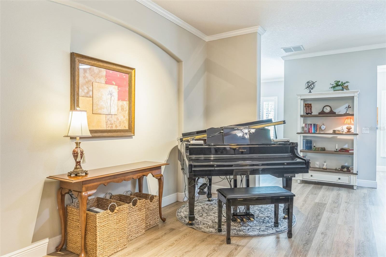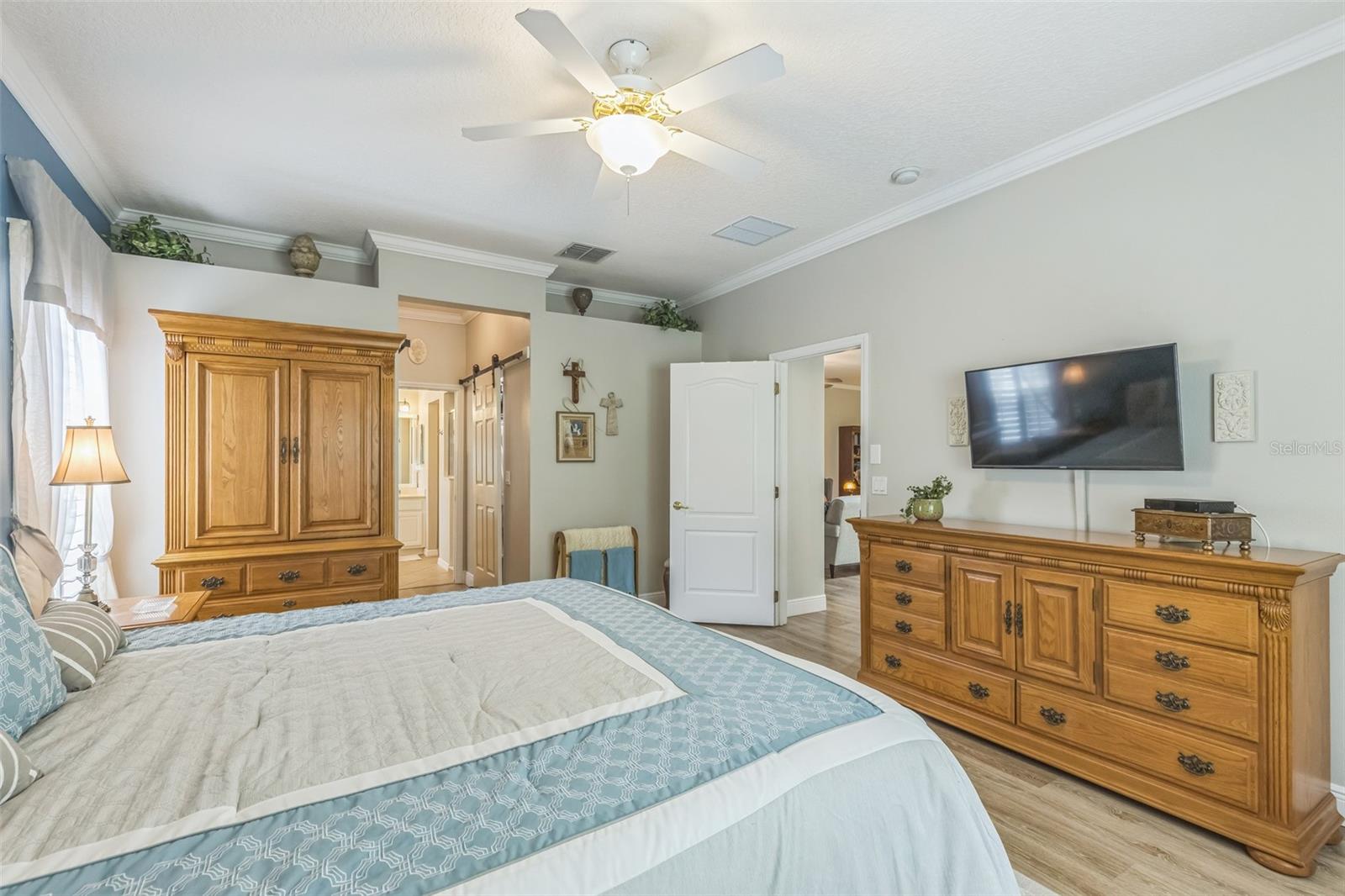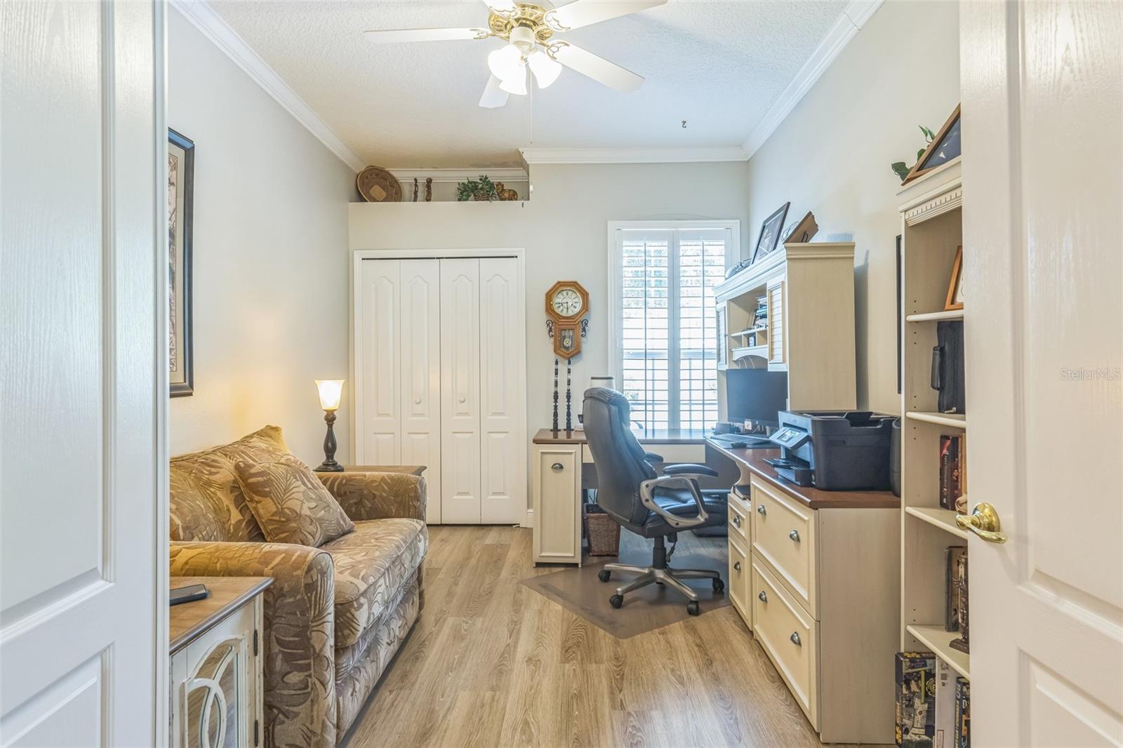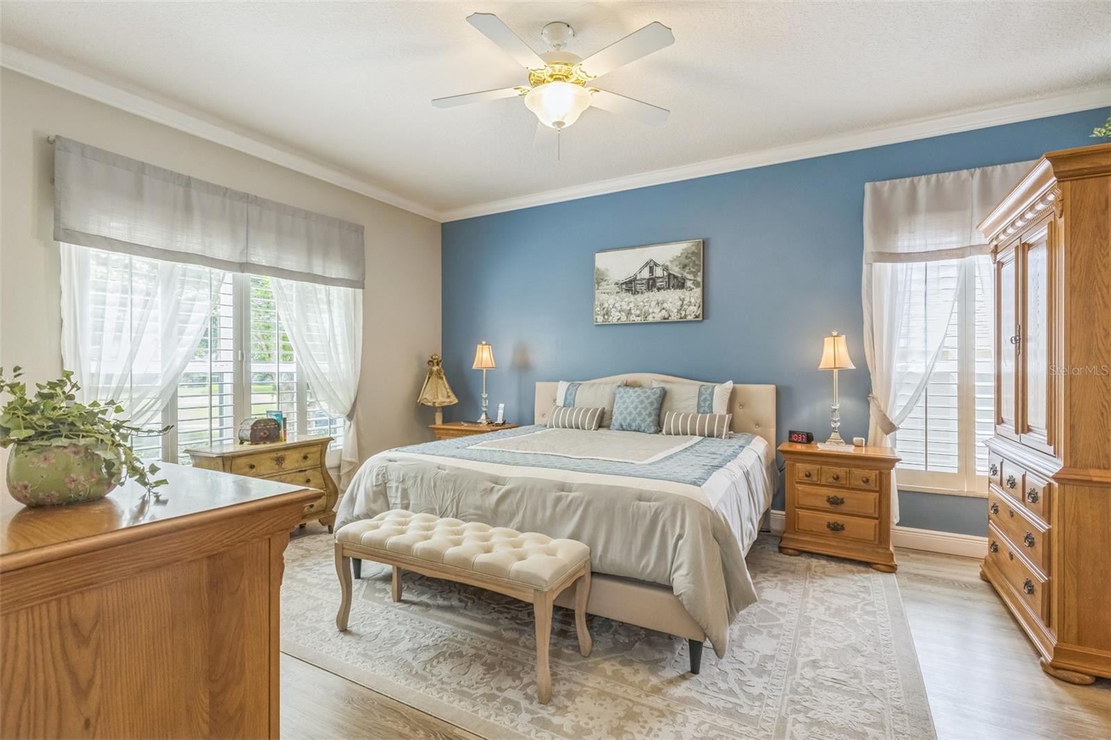 Este plano de piso de St. James, apoiando o 10º tee do Kings Golf Course, está localizado em um belo beco sem saída; Certamente, é obrigatório ver. Esta casa recebe os hóspedes quando eles entram pela atraente porta da frente de vidro chanfrado em um vestíbulo aberto. A planta aberta e dividida permite que muito espaço se reúna e entregue com persianas de plantações por toda parte. The Living room, dining, bedrooms have crown molding, 5 1/4” baseboards. The Family room has a view of the golf course. The Kitchen includes appliances, tile backsplash, granite countertops, under cabinet lighting, corner double pantry with motion detector lighting, tray ceiling and opens to a spacious dining nook. LVP flooring is throughout with tiled bathrooms and with multi shower heads, garden tub, dual Pias do quarto 2 está fora da casa com um armário espaçoso e o piso LVP. Pintura exterior a cada 6 anos, irrigação recuperada, serviço de gramado externo, cabo básico e internet, participou do portão principal, uso de todas as comodidades, como quadras de tênis, pickleball, bola de basquete, tábua de shuffle, banheira de hidromassagem, spa, piscinas, sala de dança, sala de cartão, sala de computadores, biblioteca, salas de artesanato, centers de fitness, salas de baile e muito mais.