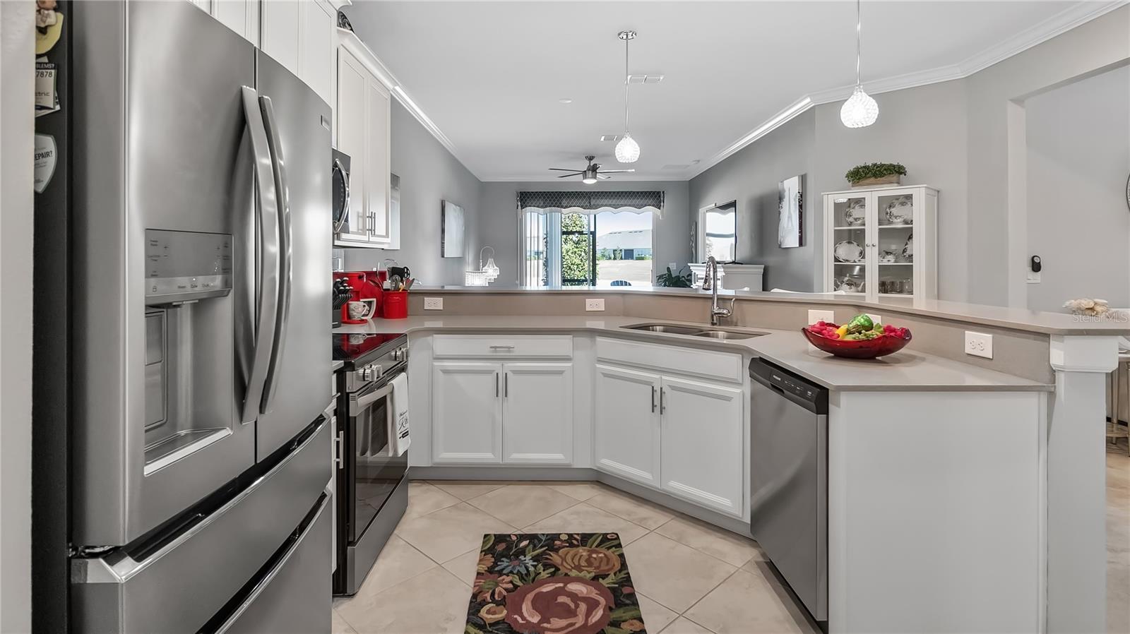 Imaculadamente mantido Villa de 2 quartos/2 banheiros com uma sala flexível na comunidade de 55 Heritage Hills. Planta de piso aberto para entretenimento com moldagem por coroa, tinta interior/exterior fresca e nova iluminação em toda a casa. A sala flexível está pronta para atender às suas necessidades e estilo de vida. Os ventiladores de teto no espaço principal, na sala flexível e na cama combinam com uma aparência consistente e limpa. Mova -se ao ar livre para o adorável rastreado em Lanai e belo pátio de pavimentador extra grande com uma vista tranquila pacífica. A cozinha possui uma bancada espaçosa de quartzo com 2 despensas para armazenamento extra e todos os novos aparelhos. A lavanderia interna convenientemente tem outro armário ao virar da esquina das despensas. Lavadora/secadora não transmitem. O espaçoso quarto primário tem uma grande caminhada no armário e o banho tem pias duplas e uma grande caminhada no chuveiro. Todo o piso principal da área é a telha cerâmica, com os quartos com laminados de madeira à prova d'água. A porta da tempestade frontal traz ao ar livre e a garagem intocada com prateleiras tem piso epóxi que parece fabuloso. Seria necessário caminhar por toda a trilha pela comunidade para listar as tremendas vantagens e comodidades que este HOA incluiu para os proprietários de imóveis desfrutarem !!!