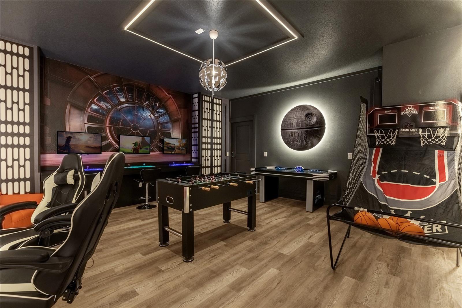 Bem-vindo ao Windsor Island Resort, situado em uma área desejável de Davenport, perto o suficiente para passeios de um dia às atrações próximas, mas escondido para tranquilidade. Esta casa deslumbrante e cuidadosamente projetada com 10 quartos e 8 banheiros acomoda confortavelmente até 23 pessoas, oferecendo espaço e privacidade para todos. Ideal para famílias numerosas, férias multifamiliares ou escapadelas em grupo. Destaques e características: Muitos quartos para que todos possam descansar com conforto; Espaços de estar e jantar em plano aberto proporcionando um centro de encontro acolhedor com uma cozinha totalmente equipada com grande ilha, eletrodomésticos modernos e um layout que permite que vários cozinheiros trabalhem simultaneamente. 4 quartos temáticos, loft temático, sala de jogos Star Wars e cozinha de verão. Interiores elegantes e cheios de luz com tons neutros, linhas limpas e acabamentos contemporâneos criam um ambiente calmo e elegante para você relaxar. Flui facilmente de dentro para fora, tornando-o ideal para café da manhã ou conversas à noite. Móveis cuidadosamente selecionados, decoração de bom gosto e estética coesa elevam a experiência do hóspede. Comodidades: Piscina estilo resort com entrada zero; Rio lento; Toboáguas (duplos); Área de recreação infantil/área de recreação aquática; Banheira de hidromassagem/área de spa; Aloha Clube; Sala de jogos/jogos internos; Academia/academia; Café, lanchonete ou restaurante/bar/tiki bar no local; Fogueiras/área de fogueira (muitas vezes com vista para fogos de artifício); Quadras esportivas: basquete, vôlei de areia; Minigolfe (9 buracos); Quadras Cornhole, shuffleboard, jogos ao ar livre; Jardim com redes, área para piquenique, áreas ajardinadas/de estar; Condomínio fechado com segurança 24 horas; Serviço de manobrista (para hóspedes de casas alugadas); Áreas externas para churrasco/churrasqueira.