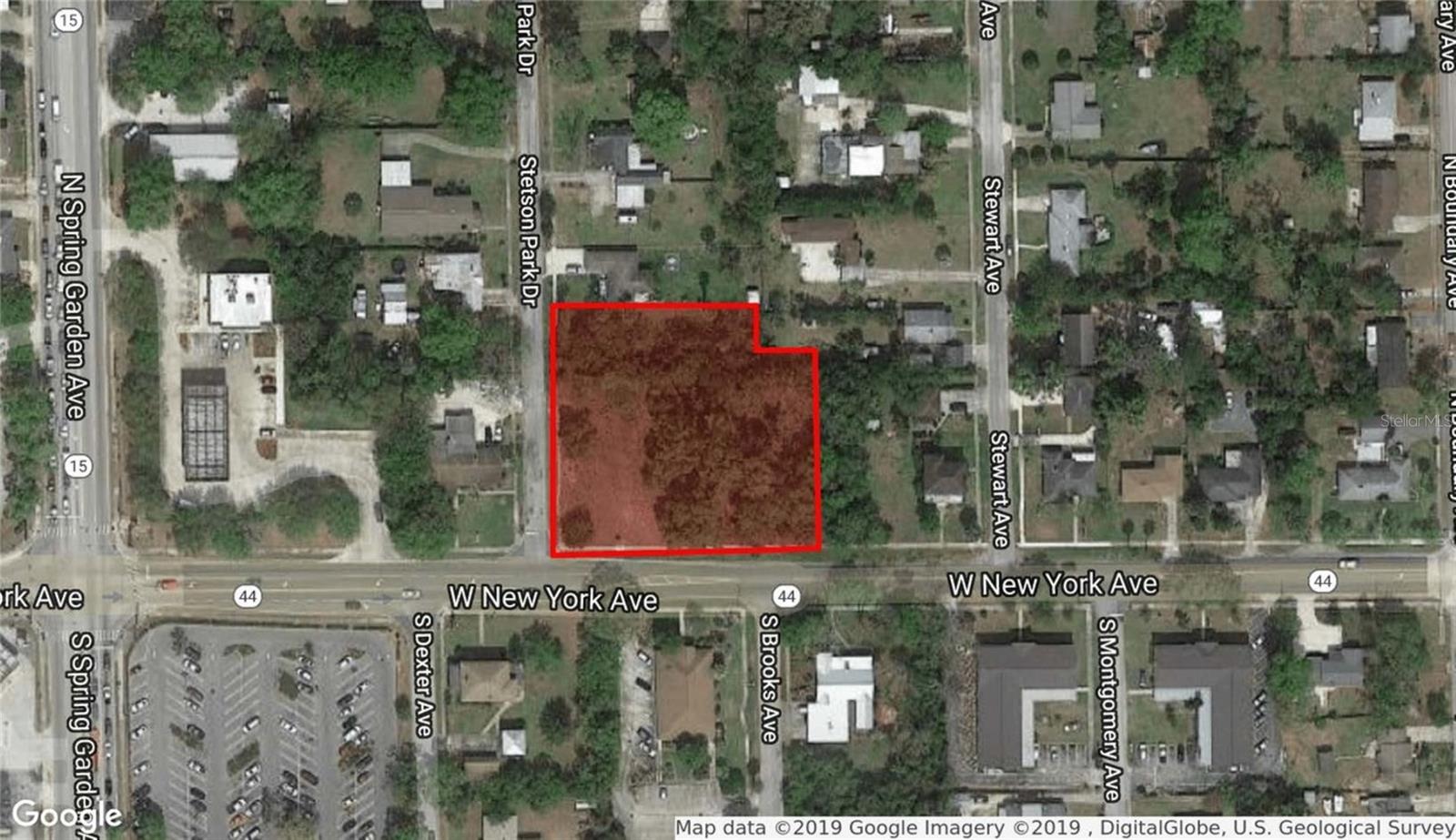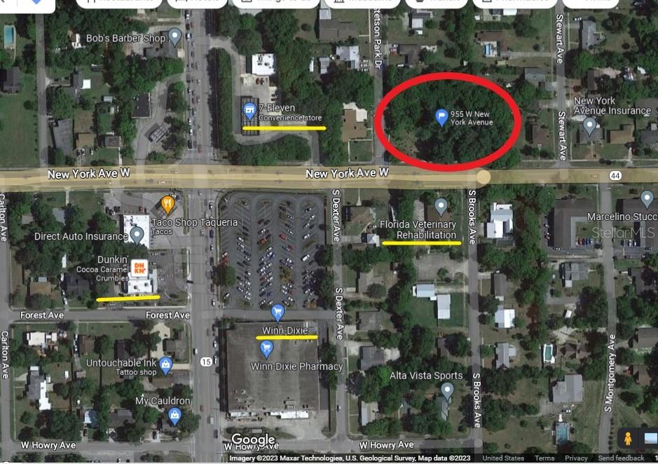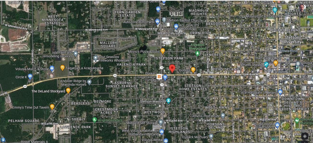Outra REDUÇÃO DE PREÇO 1,34 acres +/- de terreno baldio na cidade de DeLand com 265 pés +/- de frente direta para a estrada na movimentada West New York Avenue / State Road 44. Zoneamento P-1 (Distrito Residencial Profissional) permite General/ Consultórios Profissionais, Instituições Financeiras, Consultórios Médicos, Drogarias e Farmácias, entre outros usos. A futura designação de uso do terreno é Mista Escritório/Residencial. Esta localização central de DeLand fica a 3 km +/- do novo local da estação SunRail Deland e a 1,6 km +/- do centro histórico de DeLand e da Universidade Stetson. Lote de esquina com entrada/saída na rua lateral Stetson Park Dr e W New York Ave/Hwy 44.