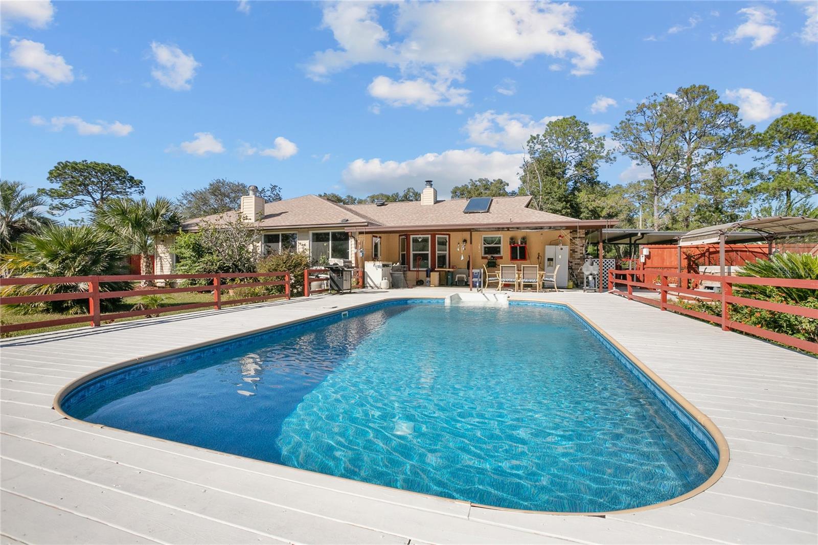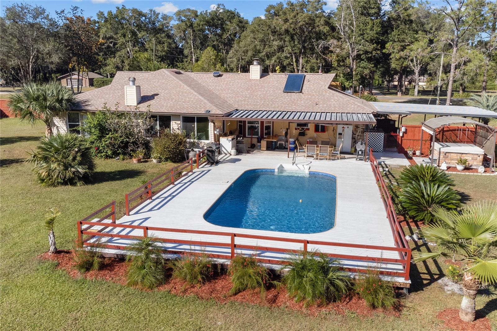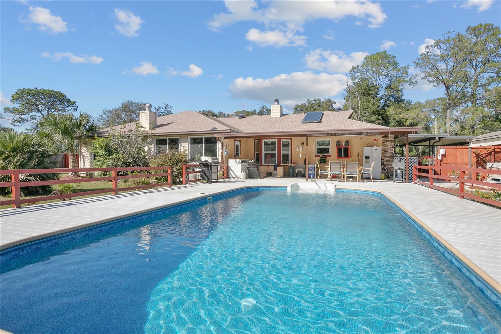 Telhado substituído em 2021, HVAC e aquecedor solar de água instalados em 2015, fossa séptica bombeada em 2020. Confira este paraíso privado em uma propriedade de 1,8 acres meticulosamente mantida! Esta casa de 3 quartos, 3 banheiros e 2.562 pés quadrados possui duas suítes master, perfeitas para viver multigeracionais ou receber hóspedes. Relaxe na piscina cintilante com deck de madeira pintada ou aproveite a abundância de seu próprio pomar de frutas cítricas com limoeiro Meyer, oliveira e laranjeira. Tudo dentro de um quintal totalmente cercado para privacidade e segurança dos seus animais de estimação. No interior, mantenha-se fresco e confortável com isolamento de barreira radiante e isolamento de sótão adicional de 18". Armários recentemente reformados pela Excalibur adicionam um toque de elegância à cozinha, enquanto um novo forro de piscina, bomba e filtro garantem diversão sem preocupações no quintal Relaxe na relaxante banheira de hidromassagem ou aconchegue-se perto do fogão a lenha, que libera calor por toda a casa. Os recursos adicionais incluem um novo telhado instalado em abril de 2021, fossas sépticas duplas e uma conveniente conexão para RV de 50 A. Um espaçoso anexo de 26' x 20' com uma garagem anexa de 12' x 23' oferece amplo armazenamento, espaço para hobby ou uma oficina. Esta propriedade excepcional oferece a combinação perfeita de privacidade, conforto e funcionalidade. Agende sua exibição hoje e experimente o que há de melhor no estilo de vida da Flórida!
