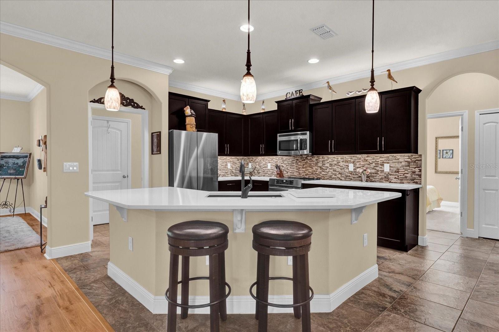 Mantido impecavelmente e bem atualizado, esta casa deslumbrante oferece uma bela vista para a lagoa e está realmente pronta. Bem-vindo ao 320 W Victoria Trails Blvd na procurada comunidade Victoria Trails Community of Victoria Park. Aninhado ao longo de uma das trilhas cênicas de exercícios, esta propriedade oferece vistas pitorescas e uma oportunidade de assistir a vida selvagem pacífica, perfeita para os entusiastas de observação de pássaros e aqueles que apreciam um cenário parecido com um parque. Apresentando 4 quartos, 2 banheiros, uma garagem de 3 carros e quase 2.500 m². Ft. De espaço vital, este lar mostra várias atualizações importantes, incluindo pisos de tábuas de vinil de luxo (2024), bancadas de quartzo (2024), carpete novo nos quartos 2-4 (2024) e moldagem de coroa por toda parte. Ao entrar, você será recebido por uma planta piso de conceito aberto que integra perfeitamente espaços dedicados para refeições formais e uma sala/estudo de bônus separado, oferecendo o equilíbrio perfeito entre layouts abertos e tradicionais. A cozinha atualizada possui utensílios de aço inoxidável mais recentes, uma pia profunda da fazenda, bancadas de quartzo e iluminação sobre o gabinete. Opcionalmente, existe uma conexão de gás natural disponível na parede, mas a linha elétrica atual apresenta opções de indução, convecção e fritadeira de ar, enquanto o amplo layout da cozinha oferece amplo espaço para entretenimento. Projetado para uma vida sem esforço para fora, a casa possui uma porta de pátio com controle deslizante triplo, levando a um lanai estendido, onde você pode desfrutar do meticulosamente mantido no quintal adornado com arbustos vibrantes e florescendo nos meses de primavera e verão. A espaçosa suíte primária possui um teto de bandeja, acesso privado ao pátio, armários duplos e um banheiro privativo completo com uma banheira de jardim, chuveiro separado e vaidades duplas. A planta baixa da casa garante a privacidade, com os quartos 2-4 localizados no lado oposto da casa. O segundo banheiro é generoso e também fornece acesso conveniente ao pátio. Localizado em Victoria Trails, dentro da vibrante comunidade Victoria Park de DeLand, esta casa oferece fácil acesso à I-4 e fica a apenas 30 minutos para New Smyrna Beach, com a Disney e a Universal a menos de uma hora de distância. A baixa taxa HOA inclui TV a cabo, Internet de alta velocidade, irrigação de gramado e acesso a vários pools comunitários e centros de fitness. Agende sua exibição particular hoje!