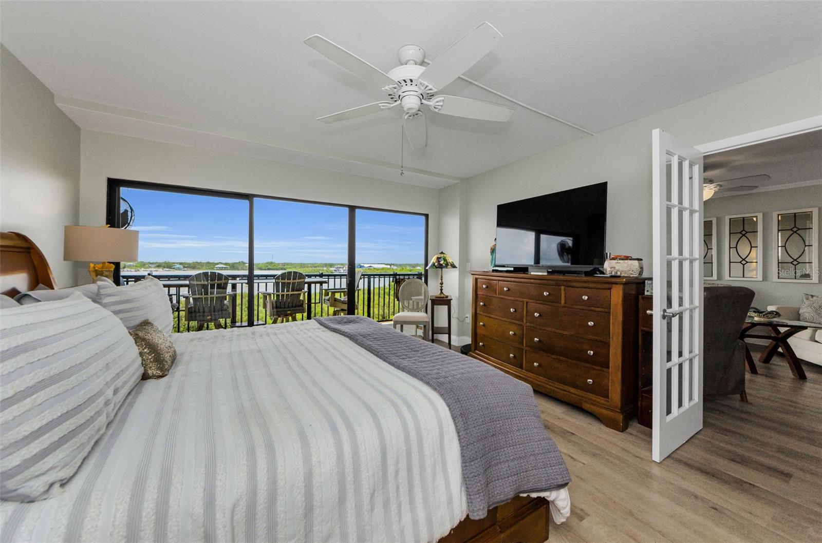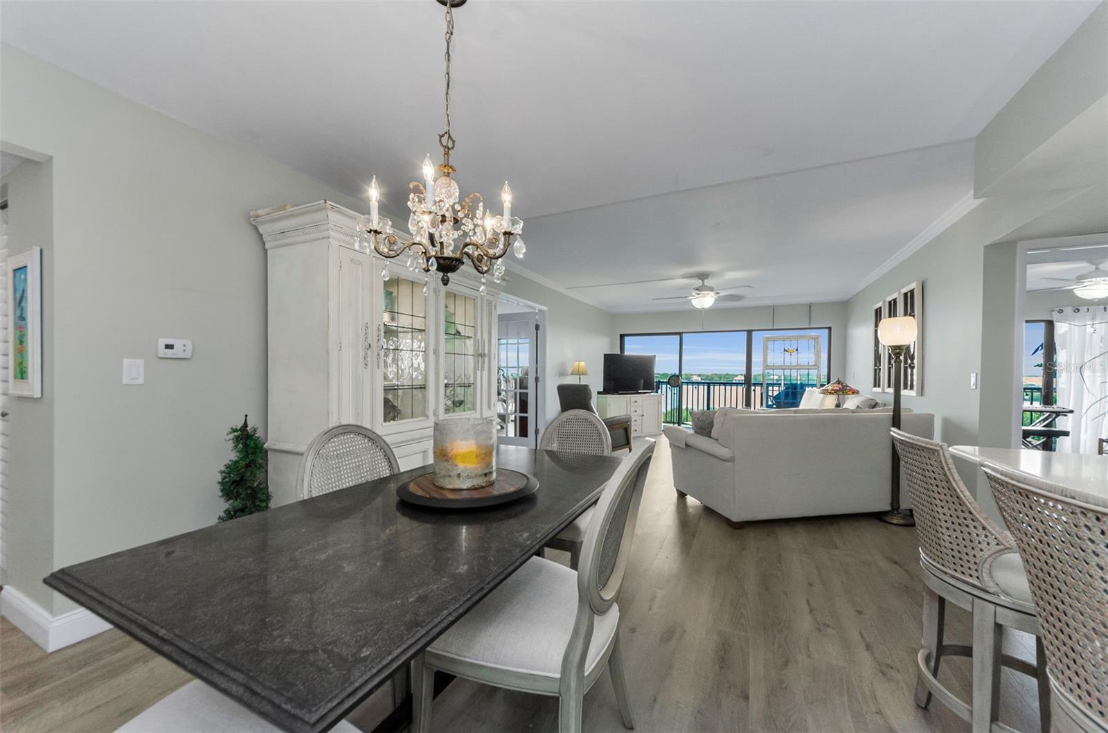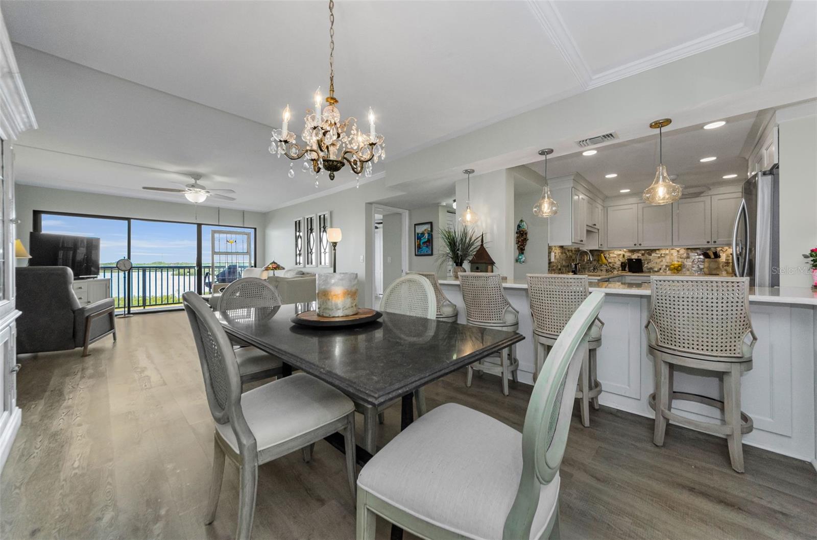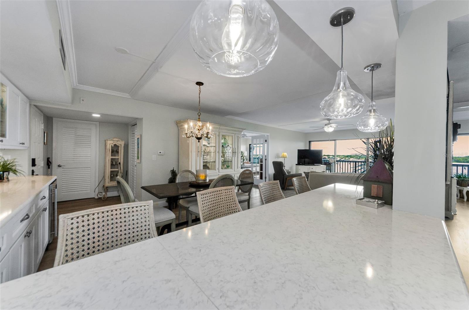 A vida à beira -mar no seu melhor! Pôs espetaculares, brisa relaxante e seus próprios desfiles de barco e golfinhos! Condomínio da unidade de canto do 5º andar com o verdadeiro espaço de vida ao ar livre e 240 pés quadrados em torno da varanda com vistas para o nascer e o pôr do sol. .. E fica melhor ... Plano de quarto dividido verdadeiramente reconfigurado e atualizado com cozinha aberta, 12 pés de assento de balcão aberto com barra seca/área de servir de comprimento total e geladeira embutida. Passe pelas portas duplas para a sua suíte primária em tamanho king com seu amplo banho privativo e uma parede de vidro deslizante que também sai para a varanda (os dois quartos fazem!). E para os hóspedes, um segundo quarto com uma bela cama Murphy embutida que é facilmente usada como um escritório. Você escolhe, está aqui ... granito, inoxidável e piso de vinil de luxo, iluminação embutida, sua lista de desejos foi concedida! Tudo isso em um estilo de segurança elevado de estilo moderno, com estacionamento em prédio. Praia privada do local no local, parque à beira-mar com chuveiros e churrasqueiras, clube à beira-mar, prateleiras de caiaque, piscina aquecida, quadra de tênis/pickleball e um edifício de recreação completo com bilhar, equipamentos de fitness, biblioteca e muito mais. Precisa de mais?- do outro lado da rua da trilha Pinellas e bloqueios curtos para Dunedin Causeway, Dunedin Golf Club, Publix, Restaurantes ... Pegue o "Jolly Trolley" para o centro de Dunedin Food e MicroBreweries, ou as dicas de três vezes, o primeiro ano, o primeiro ano, o primeiro ano.