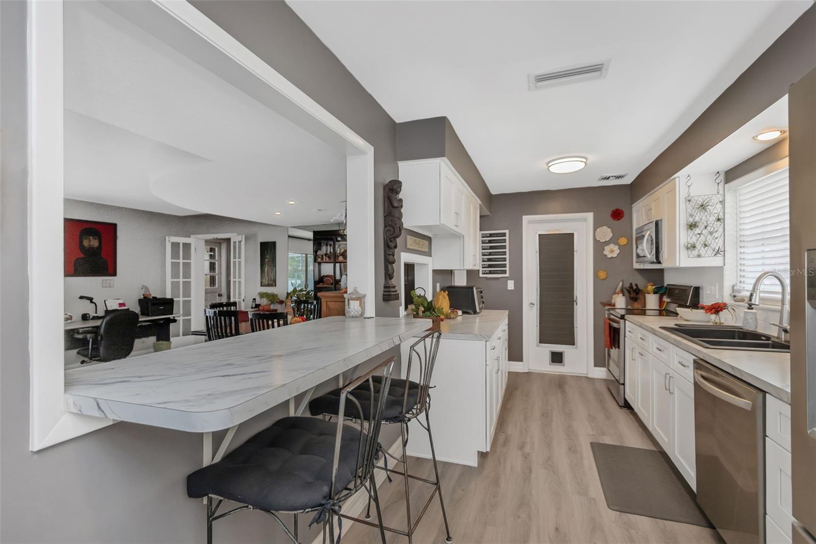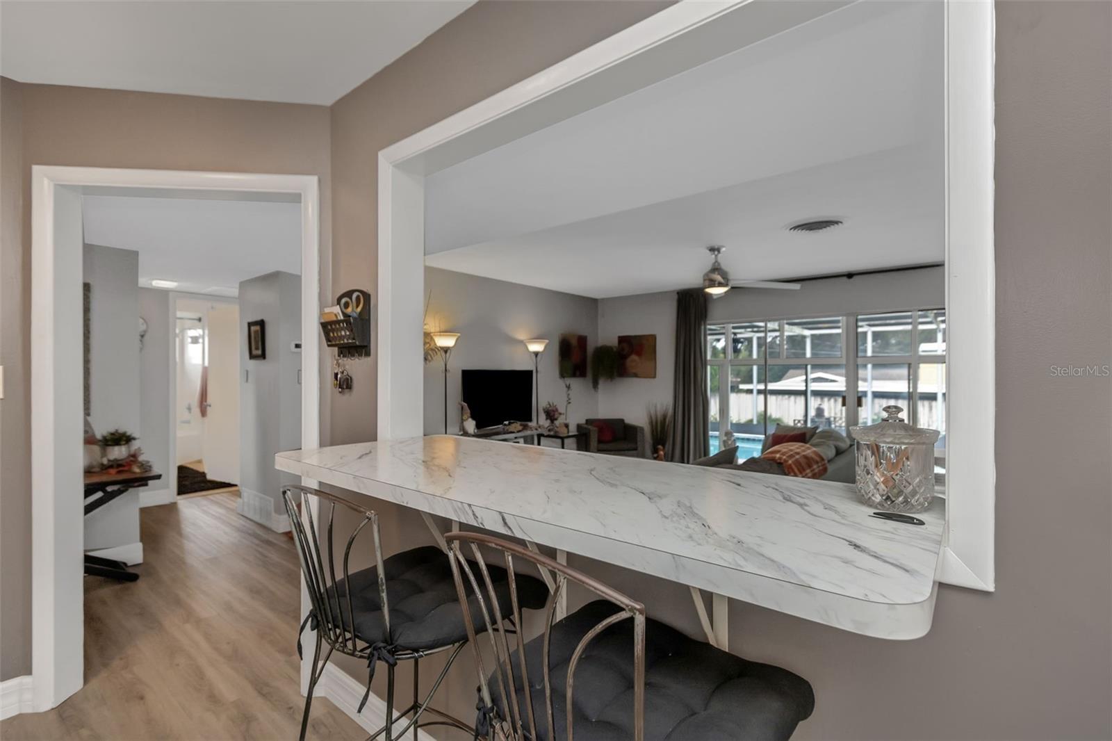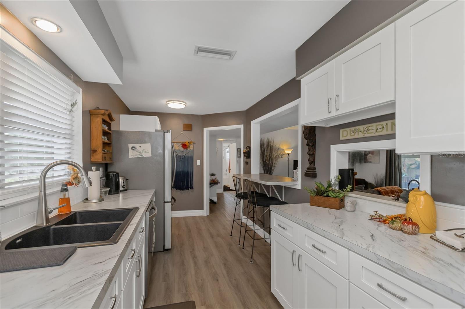 Bem -vindo ao Fairway Estates! Esta popular comunidade de Dunedin fica na zona do carrinho de golfe e fica a cerca de 800 metros do Dunedin Golf Club, Highlander Park, Hammock Park, Pinellas Trail e Dunedin Causeway. Esta casa lindamente mantida possui 3 camas, 2 banheiros, 1 garagem para carros, uma grande sala de Flórida fechada e uma exibição em Lanai com piscina. Dentro, você encontrará um layout de plano dividido com a sala de estar e a cozinha de passe no meio. A sala de estar é leve e brilhante, com pisos mais recentes em toda a sala de estar principal. A cozinha foi atualizada com armários de estilo suave e de perto e aparelhos mais novos. Isso deixa algumas atualizações, como os banheiros e a área da piscina, para o novo proprietário adicionar seu toque pessoal. Dois quartos e um banho no lado esquerdo da casa, enquanto a suíte master fica à direita. Observe que o quarto principal está no mesmo nível que o Lanai, então há 2 etapas para baixo nele. Ele também tem sua própria entrada do convés traseiro, para que possa ter potencial como uma suíte de sogros. As portas de vidro deslizantes da sala de estar são uma enorme sala da Flórida com todas as janelas de vidro e controles deslizantes. Em seguida, as portas de vidro deslizantes da sala da Flórida são um grande lanai com uma piscina. Ou você pode procurar remover todos os controles deslizantes à beira da piscina para criar uma área aberta incrivelmente grande com inúmeras oportunidades (cozinha ao ar livre?). O espaço divertido se estende da Lanai para o convés, que seria um local perfeito para uma área de conversa em torno de um pico de incêndio. O restante do cercado no quintal, e há muita coisa, está cheia de paisagismo delicioso e maduro e uma grande área gramada para jogos, um jardim ou (preencha o espaço em branco). Sem HOA e não em uma zona de inundação !! ** TELHO 2018 ** A/C 2018