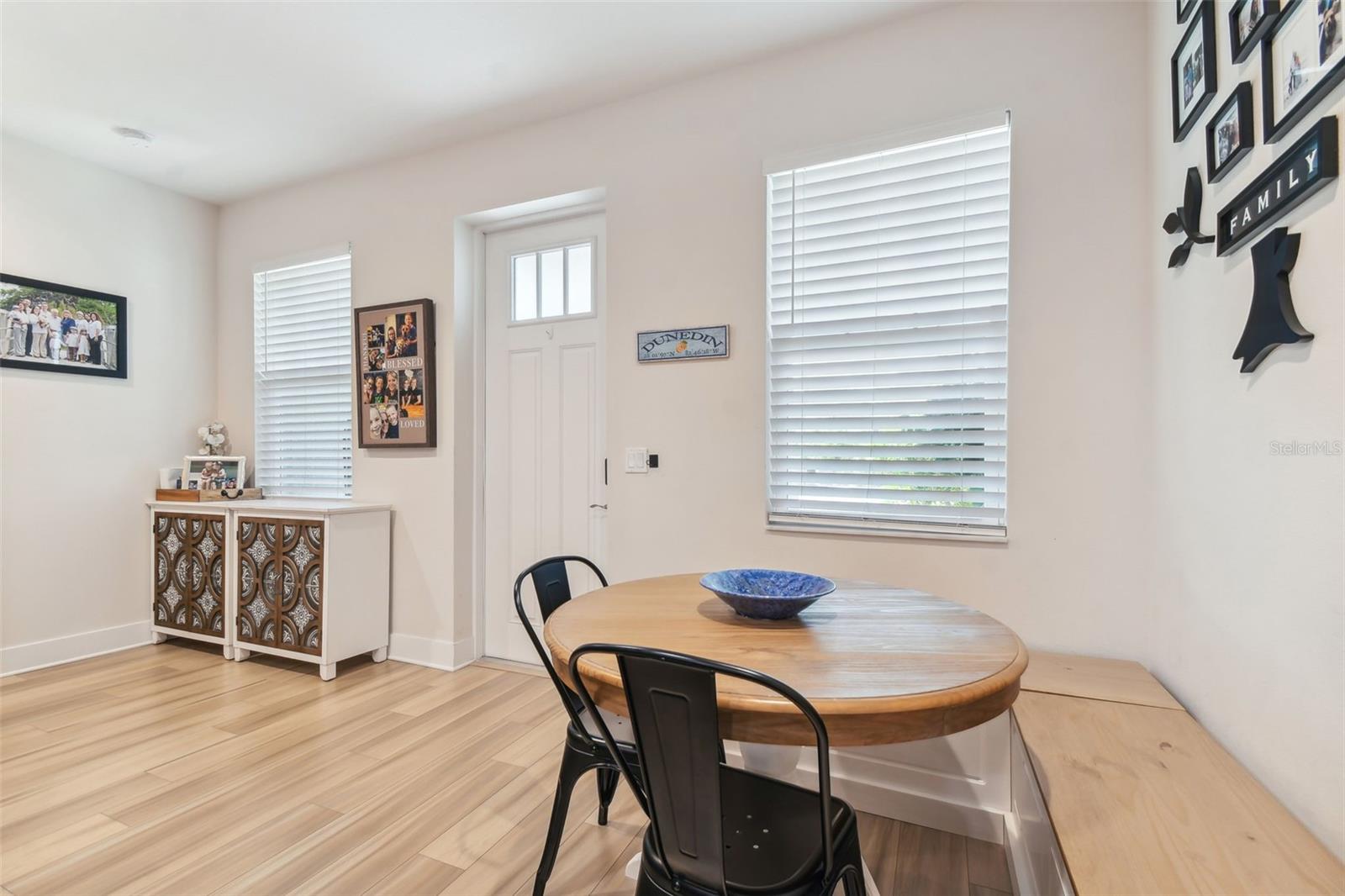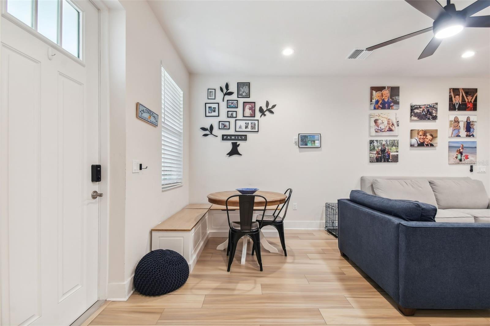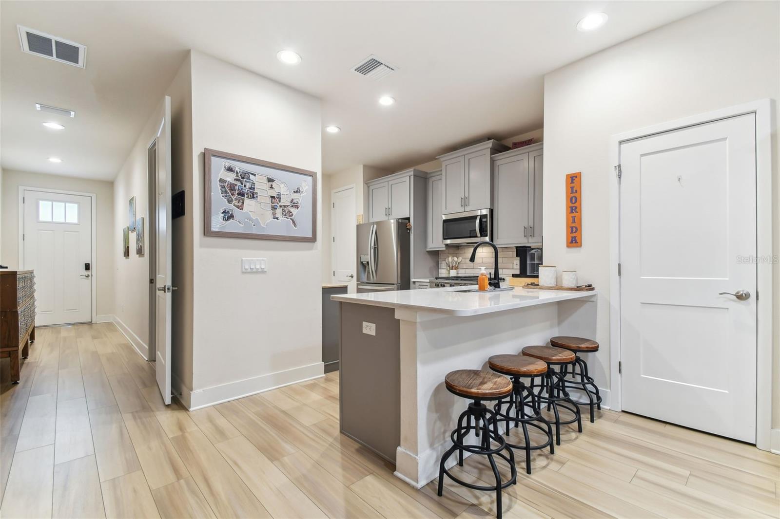 Bem no coração de Dunedin, você encontrará 414 Finn Way. Este modelo Phineas B foi criado por DiGiovanni na comunidade de Townhomes em Highland Crossing. Esta propriedade lindamente mantida possui 3 quartos espaçosos e 2 banheiros e meio. Entre para descobrir uma planta baixa iluminada e aberta, com pé-direito no primeiro andar de mais de 2,7 metros. As atualizações incluem pisos de vinil de luxo em todos os 1.886 pés quadrados. residência urbana. A cozinha gourmet é equipada com bancadas de quartzo, azulejos de metrô, eletrodomésticos de aço inox, fogão a gás, armários todos de madeira com fechamento suave. A área de jantar e a sala de estar adjacentes criam um fluxo contínuo. Varandas cobertas recebem os hóspedes pela entrada frontal ou traseira. Retire-se para o amplo quarto principal com closet e banheiro privativo luxuoso com pia dupla. Dois quartos adicionais compartilham um elegante banheiro completo. O armário da lavanderia também está convenientemente localizado no segundo andar. Estacione o carrinho de golfe na garagem anexa para dois carros. As janelas resistentes a impactos e sem preocupações atendem ao Código da Flórida. Esta moradia quase nova verifica todas as caixas. Venha desfrutar de Dunedin com um cenário artístico vibrante, lojas, restaurantes, festivais sazonais e mercado de produtos agrícolas.