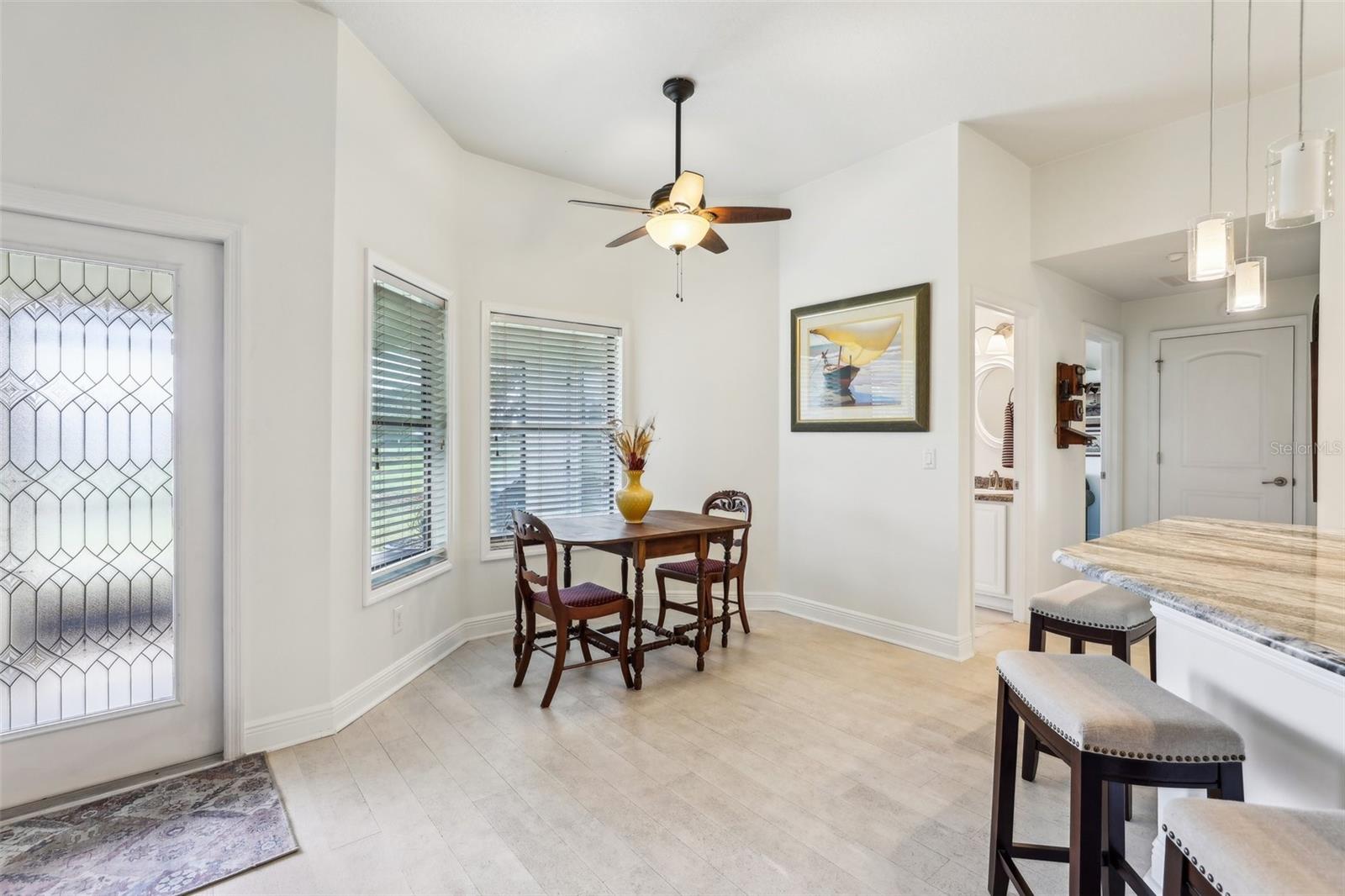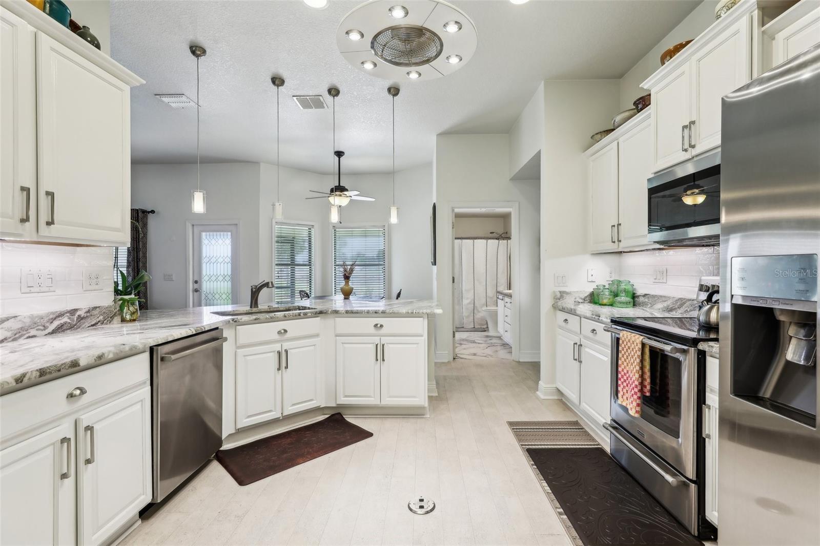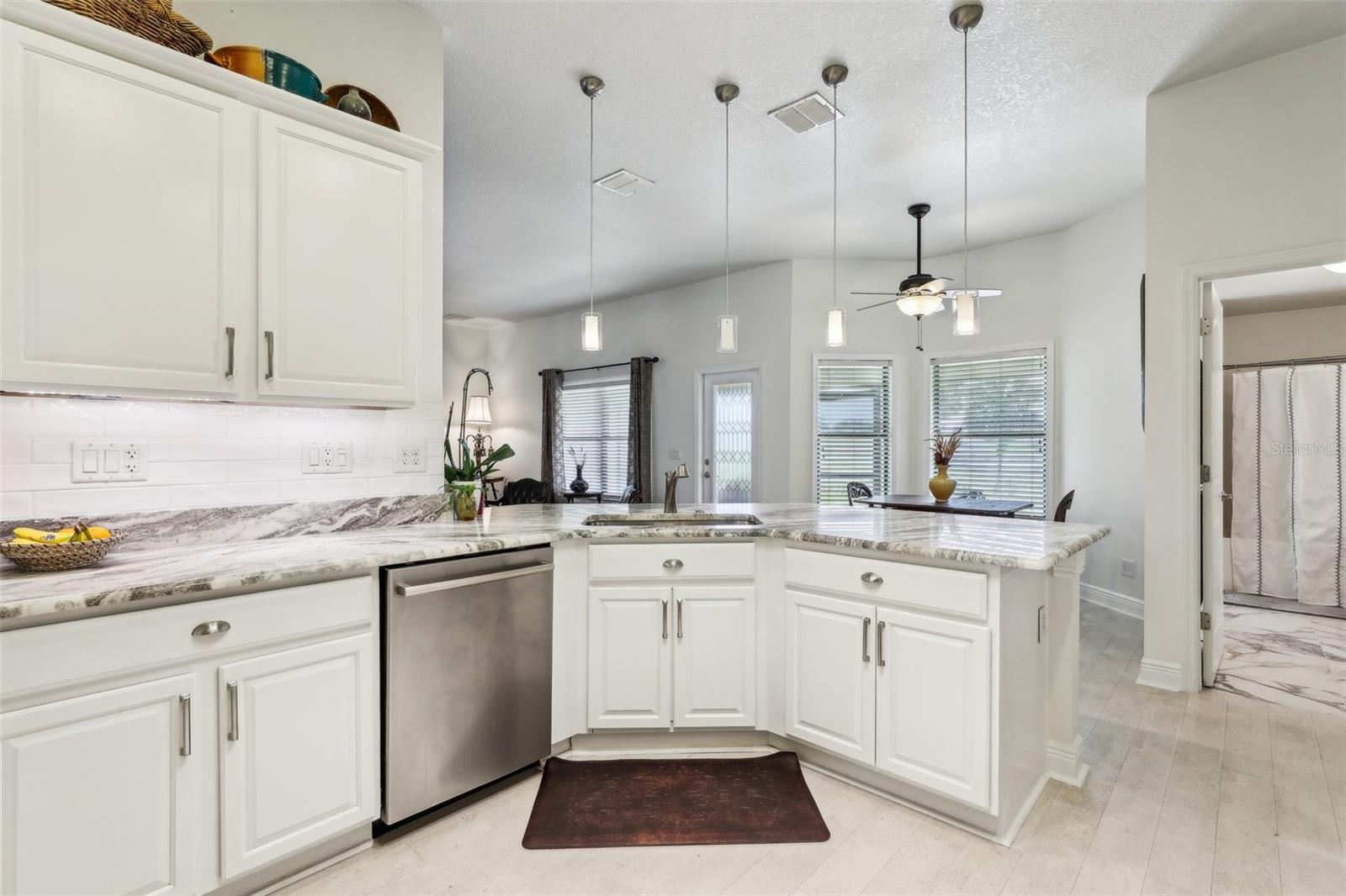 Localizado no 18º verde, desfrute do pôr do sol e vistas para a água na vila da comunidade de golfe de urso preto. Esta casa teve reformas recentes de reformas recentes de 25 de abril de 25 de abril com balcão de granito e backsplash, além de vendedores que fornecem garantia doméstica da AHS para o comprador. Outras atualizações incluem; Pintura interior por toda parte, ladrilho de cerâmica novo do banheiro, novos acessórios, paisagismo inteiro, novo pátio de pavimentador na frente, caminhada de pavimentação prolongada e vínculo/pátio nas costas com nova tela, nova sala de estar e fãs de quartos principais, cortinas de janelas e tons de janela, construídas personalizadas em prateleiras em quarto, que é perfeito para a biblioteca, escritório ou sala de salgadinhos. This is a "Florida Energy Services efficient home which includes 80-gallon water heater, Energy Star Windows, attic vents. The kitchen is centrally located for ease of entertaining and includes lots of storage, pantry, stainless steel appliances, and an additional eat in area. When entertaining a larger crowd, this home features additional open dining room off the great room. The split plan has large Master Suite includes ensuite bath, garden spa tub, step in shower, dual vanities, and Grandes armários duplos Esta casa tem tetos altos, trazendo a luz natural para desfrutar da nova paleta de cores naturais. Dora Shopping, teatro, entretenimento e restaurantes, parques e marina para passeios de barco e muitas atividades.