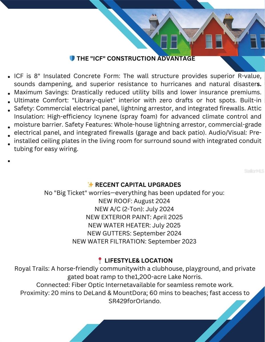 Privadamente escondido atrás de um acre fechado e totalmente cercado cercado por árvores maduras, este ICF (Forma de Concreto Isolado), propriedade pronta para uso totalmente mobiliada em Royal Trails oferece a rara combinação de construção de alto desempenho, espaço amplo e tranquilidade campestre refinada, tudo aprimorado por grandes atualizações recentes, incluindo um novo telhado, ar-condicionado de 2 toneladas e calhas (2024), pintura externa e aquecedor de água (2025) e um sistema de filtragem de água para toda a casa (2023). Esta planta dividida tem 5 quartos, 4,5 banheiros, tetos altos de 10 pés na casa e na garagem, e uma enorme varanda frontal com tela e carpete de 61 'x 10'. No interior, o piso laminado com aspecto de madeira flui pelas principais áreas de estar. Do hall de entrada, uma sala de jantar formal com uma grande janela frontal fica à direita, e à frente fica a espaçosa sala de estar e copa, onde estantes embutidas e portas francesas se abrem para a varanda traseira. A cozinha do chef é elegante e funcional, apresentando uma ilha enorme que funciona como balcão para café da manhã, balcão abundante, armários moldados em forma de coroa incluindo detalhes em vidro, eletrodomésticos de aço inoxidável, pia dupla e uma despensa de 7' x 6'. A suíte principal é um verdadeiro retiro, repleta de luz natural e vistas tranquilas. Closets duplos grandes complementam um banheiro inspirado em spa com piso frio, pias duplas com estação de maquiagem sentada, banheira de hidromassagem sob uma janela iluminada pelo sol, chuveiro amplo e toalete privativo. Cada quarto adicional é de tamanho generoso, incluindo um segundo quarto com banheiro privativo e closet, um terceiro e quarto quartos com armários embutidos e espaços recortados ideais para um escritório doméstico ou área de hobby, e um quinto quarto que se destaca como uma suíte flexível com sua própria entrada externa privativa e banheiro privativo com chuveiro embutido - ótimo para residências multigeracionais, convidados, pais idosos ou um negócio doméstico, permitindo que os clientes entrem sem passar pela casa. A lavanderia grande de 24 'x 7' oferece armários embutidos, janelas para luz natural e lavadora e secadora de aço inoxidável com carregamento frontal. Entusiastas de carros e amadores apreciarão a excepcional garagem para três carros com mais de 1.300 pés quadrados. A seção para 2 carros tem 29' x 24' forrada com prateleiras embutidas, com o terceiro compartimento adicional de 21' x 24' com um espaço de oficina dedicado completo com bancadas de trabalho e áreas de mesa. Além disso, há um depósito para equipamentos de gramado de 12' x 11' com acesso próprio à porta da garagem; incluídos na venda estão o cortador de giro zero junto com ferramentas elétricas e ferramentas de jardim. Construída com construção em concreto isolado, esta casa oferece resistência superior a furacões, maior durabilidade, menores custos de serviços públicos, proteção contra raios, um painel elétrico de nível comercial, um gerador portátil duplo a gás/GLP de 12.000 watts, projetado para fornecer energia elétrica como fonte de energia de backup durante quedas de energia e firewalls integrados - oferecendo tranquilidade raramente encontrada na construção tradicional. Localizados dentro da comunidade Royal Trails, permitindo até dois cavalos por acre, os residentes têm acesso a um clube, playground, rampa de barco privada para o Lago Norris de 1.200 acres e internet de fibra óptica. Convenientemente posicionada a aproximadamente 20 minutos de DeLand e Mount Dora, a cerca de 60 minutos das praias da costa leste da Flórida e com acesso direto à SR 429 para Orlando, esta propriedade oferece privacidade, desempenho e flexibilidade de estilo de vida sem sacrificar a conectividade.