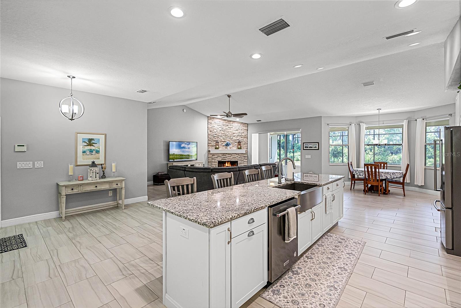 Este belo complexo insular ocupa uma área de quase 12 acres no meio do Lago Pine Island. A ilha tem apenas seis locais para morar, então, no minuto em que você atravessa a ponte e serpenteia pelos ciprestes cheios de musgo em Skylark Lane, você se sente como se estivesse voltando para casa, para um retiro particular. A moderna fazenda de 6 quartos foi completamente atualizada e oferece uma planta aberta com piso de cerâmica (sem carpetes aqui), acessórios contemporâneos e uma aconchegante lareira de pedra. A ampla cozinha possui bancadas de granito, eletrodomésticos de aço inoxidável, uma copa e uma enorme ilha com assentos no balcão. Esta cozinha tem tanta arrumação que alguns armários podem ficar vazios depois de se mudar! Ao lado da sala de estar, você pode preparar o jantar na varanda arejada, com muito espaço para entreter no recinto protegido. A varanda da frente também seria um local agradável para o café da manhã. O quintal se estende até o lago através de um calçadão de 176 pés. O incrível deck no final do calçadão conta com serviço de água e eletricidade, além de dois elevadores de jet ski. A propriedade também inclui um galpão de armazenamento de grandes dimensões, deixando espaço na garagem para 3 carros para seus brinquedos do lago, carros e uma oficina. Quando você entra em casa pela garagem, um conveniente mudroom/drop-zone e uma lavanderia completa o recebem para recolher todos os seus sapatos, jaquetas e bolsas. O quarto principal de canto possui um banheiro tipo spa com closet, pias duplas, W/C e um enorme chuveiro personalizado com chuveiro com efeito de chuva. Armazenamento em abundância também! Do outro lado da planta baixa, há três quartos de hóspedes e um banheiro no corredor com pias duplas e chuveiro/WC separados. No topo da escada você encontrará um loft versátil que pode ser uma sala de jogos, home office, academia ou sexto quarto. Há também um quarto e um banheiro completo neste nível, então todo o andar de cima pode ser uma suíte de hóspedes privada. Não se esqueça das atualizações que acompanham esta propriedade à beira-mar, como todo o gerador doméstico e 14 pára-raios. Mesmo que este retiro em Pine Island Lake possa parecer rural, você ainda está a apenas 10 minutos de todas as lojas e restaurantes do centro de Groveland. Esta é uma rara oportunidade de garantir um pedaço isolado do paraíso na Flórida Central! ***Telhado 2023, Abrandador de água e bomba séptica 2024, AC 2021, Cozinha e Banheiros 2022***