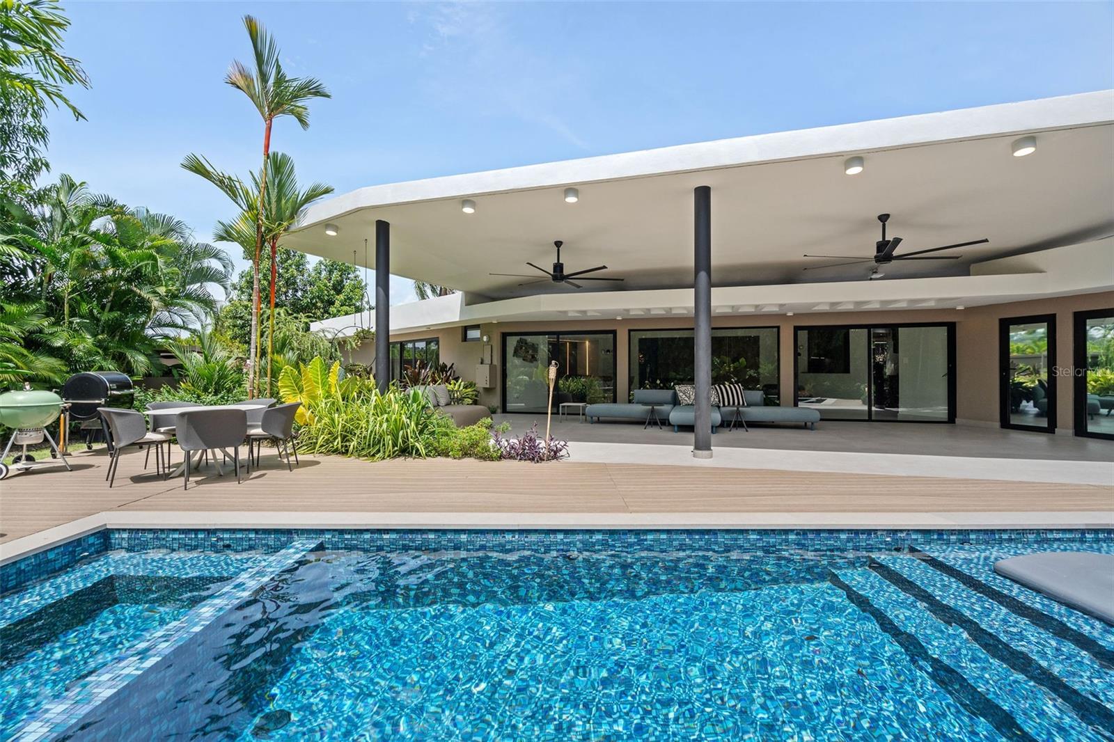 Casa de luxo à venda em Garden Hills North, Guaynabo, Porto Rico. Descubra elegância e design moderno neste apartamento totalmente remodelado de três quartos, quatro banheiros, lavabo, escritório e quarto flexível. O layout de conceito aberto integra perfeitamente os espaços de estar, jantar, família, área de bar e cozinha, com amplas janelas que enchem a casa de luz natural e proporcionam vistas deslumbrantes sobre os exuberantes jardins. Projetado pelo designer de interiores Carlos Alegría, cada detalhe reflete um tema inspirado na natureza, desde a cozinha italiana personalizada Copatlife e o bar com eletrodomésticos Sub-Zero e Wolf até a iluminação, móveis e detalhes de design por toda parte. Todos os móveis e acessórios de design feitos sob medida foram cuidadosamente selecionados para seguir as cores e o tema de cada ambiente. A suíte master possui banheiro privativo tipo spa, chuveiro com efeito de chuva, pia dupla e closet projetado pela California Closets. Destaques e espaços adicionais incluem uma sala de escritório, sala flexível com três TVs 8K de 84 polegadas de largura, sistema de tecnologia de última geração, lavanderia e pontos de acesso à Internet com fio em toda a casa. Do lado de fora, o quintal meticulosamente paisagístico projetado por Mery Bingen oferece piscina aquecida, jacuzzi e amplo terraço, perfeito para relaxamento ou entretenimento. A piscina apresenta luzes bullnose e opções multicoloridas, realçando a vibrante atmosfera ao ar livre. Este imóvel, com área habitacional de aproximadamente 4.000 metros quadrados e lote de esquina de 1.372 metros quadrados, conta ainda com gerador de energia e cisterna de água para maior comodidade e segurança. Localizada em um bairro tranquilo, mas conveniente, a casa oferece itens de luxo adicionais, como cortinas elétricas, blackouts, janelas e portas de impacto. O espetacular paisagismo da propriedade é uma obra de arte, possuindo uma variedade de plantas e flores nativas que proporcionam beleza e privacidade o ano todo. A atenção aos detalhes no design do jardim garante um ambiente tranquilo e pitoresco. O bairro de Garden Hills oferece fácil acesso a escolas, shopping centers, restaurantes e principais rodovias, ao mesmo tempo que proporciona um retiro tranquilo e isolado. Esta residência oferece mais do que apenas uma casa; proporciona um estilo de vida luxuoso. Não perca a oportunidade de tornar esta casa de sonho a sua realidade! Contate-nos hoje para agendar uma exibição privada!