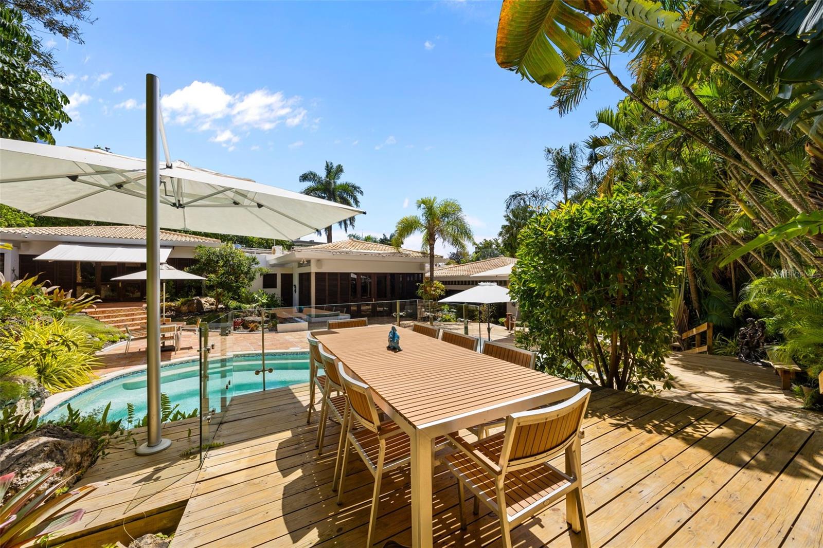 Descubra esta espetacular residência localizada no exclusivo condomínio Villa Caparra, onde privacidade, luxo e ambiente tropical se unem perfeitamente. Esta impressionante propriedade oferece aproximadamente 6.000 pés quadrados de construção em um generoso lote de 1.752 metros quadrados, proporcionando espaços amplos e versáteis para o máximo conforto. A casa possui seis quartos e cinco banheiros e meio, ideal para famílias numerosas ou para quem gosta de receber convidados. No interior, você encontrará uma ampla sala familiar, perfeita para reuniões, relaxamento ou para criar momentos inesquecíveis com a família e amigos. Saia para o seu oásis tropical privado. A propriedade possui uma bela área de estar coberta à beira da piscina, além de diversas áreas externas projetadas para reuniões íntimas e divertidas ou simplesmente relaxar com uma taça de vinho em total privacidade. Cada canto do quintal foi cuidadosamente projetado para melhorar a vida ao ar livre. Esta residência foi totalmente remodelada, aliando design moderno com funcionalidade. Inclui garagem coberta e pode ser vendida com mobiliário seleccionado, tornando a transição para o novo proprietário ainda mais cómoda. Para eficiência energética e tranquilidade, o imóvel é equipado com: 28 painéis solares, 3 baterias Tesla, gerador de 22 kW com chave de transferência, 12 aparelhos de ar condicionado mini-split e 2 cisternas filtradas totalizando 2.200 litros. Esta casa excepcional oferece a combinação perfeita de luxo, espaço, privacidade e estilo de vida resort em uma das áreas mais exclusivas da região metropolitana.