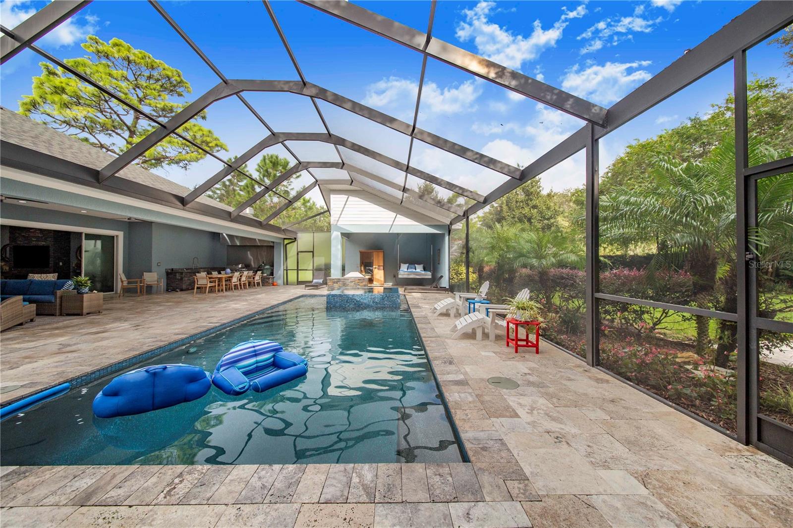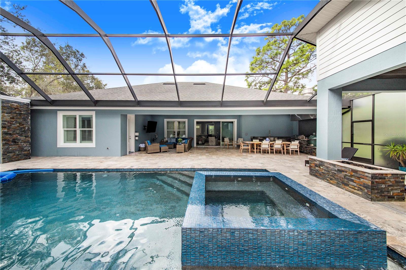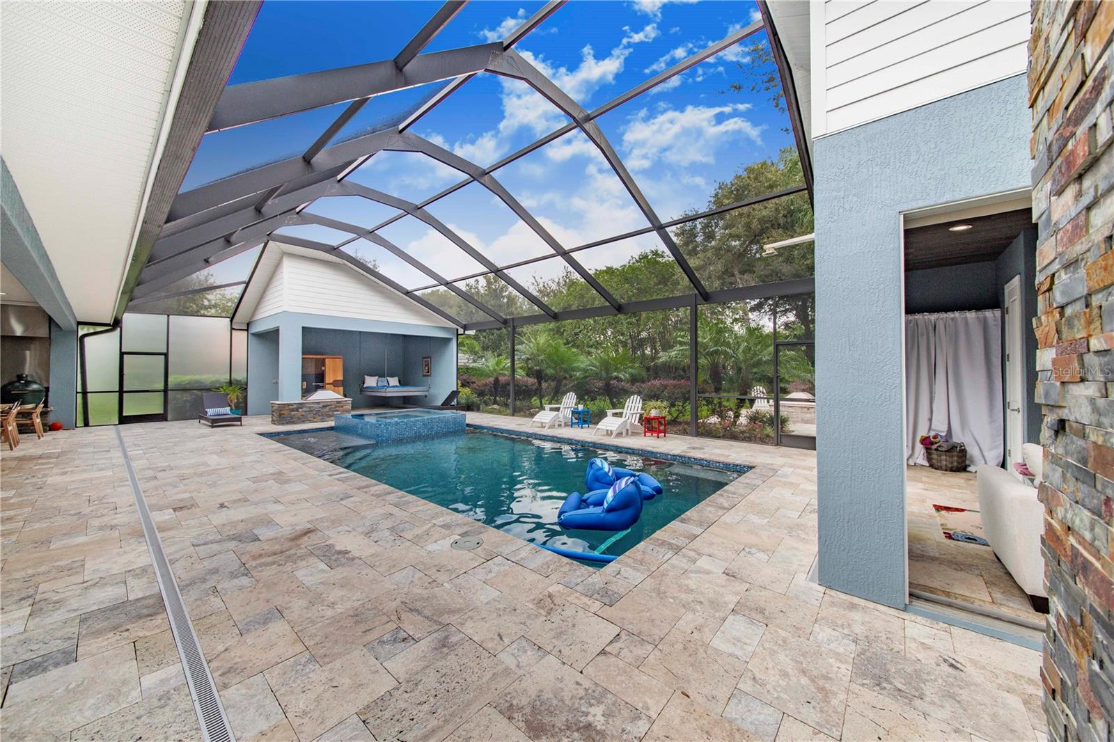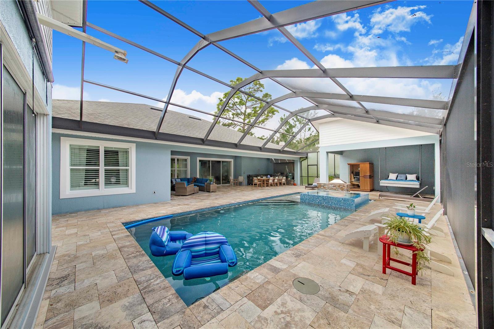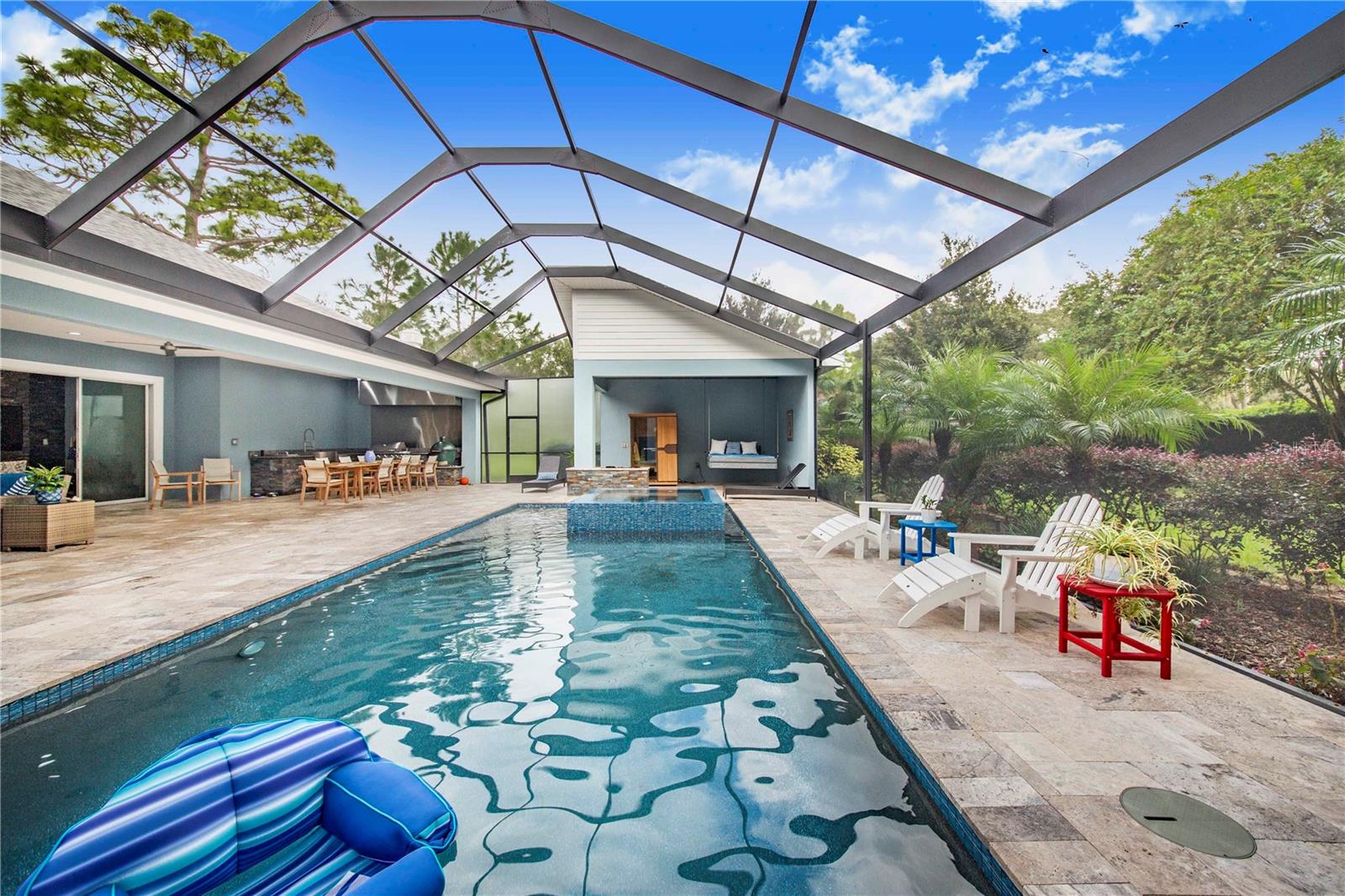 bem-vindo a esta deslumbrante propriedade de três quartos, três banheiros completos e três lavabos, localizada em um condomínio fechado de prestígio no coração da Flórida Central. A sala bônus pode ser usada como um 4º quarto e atualmente é usada como um escritório dedicado, com uma cama Murphy personalizada para maior versatilidade. Esta casa foi projetada com luxo e conforto em mente, ostentando uma calçada e calçada pavimentada com tijolos, venezianas e azulejos de travertino requintados na varanda dos fundos e no deck da piscina. A área de estar ao ar livre é o sonho de qualquer artista, completa com uma grande cabana com banheiro totalmente fechado, ar-condicionado e uma linda cama suspensa. Relaxe na piscina aquecida e na banheira de hidromassagem, reúna-se ao redor da fogueira personalizada de dois lados - um lado para madeira de verdade e outro para gás - ou desfrute de uma noite aconchegante em frente à lareira a gás à beira da piscina. Uma TV externa de nível comercial de 75 polegadas, chuveiro externo e uma cozinha externa personalizada com um ovo verde extra grande, churrasqueira Bull, ilha grande e exaustor tornam este espaço perfeito para hospedar reuniões. O interior é igualmente de tirar o fôlego, com tetos de 3 metros, sancas por toda parte, piso de porcelanato e abundante iluminação LED. A cozinha de conceito aberto oferece armários personalizados, iluminação sob o armário, água potável por osmose reversa e uma máquina de gelo. Recém-pintada por dentro e por fora, esta casa também inclui um sistema de áudio doméstico, dois aquecedores de água sem tanque, uma lareira elétrica na sala de estar, um banho de vapor no banheiro principal e recursos atenciosos, como uma porta para cães na suíte master e na sala de tela. . A propriedade paisagística oferece tranquilidade e luxo, e sua localização central oferece fácil acesso às principais rodovias e parques temáticos próximos. Não perca a oportunidade de possuir esta casa incrível onde a elegância encontra a funcionalidade, por dentro e por fora.