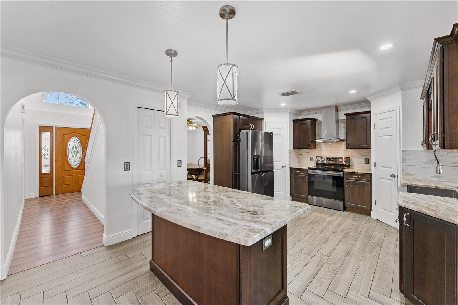 Uma ou mais fotos foram praticamente encenadas. Mudar-se pronto! imaculada casa de dois andares em Haines City, FL. HOA extremamente baixo, sem CDD. Comunidade muito perto do Walmart, de lojas e estradas principais. Com 5 quartos e 3 banheiro completo. *** Primeiro andar, você encontrará o conceito de cozinha aberta renovada com bancadas de mármore, utensílios de aço inoxidável e pia da fazenda, sala de jantar separada, uma bela porta francesa que leva você ao lanai extra grande, um quarto extra com um banheiro completo ótimo para visitantes ou pais, também uma grande sala grande. *** Segundo andar: Grande quarto principal localizado no segundo andar, com dois armários separados, banheiro principal com jacuzzi e chuveiro. Também no segundo andar, três quartos de tamanho decente adicionais. Quintal cercado com um gazebo grande, árvores frutíferas como manga, fruta de dragão. A/C (3 anos), teto (4 anos), ventilador de teto interno 7. Todos os aparelhos incluídos.