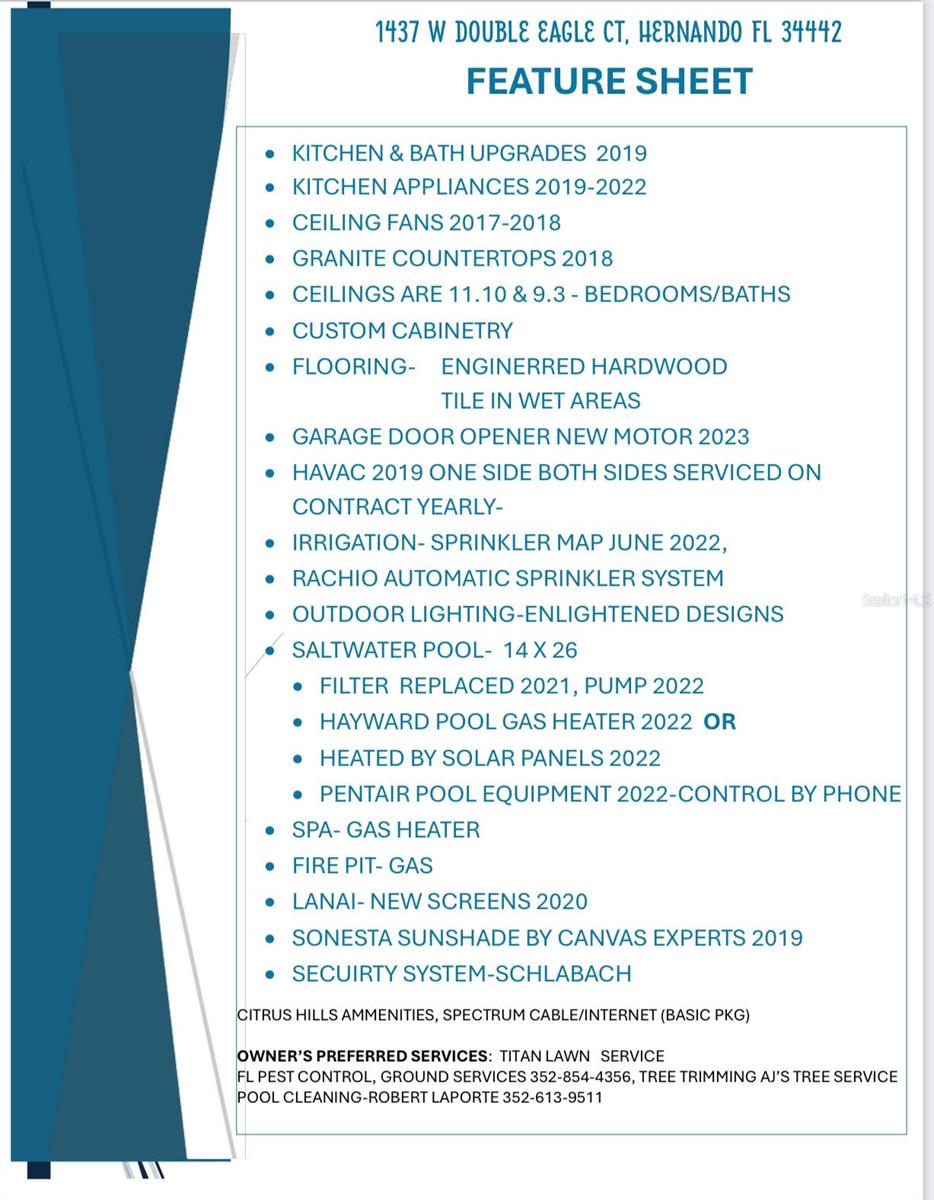 Redução de preços! Esta espetacular casa de piscina personalizada atualizada, localizada em Foxfire, a adorável e conhecida comunidade Terra Vista, em Citrus Hills, está se movendo pronta! 11 pés+ tetos e tetos de bandeja adornam esta casa com uma cozinha com fornos duplos, fogão a gás, despensa e bancadas de granito, armários personalizados e persianas de bahama! Os banheiros foram atualizados em 2018, Appliances 2019, Solar para o Pool 2022 (pode ser aquecido com gás). Aquecida lagoa ingressada Piscina de acabamento/spa/garagem para Lanai/3 carros de grandes dimensões em meio hectare! Não são necessárias atualizações porque já foram feitas! Os quartos são mais de 9 tetos. Armários da Califórnia no quarto EA, armários duplos no quarto principal. O banheiro mestre possui granito, pias duplas, caminhada em chuveiro e banheira de jardim. Um quarto tem uma sala de estar com um armário extra que pode ser feito para um quarto quarto. Este piso plano aberto da cozinha para a sala da família e o recanto permite diversão em família! Divirta -se em sua sala de estar e jantar formal. Os controles deslizantes duplos e triplos levam ao seu Lanai de grandes dimensões (10,2 x 21,8 sob o teto) com uma piscina automatizada (o deck é de 43 x 26,5) aquecido com a escolha de Solar ou Gas, Spa e Fire Fire Pit para aquelas noites frias, um Sonesta Sol de Sol para aliviar o pôr do sol. Sistema de Segurança, 2019 AC, 2022 System System Paisagismo Profissional do Sistema de Sistema Com Fronteiras Embelezas Embelezam esse lote de meio acre localizado em um beco sem saída. Seu ½ banho leva ao Lanai com chuveiro externo. Caminhe até o Bellavita Spa & Fitness Center! Caminhe pelas trilhas, visite o parque para cães, jogue golfe, tênis, pickleball ou jantar nos restaurantes dos membros, todos localizados na comunidade Terra Vista! Muito mais! Veja a folha de especificações e as fotos.