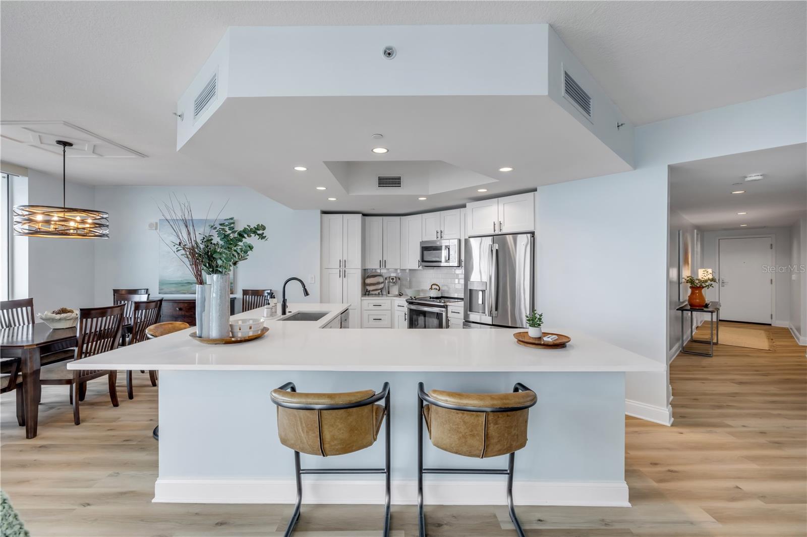 Descubra a vida costeira refinada acima do rio Halifax nesta residência totalmente mobiliada e pronta para morar em Marina Grande. Situada no 20º andar, esta unidade de canto oferece vistas panorâmicas da Intracoastal Waterway e do Oceano Atlântico através de paredes de vidro e de uma varanda privativa perfeita para um café ao nascer do sol ou coquetéis à noite. O interior cuidadosamente atualizado apresenta luxuosos pisos de vinil de tábuas largas, superfícies de quartzo, armários de shaker e eletrodomésticos de aço inoxidável GE, complementados por pintura fresca, tratamentos de janela de designer e decoração elegante por toda parte. Um plano inteligente de quartos divididos aumenta a privacidade, enquanto tetos altos e armários generosos acrescentam conforto e funcionalidade. Situado em um condomínio fechado e seguro de resort de 18 acres, os residentes desfrutam de duas piscinas à beira-mar - incluindo uma piscina de borda infinita -, uma academia, saunas a vapor, um teatro privativo e dois clubes elegantes. Aceita animais de estimação e está idealmente localizada a poucos minutos de praias, restaurantes e da Esplanada à beira-rio, esta casa pronta para uso captura a essência da sofisticação costeira sem esforço.