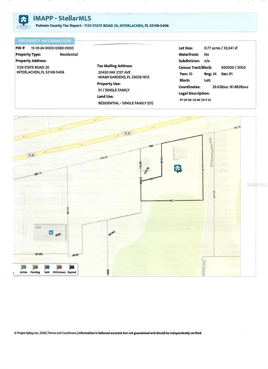 Esta propriedade está atualmente ocupada por inquilinos - por favor, não perturbe. Originalmente construída em 1969 como uma casa de três quartos e um banheiro. O bloco de concreto e a estrutura do telhado metálico têm frente para a rodovia State Road 20 (SR-20), que já foi uma rodovia rural de duas pistas localizada aproximadamente a meio caminho entre Gainesville (cerca de 28 milhas a oeste) e Palatka (aproximadamente 15 milhas a leste). A cidade de Interlachen experimentou recentemente um crescimento significativo. Devido à proximidade com o cruzamento da SR-20 com a Estrada Municipal 315 (CR-315), o zoneamento foi atualizado para Comercial, Geral (C-3). A propriedade inclui 0,77 acres, com a maior parte do terreno situada atrás da estrutura e o edifício vizinho a oeste (ver planta da propriedade). Há amplo espaço útil para acréscimos ou estacionamento. Classificado na Zona Inundável X, o lote é alto e seco. É o local ideal para um escritório profissional, restaurante, cafeteria, lavanderia ou outro pequeno negócio criativo. Esta é a sua oportunidade de investir numa área em rápido crescimento antes que as aquisições corporativas elevem os valores em Interlachen.