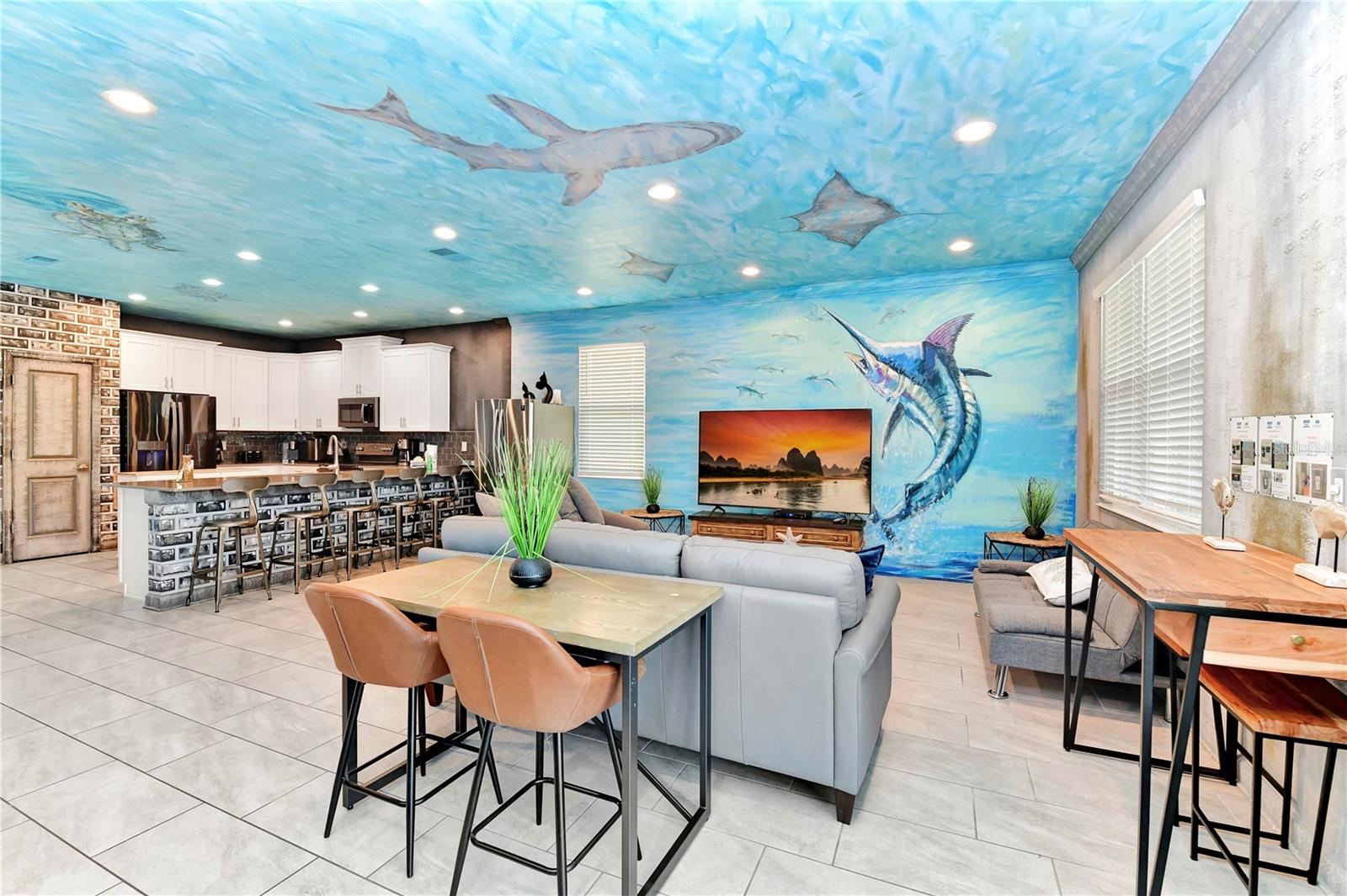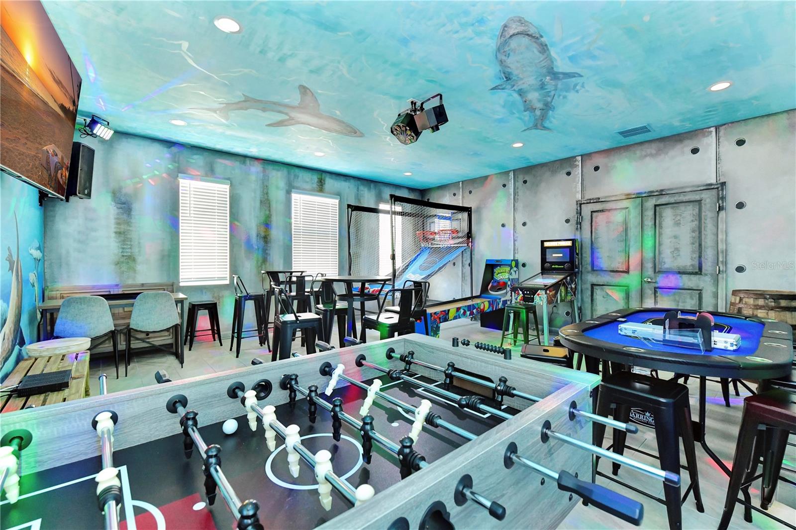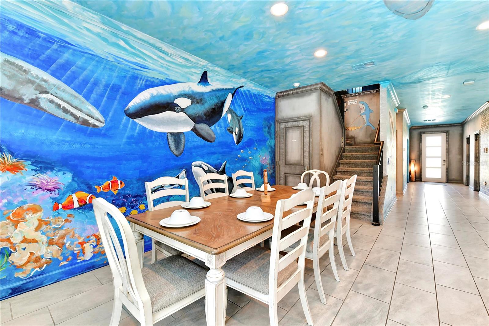 Esta é realmente uma casa de férias única, então não perca esta oportunidade! Esta bela casa de 9 quartos, 5 banheiros é uma obra de arte com o interior de toda a casa pintada por um artista profissional com um tema aquático. Localizado em Storey Lake, uma das comunidades de aluguel de férias mais populares da área central da Flórida nesta casa a apenas 2 minutos a pé do fabuloso clube e centro de amenidades e está sendo vendido totalmente mobiliado. Ele oferece um monte de espaço para entreter e possui uma planta de piso de conceito aberto, a cozinha possui bancadas de quartzo, armários de 42 ", belos utensílios de aço inoxidável e uma grande barra de café da manhã. Todos os banheiros têm painéis de chuveiro em cachoeira e espelhos iluminados. Grupos nunca ficarão sem água quente! Pool, um fliperama, centro de fitness, Business Center e até um teatro!