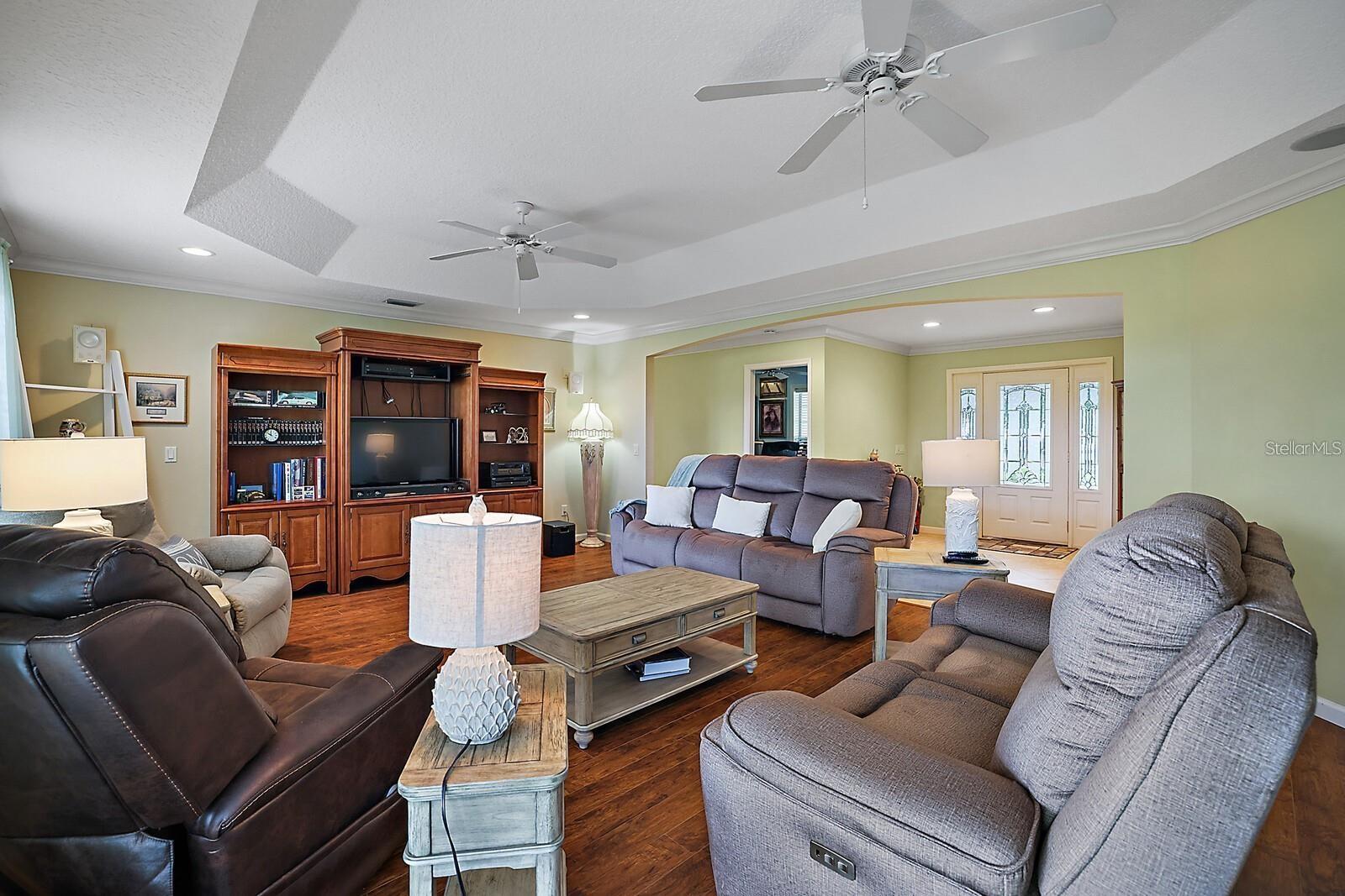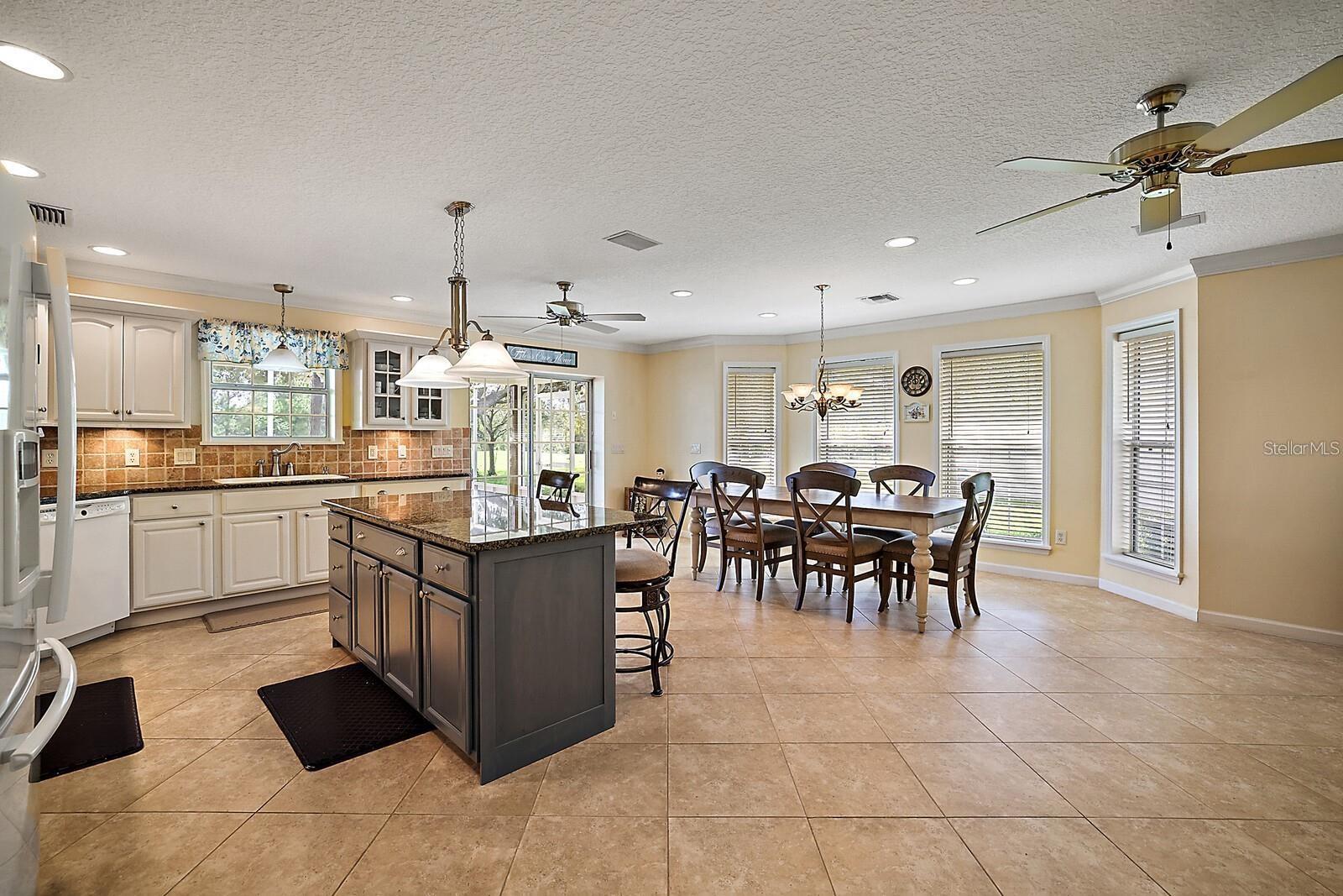 Bem -vindo a esta residência deslumbrante aninhada na comunidade de golfe serena e fechada, dos lagos de Lady Lake. Esta residência lindamente mantida oferece vistas deslumbrantes para campos de golfe, design de bandeja de teto de alto teto, moldagem por coroa, lanai, uma cozinha incrível em quase um lote de 1/2 acres, com muito espaço para uma piscina, se você quiser. A cozinha expansiva é um sonho de chefs com a grande ilha, abundância de armazenamento, bancadas de granito, forno de convecção, tampo cozinheiro, nova geladeira sob iluminação do gabinete, grande despensa e backsplash de pedra. A sala de estar convidativa está cheia de luz natural, tetos de bandeja aparados em molduras de coroa e duas belas janelas, criando uma atmosfera quente para entretenimento. O Retiro Primário do Quarto apresenta uma janela de sacada, ladrilhos de vinil de luxo em suíte com caminhada no chuveiro, vaidade de pia dupla e grande caminhada no armário. O segundo e o terceiro quartos são espaçosos e versáteis, perfeitos para uso como escritório em casa ou convidados. Difícil de encontrar generosamente lavanderia apresenta bancadas em granito, toneladas de armários personalizados e pia de utilidades. Saia das portas de vidro deslizante até a sua varanda, onde você pode aproveitar o café da manhã ou hospedar reuniões noturnas enquanto recebe as vistas serenas do campo de golfe. Atualmente, o Clube de Campos de Golfe atualmente sob renovação completa, procure algumas atualizações lindas em breve. Esta casa apresenta um novo telhado (2022) e um novo sistema HVAC. Localizado a poucos quarteirões das aldeias, sem CDD! A apenas 4 minutos de Spanish Springs, conhecida por seu entretenimento, lojas encantadoras e grande seleção de restaurantes e cafés. Perto de instalações médicas, campos de golfe, parques e grandes rodovias. 1 hora para as atrações de Orlando e pouco mais de uma hora para as praias.