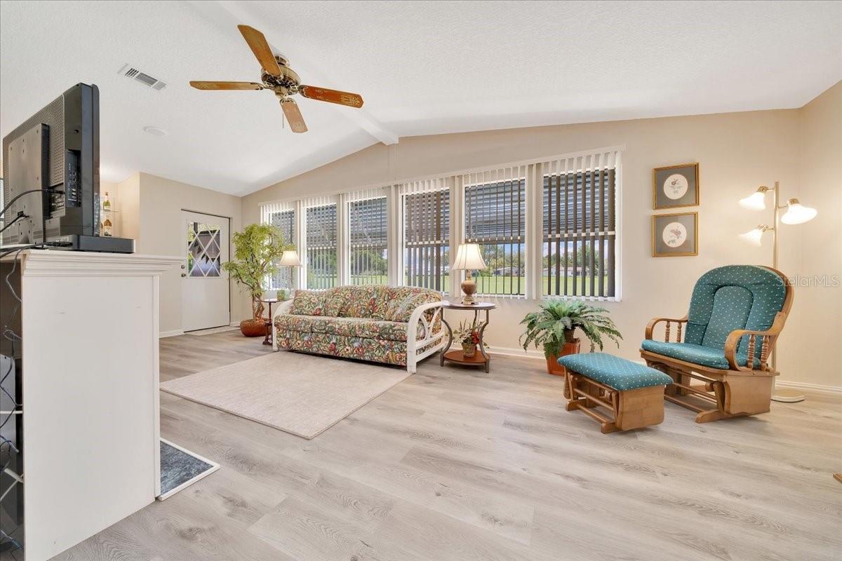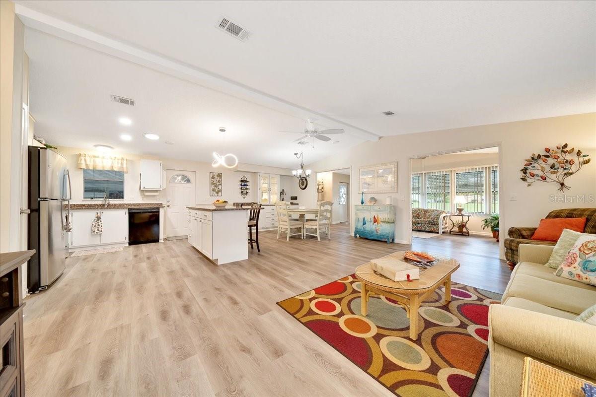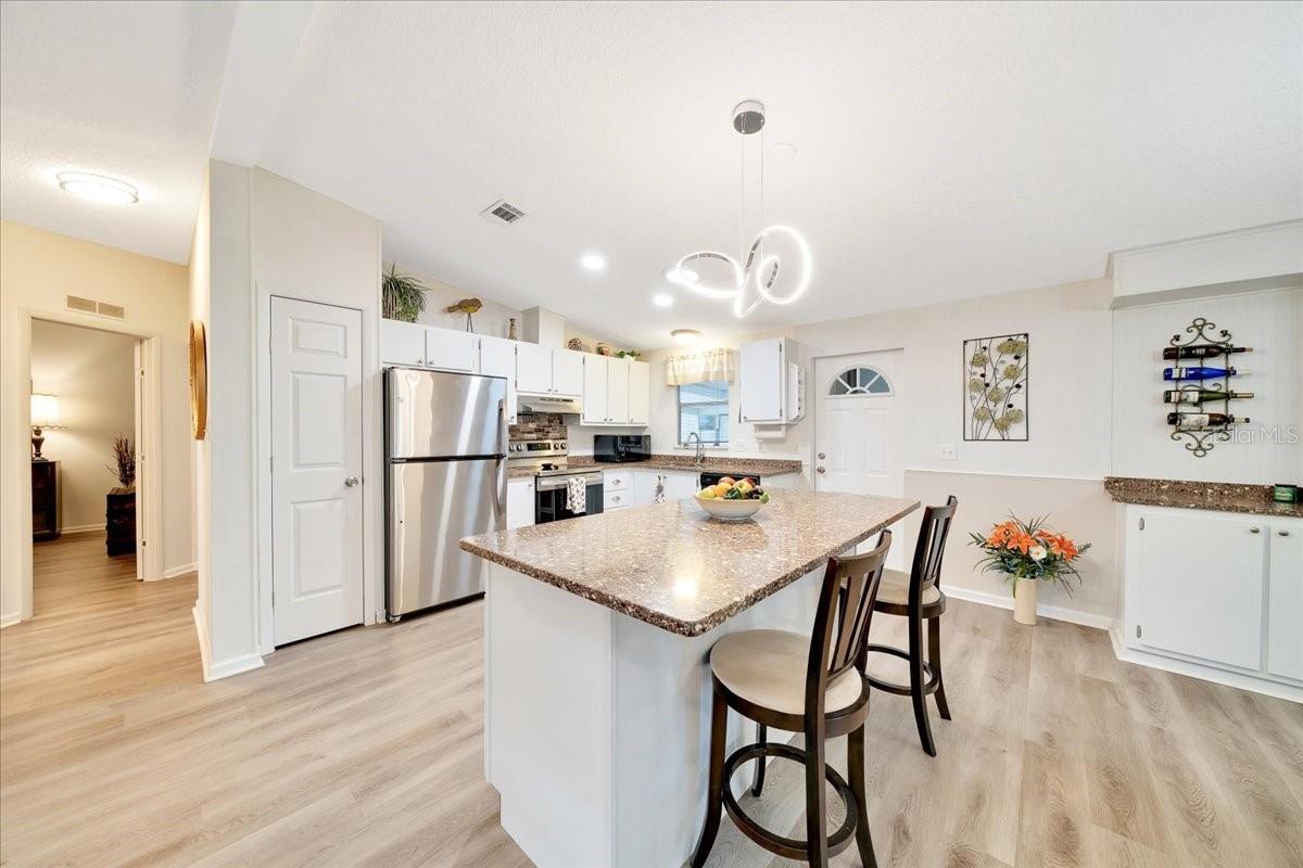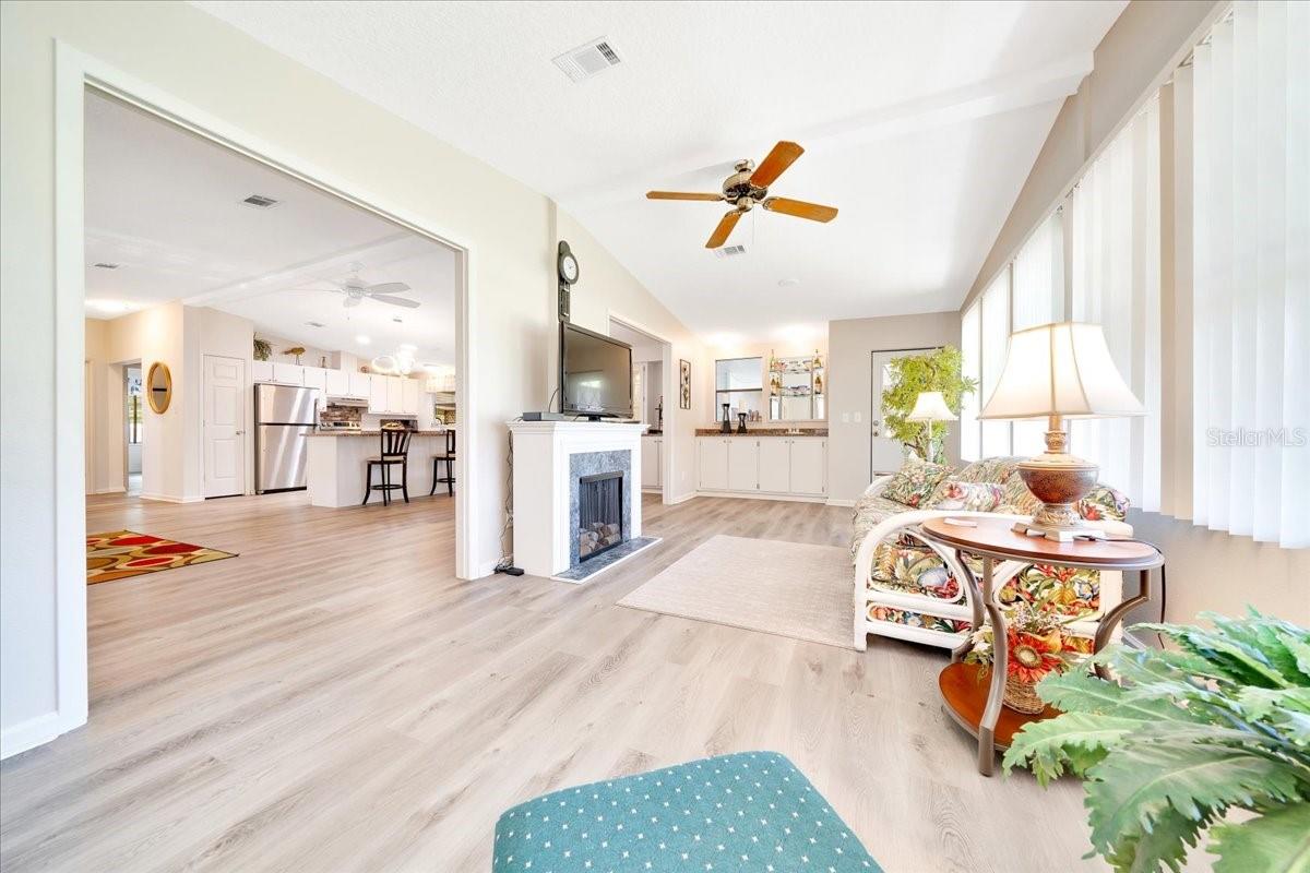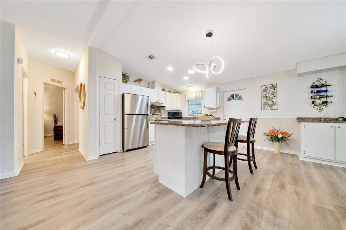 Bem-vindo a esta casa lindamente remodelada de 2 quartos e 2 banheiros no coração de Country Club Hills, nas aldeias, com vista para o 18º buraco do campo de golfe no topo da colina. Atualizado e remodelado com bom gosto, esta espaçosa casa apresenta pisos de vinil de luxo por toda parte, bancadas de quartzo e utensílios de aço inoxidável atualizados na cozinha, bancadas de granito e chuveiro primário atualizado e armários atualizados nos dois banheiros. Você vai adorar a sensação brilhante e aberta criada pelos tetos de knockdown abobadados na área de estar principal, tinta atualizada e luz natural que entra em dois tubos solares e uma clarabóia na suíte primária. O Den Flexible/Surra da Surra faz o escritório em casa perfeito, a sala de hobby ou o espaço adicional - COMPLETO COM VIELHAS DE Golfe. Saia para o recurso de destaque: um lanai com vista para o fairway, atualmente criado como um bar ou retiro de bônus, oferecendo o espaço final para relaxar ou entreter com um belo cenário. Os recursos adicionais incluem uma garagem de 2 carros de grandes dimensões, uma grande garagem para lavanderia/carrinho de golfe com espaço na oficina e a tranquilidade que vem com as principais atualizações do sistema: teto (2022), HVAC (2022) e aquecedor de água (2020). Esteja você procurando uma residência em tempo integral ou uma escapada sazonal, esta casa oferece conforto, conveniência e potencial de renda de aluguel. Ensanado entre a piscina do topo da colina e o clube de campo e a piscina de Blossom Hills de Orange Blossom! Não perca - escapou sua exibição particular hoje!
