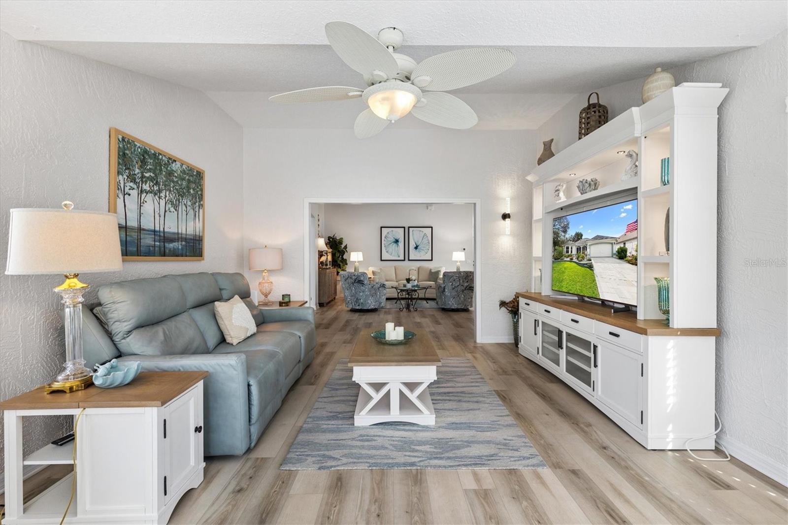 Incrível Vera Cruz Expandida 3/2 na Vila de La Reynalda NO Bond, No CDD. Telhado 2020, HVAC 2021 e aquecedor de água quente 2021. Esta casa meticulosamente mantida apresenta uma entrada de concreto lindamente estampada e paisagismo de baixa manutenção. Entre na varanda frontal coberta e em um convidativo hall de entrada completo com um armário de casacos. No interior, você encontrará pisos de pranchas de vinil de luxo por toda parte, sancas e ventiladores de teto que aprimoram a planta aberta e dividida. A cozinha possui eletrodomésticos de aço inoxidável, despensa, prateleiras removíveis, armário de canto Susan preguiçoso e armários de armazenamento adicionais adicionados em 2024, facilitando a preparação das refeições. Desfrute de acesso contínuo às salas de estar e de jantar e a um pequeno pátio para refeições através de portas de correr perfeitas para o café da manhã. O grande quarto Florida acrescenta espaço versátil, completo com sistema mini-split Mitsubishi (2021) para conforto durante todo o ano e acesso a um pátio externo com vista para um quintal tranquilo com um limoeiro. Retire-se para o quarto principal, com dois closets e banheiro privativo com pia dupla, mesa de maquiagem e box amplo. Os quartos de hóspedes compartilham um banheiro atualizado com uma porta embutida e um chuveiro moderno. Um quarto possui uma cama Murphy queen size, mesa embutida e armários personalizados – ideal para hóspedes ou um escritório doméstico. A garagem tem portão de garagem novo e porta de ecrã eletrónica (2021) e porta de homem para o exterior. Características adicionais: tubo solar na área de estar e banheiro de hóspedes, amaciador de água e sistema de filtragem (2023), sistema de irrigação totalmente novo em 2025, lavanderia interna com lavadora e secadora novas (2025). Localizado em LaReynalda, rodeado de forma privada pelo Campo de Golfe Mira Mesa e perto do centro recreativo Chula Vista. Fácil acesso pelo seu carrinho de golfe à Praça da Cidade de Spanish Springs, restaurantes, clubes de campo e lojas nas proximidades. Esta vila oferece atividades sociais ao ar livre, reuniões mensais de clubes sociais e festas no quintal regularmente. Este local é imbatível! Ligue hoje para agendar sua exibição privada e comece a viver o sonho das Aldeias.