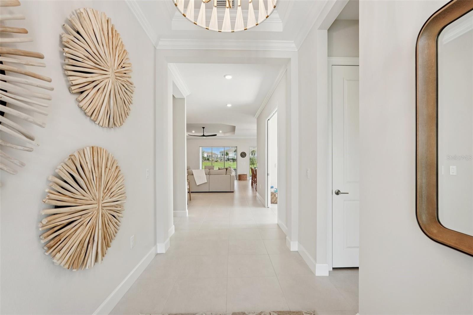 Não olhe para uma parede. Bem-vindo à sua nova e atualizada casa unifamiliar de 3 quartos e três quartos com um covil em um lote premium no lago na esplanada procurada em Azario. Esta residência impressionante apresenta uma garagem para 3 carros projetada com luxo e funcionalidade em mente. Embora o golfe não seja concedido à propriedade, as associações independentes de golfe podem ser obtidas na loja profissional da comunidade. Unique features and upgrades include a GOURMET KITCHEN complete with a range hood, gas cooktop, a 56-bottle wine fridge, and 42” soft-close cabinets. The home boasts 10’ tray ceilings with double crown molding, 8’ closet doors, and an extended covered lanai pre-plumbed and pre-wired for outdoor entertaining and a future pool. Additional enhancements include epoxy-coated garage floors, full landscape Iluminação com o Caminho de Flores, iluminação de palmeiras e pré-fiação para câmeras de segurança dianteira e traseira. As bebidas casuais à beira da piscina e inúmeras atividades sociais e de bem-estar. As quadras de tênis har-tru, quadras de bocha, trilhas para caminhada, um parque de cães e espaço flexível para jogos e reuniões.
