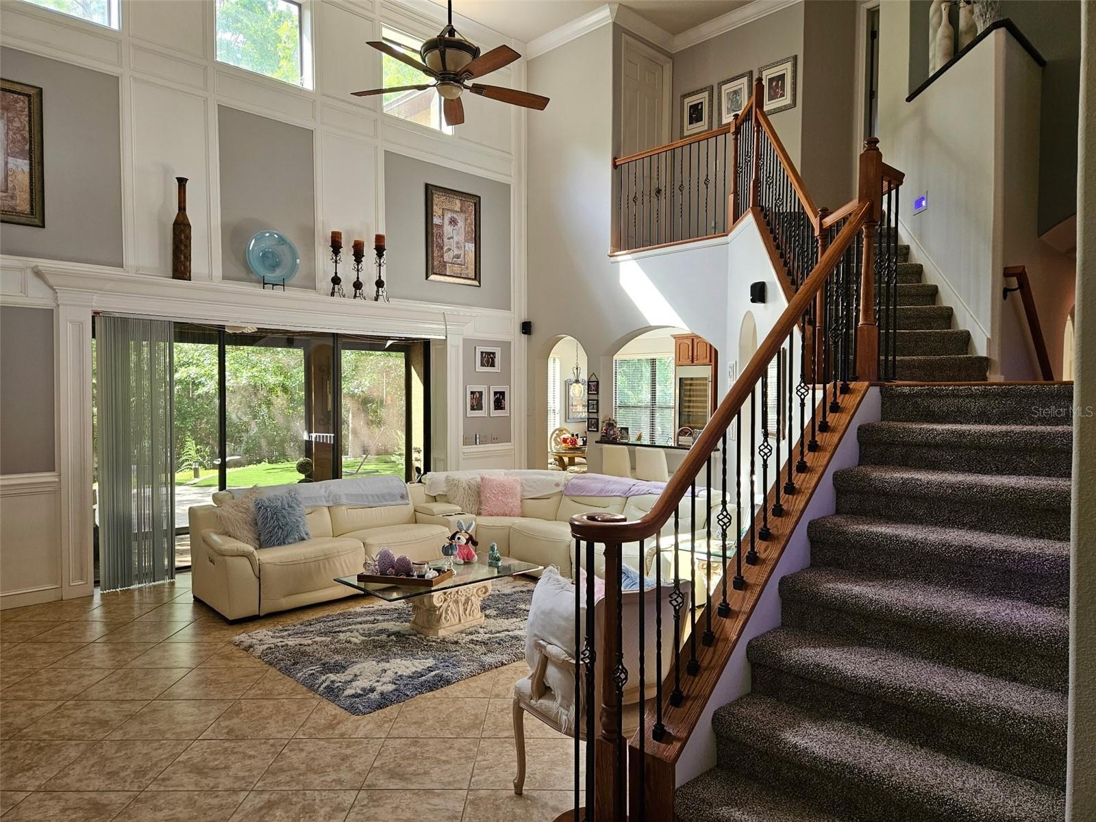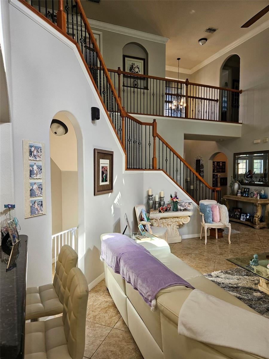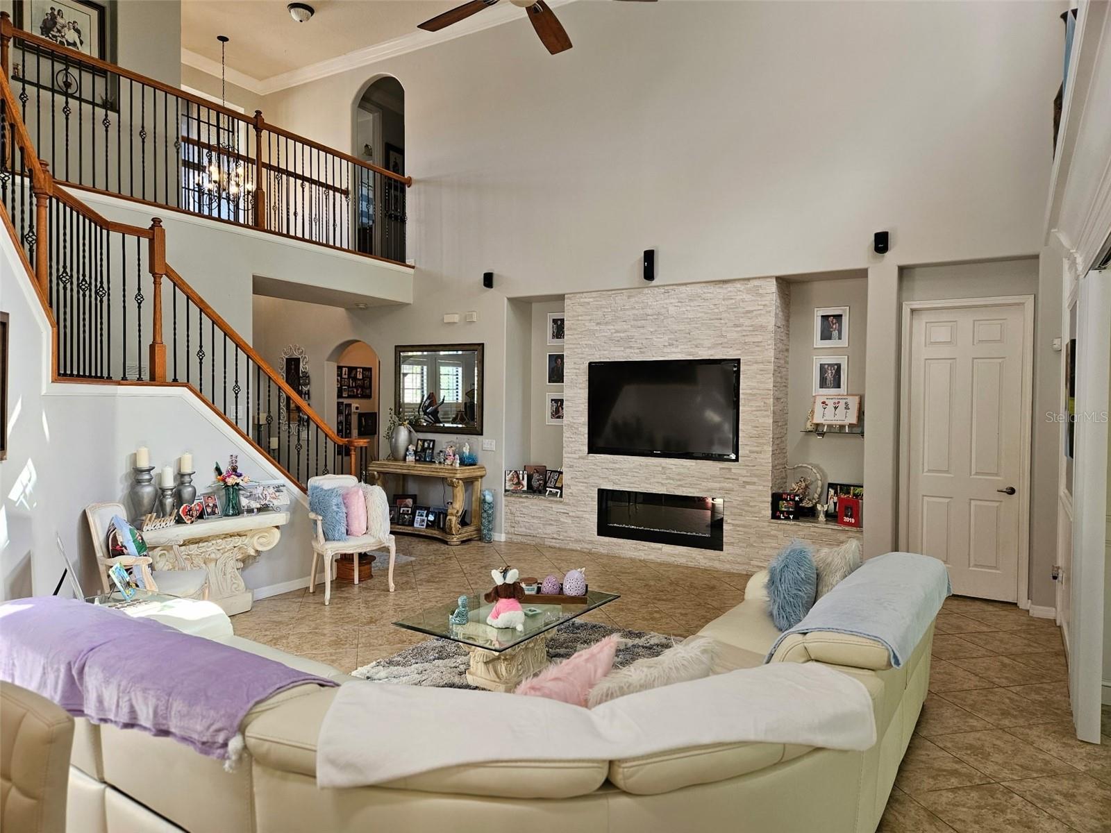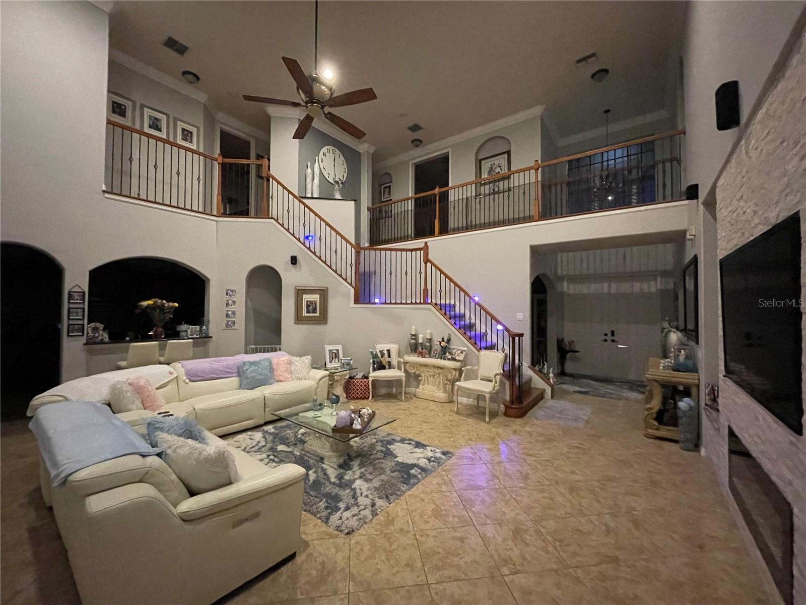 Bem -vindo à sua nova casa de sonho! Este resort privado denominado Home Two Story está situado na seção Mercedes Homes na comunidade isolada de Suncoast Lakes. Quando você entra no beco sem saída, esta residência impressionante o recebe com duas colunas iluminadas enquanto você puxa para a expansiva garagem de pavimentadora mega-bloco do pátio. Começando com o nível do 1º andar, uma entrada de 3 carros no lado esquerdo oferece uma área expandida para ferramentas, armazenamento, espaço extra para congelador e muito mais; A entrada tem uma grande porta de entrada de 8 pés de dois metros que leva a um hall de entrada de dois andares com lustre; A grande sala de estar formal é para a direita e leva à sala de jantar formal, com acesso direto à cozinha e à escada secundária; Um quarto de hóspedes é à esquerda com grandes portas de entrada dupla e tem um banheiro completo adjacente à direita, esta sala também pode funcionar como um escritório e incorporou a fiação especial para esse fim, se necessário; À esquerda está a grande lavanderia com banheira de lavanderia, espaço para lavadora e secadora ao longo de uma parede e armários superiores e inferiores e bancada na parede oposta, levando à garagem. Voltando ao hall de entrada, você caminha sob uma ponte no andar de cima e entra na grande sala da família com teto de 2 andares abobadado, com a escada principal para a direita imediata e encerrando a sala até o 2º andar. The Family Room features a stone entertainment center with two hidden drawers for electronic equipment, a functional electric fireplace' that also provides heat during the cooler months, and a 65" 3-D Television. The Entertainment area is capable of providing full surround sound with audio equipment. There is a multifunction space under the stairs which could be used as a wine cellar or storage. There is a pass-though from the kitchen with bar seating and a kitchen that was made for entertaining with an 8-foot center island Bancada com armários e gavetas para exibir seu buffet de férias. Portas deslizantes de parede a parede que abrem a área de Lanai de tela totalmente automatizada, que sai para a ampla área de entretenimento com pavimentadoras decorativas, grande área sombreada em árvores para sentar e outra grande área sombreada em árvore, com grama artificial que atualmente fornece uma área para relaxamento completa em uma área de rede dupla, diretamente atrás da casa e da piscina de resort, com a grande piscina coberta e a área de barra e a barra para o lado da lateral. De volta para dentro, enquanto subimos a escada aberta com vista para a sala da família, a área do segundo andar é dividida em duas seções, separadas por uma ponte. A primeira seção tem dois quartos grandes com armários e um grande banheiro de duas pia com separado