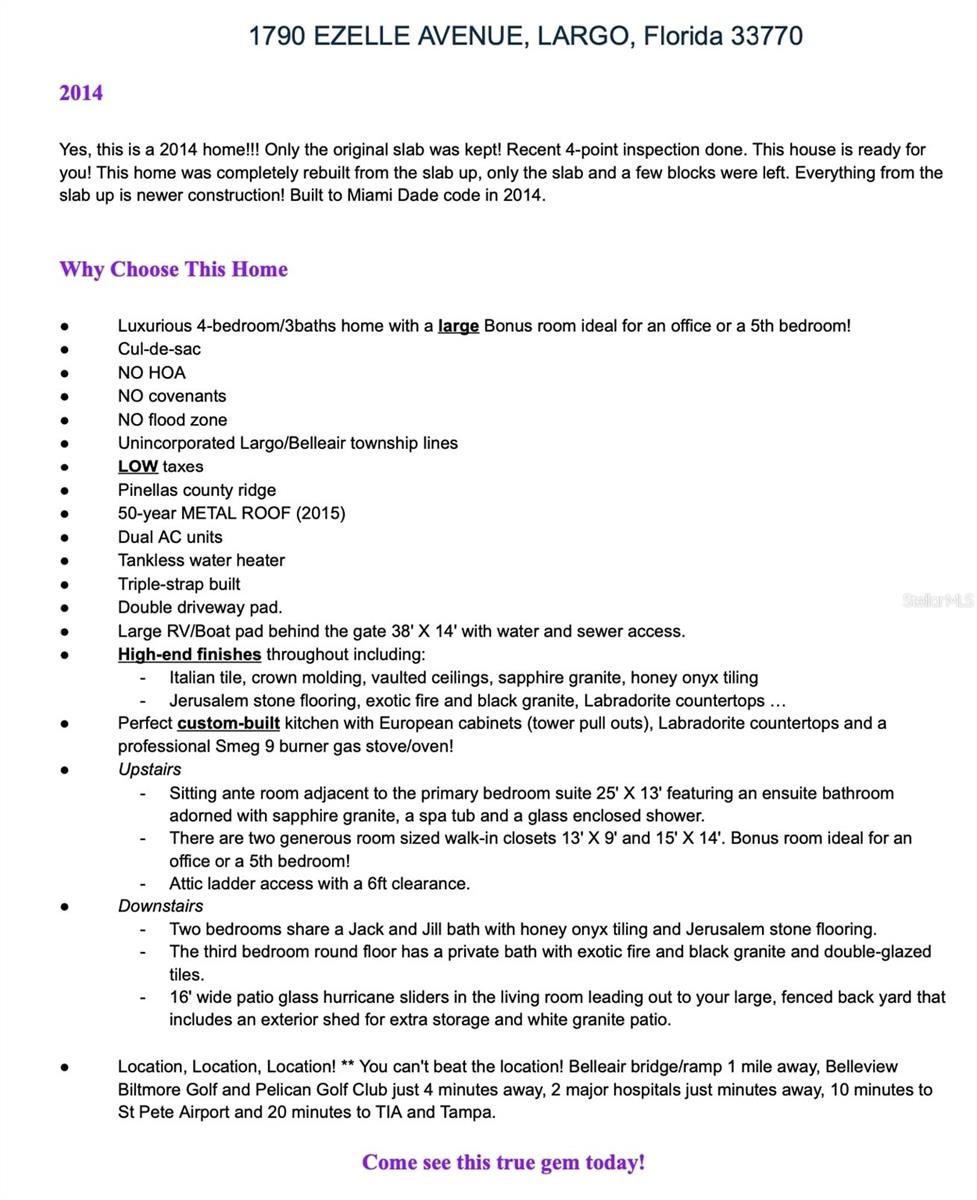 Localização, segurança, luxo e conveniência! Inspeção recente de 4 pontos realizada. Luxuosa casa de quatro quartos/3Baths construída para o código de Miami em 2014. Sala de bônus ideal para um escritório ou um quinto quarto! Cul-de-Sac, sem HOA, sem convênios, linhas do município de Largo/Belleair não corrigidas, sem zona de inundação, impostos baixos, Ridge de Pinellas County, telhado de metal de 50 anos (2015), unidades Dual CA, aquecedor de água sem tanques, tira tripla construída, almofada de entrada dupla, busca RV/seleção de água com água. Acabamentos de última geração, incluindo ladrilhos italianos, moldagem por coroa, tetos abobadados. Existem dois armários generosos do tamanho de um quarto 13 'x 9' e 15 'x 14' e uma sala de bônus ideal para um escritório ou um quinto quarto! Além disso, há um acesso ao sótão com uma folga de 6 pés. ** No térreo ** Cozinha personalizada perfeita com armários europeus (puxadores de torre), bancadas do Labradorita e um fogão/forno a gás SMEG 9 SMEG 9! Existem 3 quartos. Dois quartos compartilham um banho de jack e jill com ladrilhos de ônix de mel e piso de pedra de Jerusalém. O piso redondo do terceiro quarto tem um banho privativo com fogo exótico e granito preto e azulejos com vidros duplos. Sliders de furacão de vidro de 16 'de largura na sala que leva ao seu grande quintal cercado, que inclui um galpão externo para armazenamento extra e pátio de granito branco. ** Amantes do RV ** Há uma grande almofada de RV/barco atrás do portão 38 'x 14' com acesso a água e esgoto. Novo exterior Sherwin Williams Emerald Premium Weather Taint e tinta interior fresca. ** Localização ** Você não pode vencer a localização: Belleair Bridge/Rampa a 1,6 km de distância, Belleview Biltmore Golf e Pelican Golf Club a apenas 4 minutos, 2 grandes hospitais a poucos minutos, a 10 minutos até o aeroporto de St Pete e 20 minutos para Tia e Tampa. Esta casa foi completamente reconstruída da laje, apenas a laje e alguns quarteirões foram deixados. Tudo, desde a laje, é uma construção mais recente. Venha ver esta verdadeira jóia hoje! Sem danos - sem inundação após a recente tempestade! Esta é uma localização verdadeiramente perfeita! - Virtual Tour https://listings.nextdoorphotos.com/vd/148653521