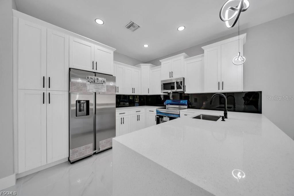 Bem-vindo a uma residência excepcional em construção no coração de Lehigh Acres, onde o luxo contemporâneo encontra um design inteligente. Esta casa impecavelmente trabalhada apresenta uma mistura atraente de sofisticação e espaços práticos, oferecendo três quartos e dois banheiros bem equipados. Passe pela elegante entrada de porta dupla para uma casa que exemplifica a vida moderna na Flórida. O grande design da sala cria uma impressionante sensação de abertura, conectando perfeitamente os espaços de convivência e estabelecendo um ambiente ideal tanto para entretenimento quanto para a vida diária. O coração desta casa é sua cozinha lindamente concebida, com um design tradicional para refeições, aprimorado por uma ilha generosa que funciona como um espaço para refeições casuais. Os entusiastas da culinária apreciarão o conjunto completo de novos eletrodomésticos de aço inoxidável, incluindo geladeira, lava-louças, micro-ondas e fogão. A estética sofisticada da cozinha é elevada pelas bancadas de quartzo premium, que se estendem até os banheiros, mantendo um design coeso por toda parte. A suíte principal é um retiro privado, ostentando um closet espaçoso e um banheiro elegante com pias duplas. Dois quartos adicionais oferecem acomodações confortáveis para familiares ou convidados, enquanto o segundo banheiro completo garante comodidade para todos. Em toda a residência, o piso de porcelanato premium cria um fluxo contínuo, refletindo a luz e contribuindo para a atmosfera iluminada e arejada da casa. Todas as janelas apresentam elegantes persianas zebradas, adicionando um toque de elegância moderna e oferecendo controle de luz versátil. Segurança e durabilidade foram fundamentais no projeto, com janelas e portas de impacto proporcionando tranquilidade durante o clima sazonal da Flórida. A varanda coberta amplia o espaço de estar ao ar livre, oferecendo um ambiente sereno para o café da manhã ou para relaxar à noite. O paisagismo profissional aprimora o jardim da frente, criando apelo imediato ao meio-fio e uma abordagem acolhedora para sua nova casa. A localização desta residência é igualmente impressionante, posicionada a poucos quarteirões da Lee Boulevard e oferecendo acesso rápido a Fort Myers. O bairro oferece oportunidades educacionais excepcionais, com escolas e uma biblioteca pública nas proximidades. As conveniências diárias são igualmente acessíveis, com opções de compras e restaurantes de fácil acesso. Notavelmente, esta propriedade fica fora de zonas de inundação designadas, oferecendo tranquilidade adicional. Esta nova construção representa mais do que apenas uma casa; é uma oportunidade de abraçar um estilo de vida onde o conforto encontra a conveniência, onde as comodidades modernas combinam perfeitamente com a vida prática e onde cada detalhe foi cuidadosamente considerado para criar uma experiência de vida excepcional. Não deixe passar esta oportunidade notável - agende hoje mesmo a sua exibição privada e entre na sua futura casa.