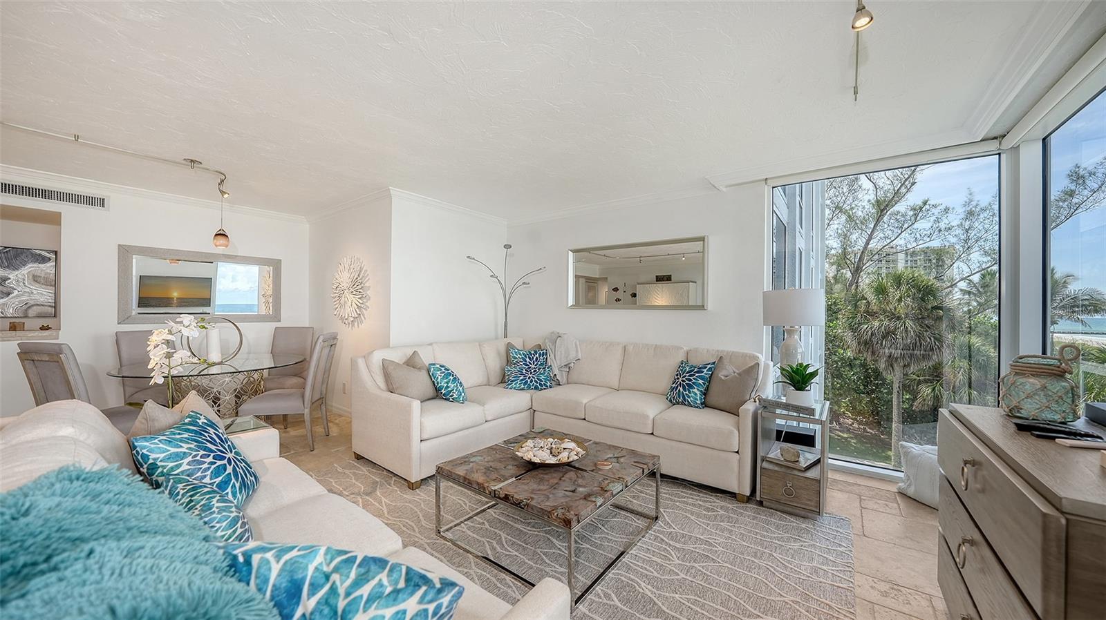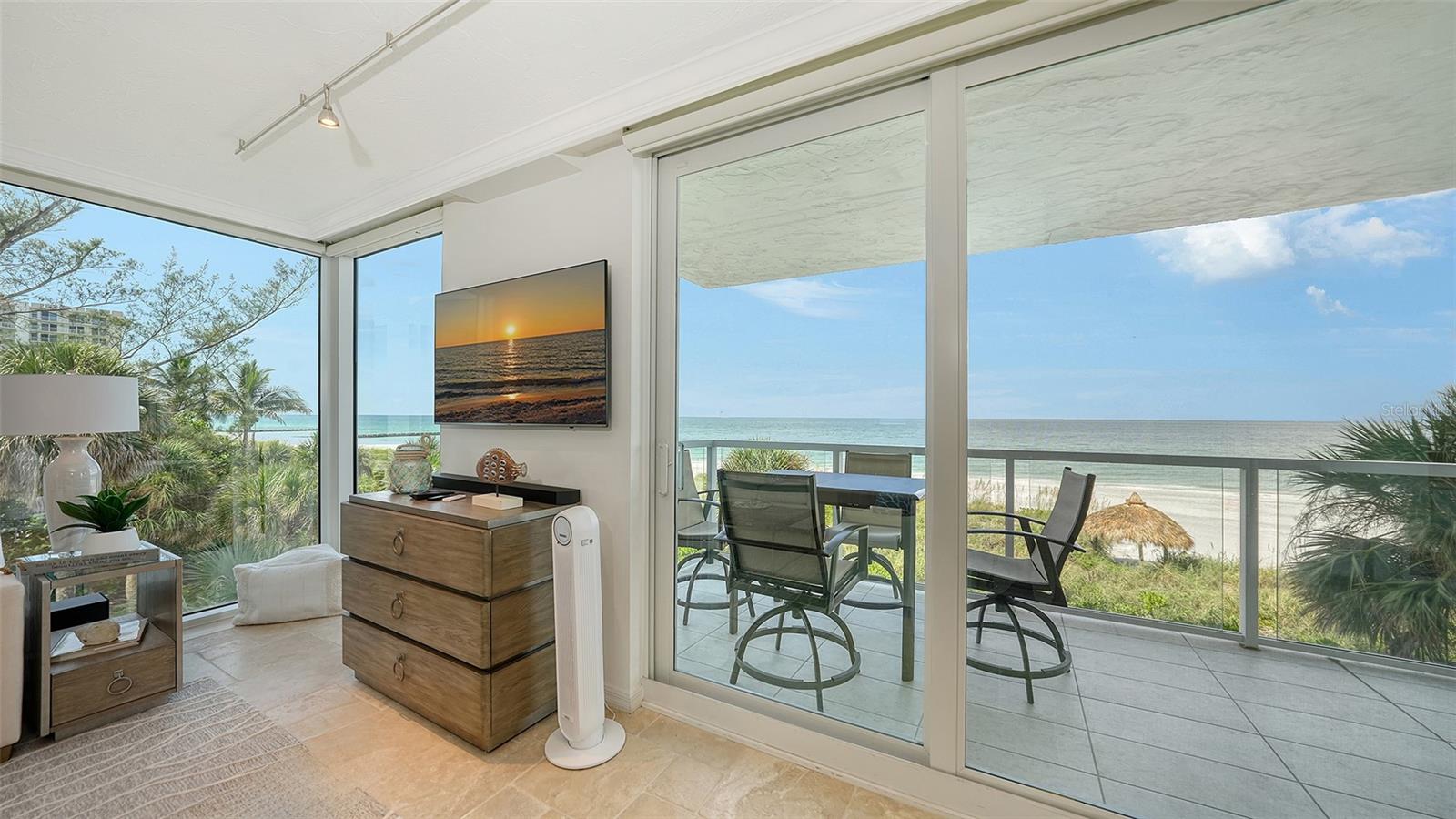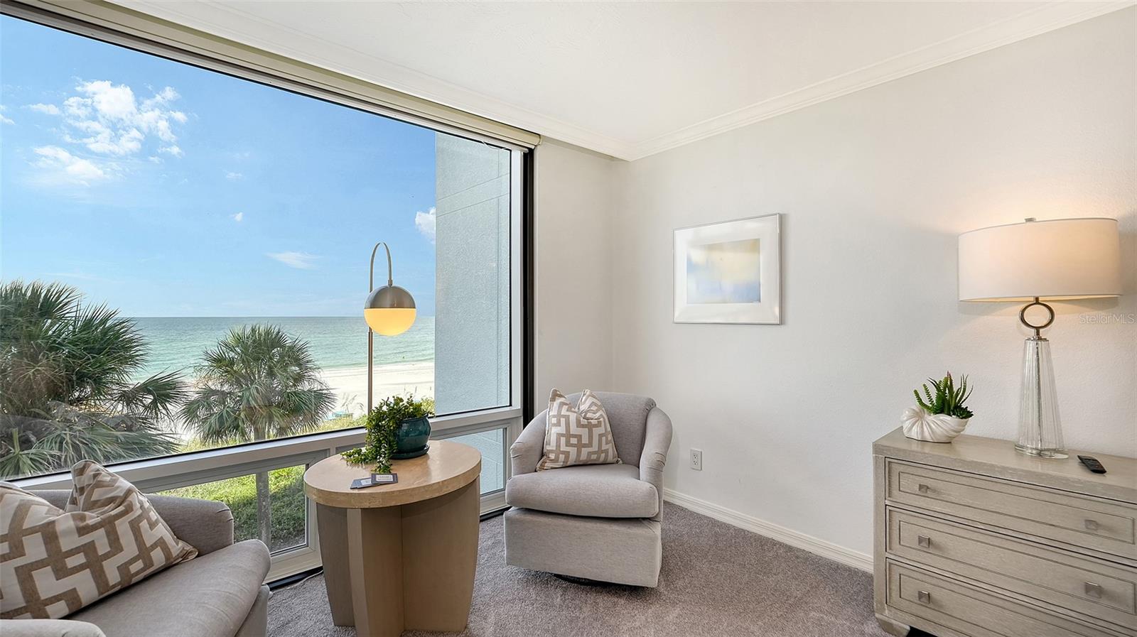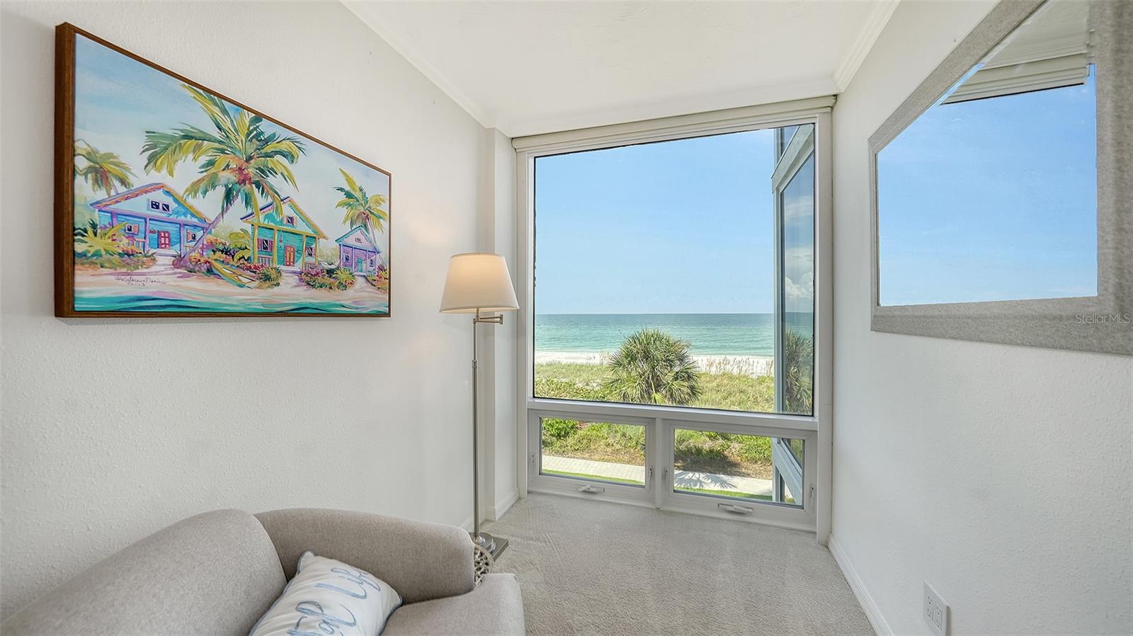 Eleve seu estilo de vida costeiro com esta residência requintada no Sea Gate Club em Longboat Key. Perfeitamente posicionado para oferecer vistas diretas das deslumbrantes ondas do Golfo, este retiro atualizado de quase 1.500 pés quadrados está pronto para morar e mobiliado. Entre na recém-renovada varanda à beira-mar, onde grades de vidro melhoram as vistas desobstruídas e brilhantes da praia que fluem perfeitamente de sala em sala, culminando em vistas deslumbrantes do pôr do sol que completam o seu dia. O layout de conceito aberto é adornado com superfícies elegantes, uma paleta neutra e fresca, nova iluminação, tratamentos de janela personalizados e sancas. Banheiros recentemente modernizados, concluídos em 2024, e piso de travertino contribuem para a sensação arejada e expansiva da casa. Janelas de impacto e controles deslizantes de vidro, instalados em 2019/20, emolduram lindamente essas vistas cativantes. A elegante cozinha de quartzo tem vista para a área de estar e jantar, bem como para o terraço de frente para o Golfo. Esta cozinha em estilo galera está equipada com eletrodomésticos de aço inoxidável, armazenamento de vinho embutido, armários elegantes com recortes de vidro, backsplash de azulejos exclusivo e uma aconchegante sala de jantar. Paredes de vidro do chão ao teto infundem luz natural em todos os cantos, realçando o ambiente ensolarado da casa. O quarto principal, situado no lado sul para ótima iluminação natural, oferece vista direta para a praia, closet embutido e banheiro privativo recém-atualizado. O quarto de hóspedes, localizado no lado norte para maior privacidade, é espaçoso o suficiente para incluir sua própria área de estar voltada para o Golfo, garantindo conforto aos visitantes. Localizada no terceiro andar, esta residência está convenientemente perto das impressionantes comodidades do Sea Gate Club. Esta comunidade privada fica no extremo sul de Longboat Key, em meio a uma vegetação exuberante e à beleza costeira, compreendendo apenas 90 residências e passou recentemente por extensas reformas. O estuque exterior do edifício foi renovado, novas janelas e grades de varanda em todo o edifício, entradas e corredores foram atualizados e uma nova sala social com cozinha de catering foi adicionada. O centro de fitness renovado apresenta equipamentos totalmente novos. Os residentes se beneficiam de gerenciamento no local, armazenamento de bicicletas com ar-condicionado e armazenamento de caiaques. Aproveite o acesso ao terraço do Gulfside com piscina aquecida e aproveite as quadras de tênis Har-Tru para um ou dois jogos. O acesso à praia por escritura leva a um trecho privado da costa de Longboat Key, completo com áreas de estar para seu relaxamento. Experimente o melhor da vida costeira no Sea Gate Club, onde cada detalhe é projetado para oferecer luxo, conveniência e vistas deslumbrantes.