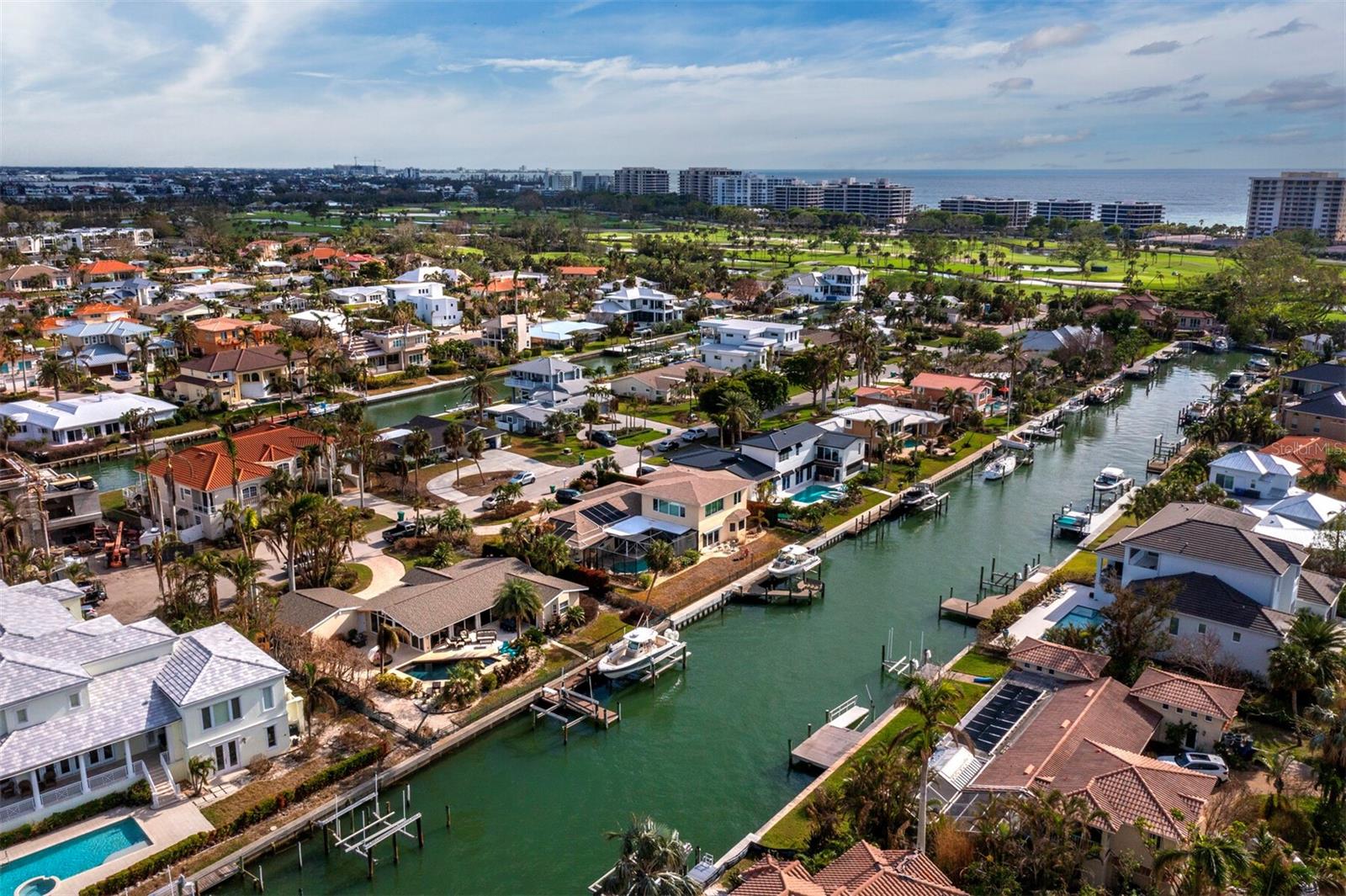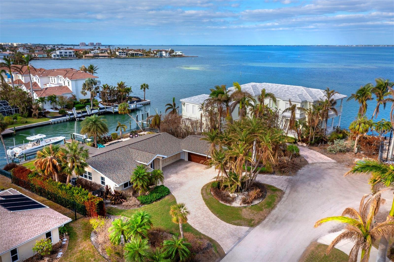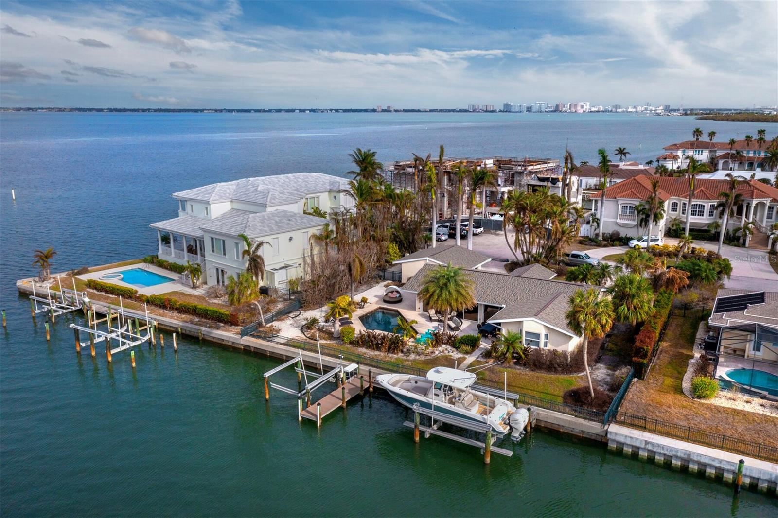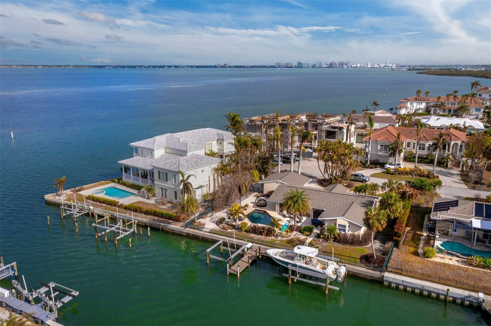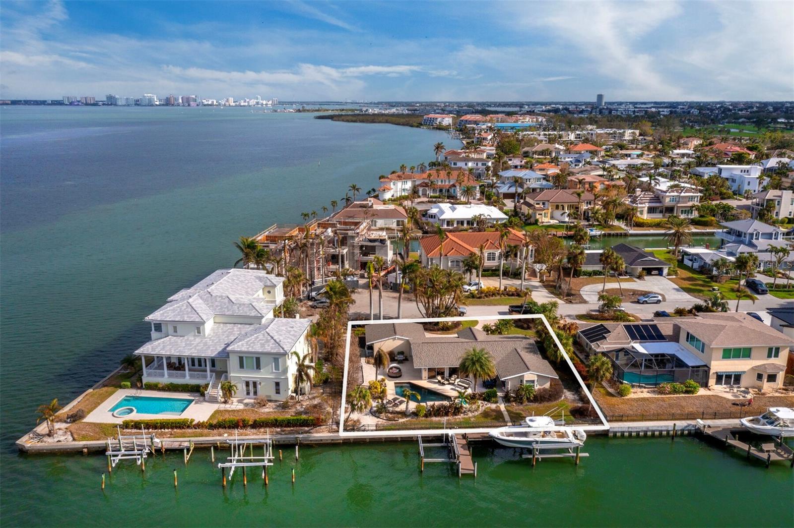 Localizada na procurada comunidade Country Club Shores, no extremo sul de Longboat Key, esta casa 3BR e 2BA à beira-mar oferece vistas deslumbrantes da baía, design contemporâneo e capacidades de navegação excepcionais. Posicionada a apenas um lote do final da península, a propriedade possui 103' de orla marítima direta, tornando-a ideal para os entusiastas da água. Country Club Shores é conhecido por seus canais pitorescos, casas à beira-mar e acesso à praia, tornando-o um destino privilegiado para quem gosta de passeios de barco, passeios na praia e um estilo de vida costeiro vibrante. Sua proximidade com St. Armands Circle, centro de Sarasota e praias de classe mundial do Golfo oferece acesso conveniente a restaurantes sofisticados, boutiques, atrações culturais e recreação ao ar livre. Uma pavimentação circular com paisagismo maduro leva à entrada, onde portas duplas de vidro com chumbo se abrem para uma espaçosa área de estar. A grande sala possui tetos abobadados embutidos com iluminação embutida e piso de travertino por toda parte. Uma parede de vidro preenche o espaço com luz natural e emoldura vistas serenas do mar, perfeitas para relaxar ou se divertir. A cozinha está bem equipada com bancadas em granito, eletrodomésticos em aço inoxidável, armários de madeira e balcão para café da manhã. A suíte principal oferece controles deslizantes para a área da piscina, um amplo closet e um banheiro reformado com pia flutuante, box amplo e banheira independente. Os quartos de hóspedes são elegantes e confortáveis. O espaço externo é um verdadeiro retiro à beira-mar, com piscina de água salgada, frente direta para a água e dois elevadores para barcos (24.000 libras e 10.000 libras). Com fácil acesso ao Golfo através do New Pass, a propriedade pode acomodar um barco de até 70 pés, tornando-a uma escolha incomparável para os entusiastas da navegação. Esta casa oferece o melhor do sul de Longboat Key, vivendo em uma comunidade onde os residentes desfrutam de um estilo de vida descontraído na ilha, cercado por comodidades excepcionais. Quer pretenda desfrutar da casa existente ou construir a residência dos seus sonhos à beira-mar, esta propriedade oferece uma oportunidade extraordinária numa localização ideal.