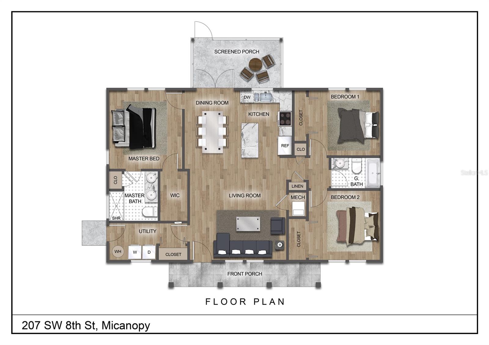 Em construção. NOVA Construção com atenção aos detalhes, joia de 3 quartos/2 banheiros com carvalhos revestindo a propriedade de meio acre e informando a Tangerine Street de Micanopy. Eleita uma das "10 melhores cidades pequenas da Flórida" pela revista Travel + Leisure (fevereiro de 2023), Micanopy manteve a sensação de cidade antiga, onde os vizinhos acenam uns para os outros, o ritmo é lento e os negócios locais adoçam o charme da cidade. Desfrute de caminhar pelas ruas ladeadas por velhos carvalhos e magnólias. “A cidade que o tempo esqueceu”, a cidade mais antiga do interior da Flórida é como voltar no tempo. Conhecida por suas lojas de antiguidades, Blue Highway Pizza, Pearl's BBQ e Mosswood Farm Store & Bakehouse. Micanopy também abriga o Paynes Prairie State Park e o Price's Scrub State Park, onde você pode ver regularmente cavalos selvagens, bisões, guindastes e crocodilos (é claro). Se você está procurando uma NOVA casa com conveniências modernas enquanto mora na "cidade que o tempo esqueceu" a apenas 15 minutos de carro de Gainesville, então esta é a casa para você! Esta casa possui dois vitrais patrióticos personalizados em cada extremidade da casa, uma planta aberta com teto abobadado, muitas janelas para ótima luz natural, uma varanda nos fundos e uma varanda frontal aberta, estacionamento com carregamento de veículos elétricos, conexões para gerador, design de eficiência energética, tetos de 9' e sala de estar abobadada, armários de cozinha em madeira maciça com bancadas em granito e uma grande ilha com assentos. Aparelhos GE de aço inoxidável totalmente novos, ventiladores de teto Hunter, encanamentos delta e uma lavanderia separada com armário de armazenamento. O quarto principal é separado dos outros quartos e possui teto falso, closet, pia dupla e chuveiro personalizado com azulejos preto e branco. Parece muito maior do que 1.241 pés quadrados.